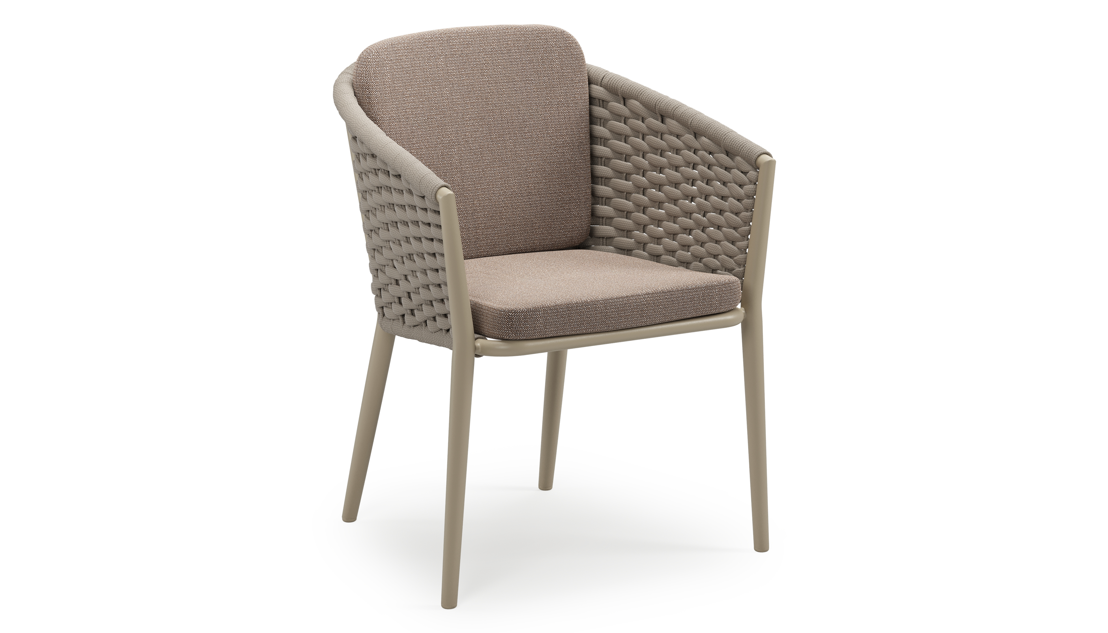 Orso stapelbare tuinstoel in beige aluminium en beige horizontaal geweven ronde rope met stoelkussen in All Weather Sunbrella® Luxe Savane Earth | Exterioo tuinmeubelen