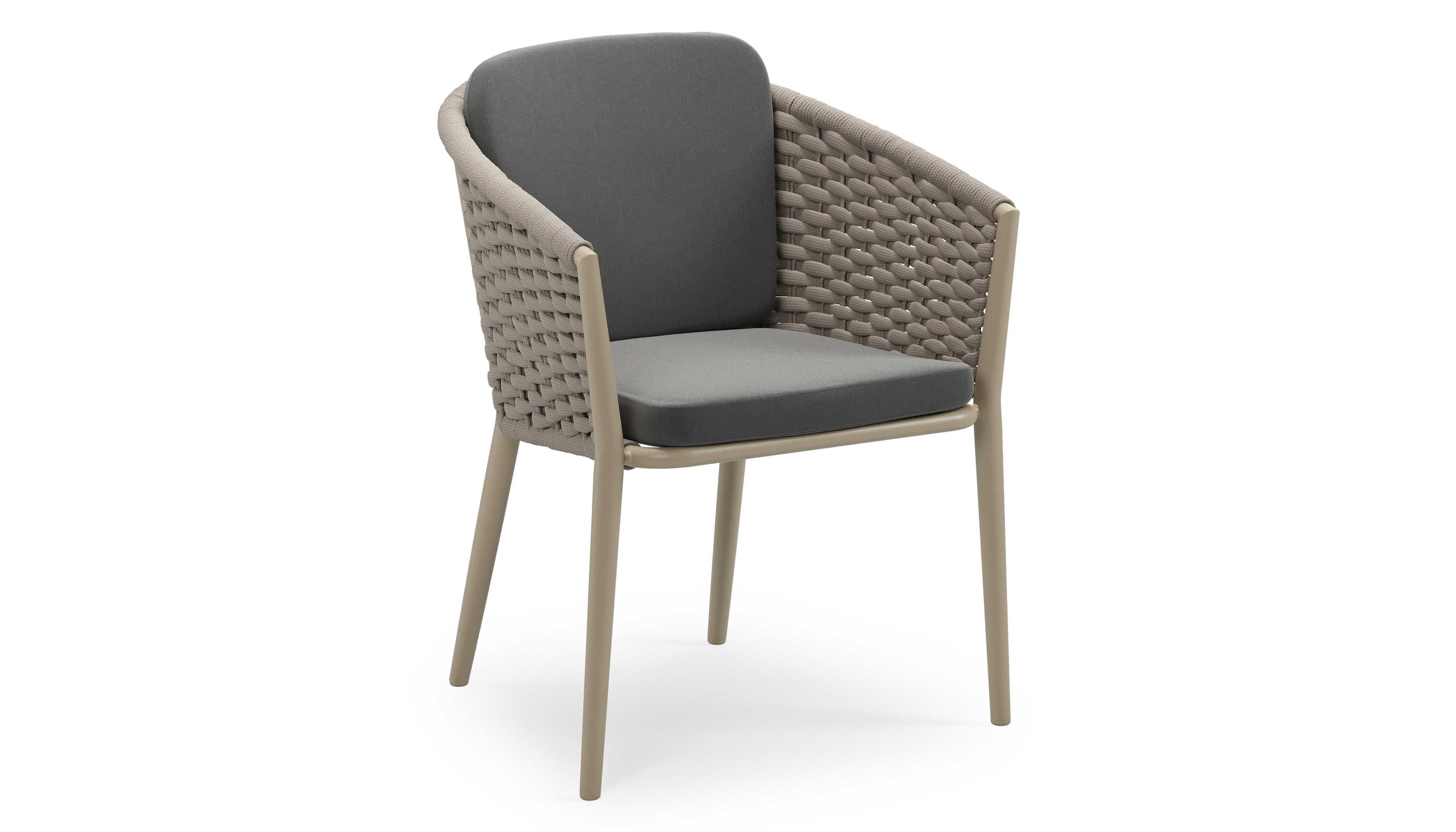 Orso stapelbare tuinstoel in beige aluminium en beige horizontaal geweven ronde rope met stoelkussen in All Weather Sunbrella® Luxe Natte Charcoal Chine | Exterioo tuinmeubelen