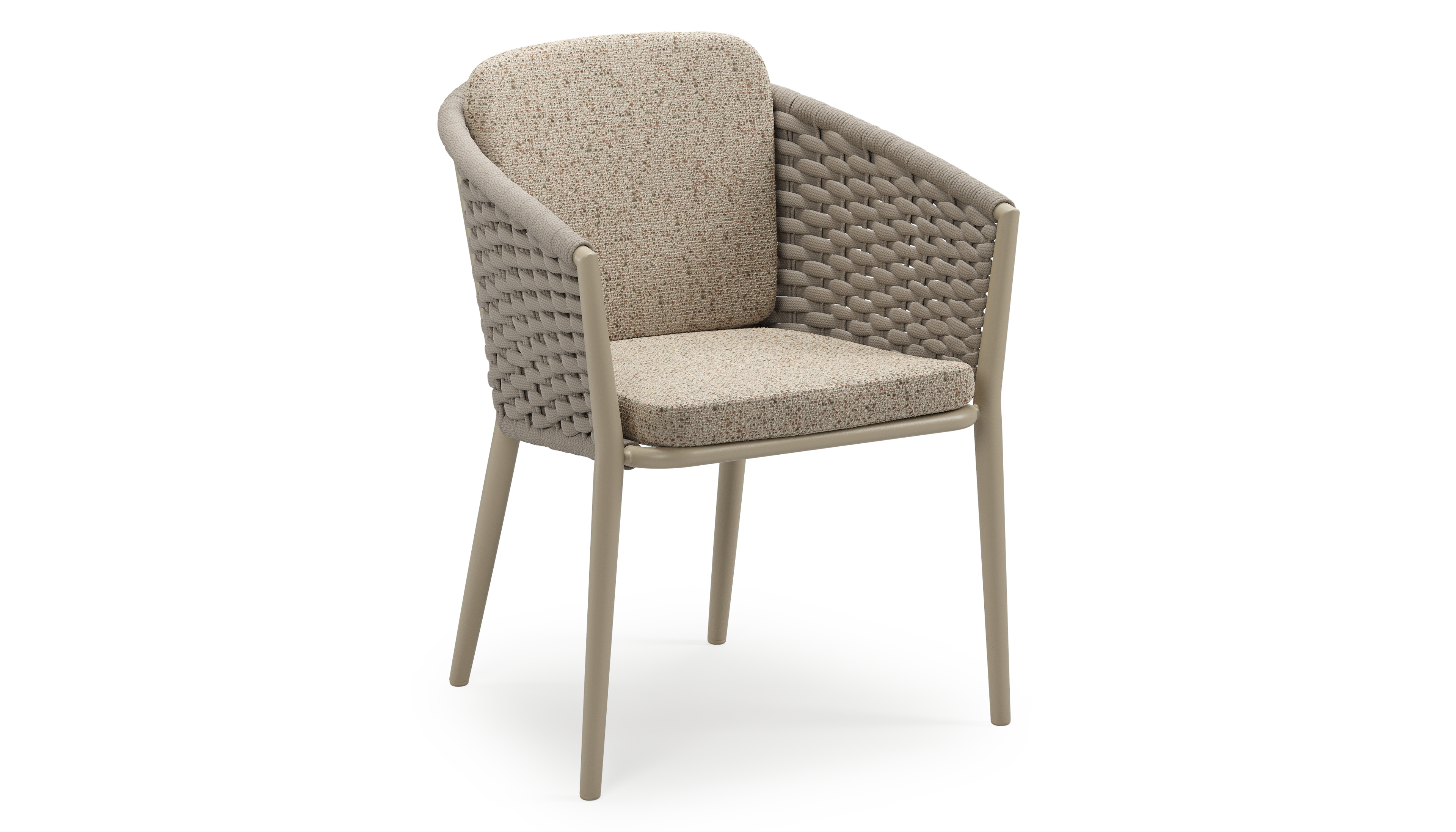 Orso stapelbare tuinstoel in beige aluminium en beige horizontaal geweven ronde rope met stoelkussen in All Weather Cosytica Bora Jungle | Exterioo tuinmeubelen