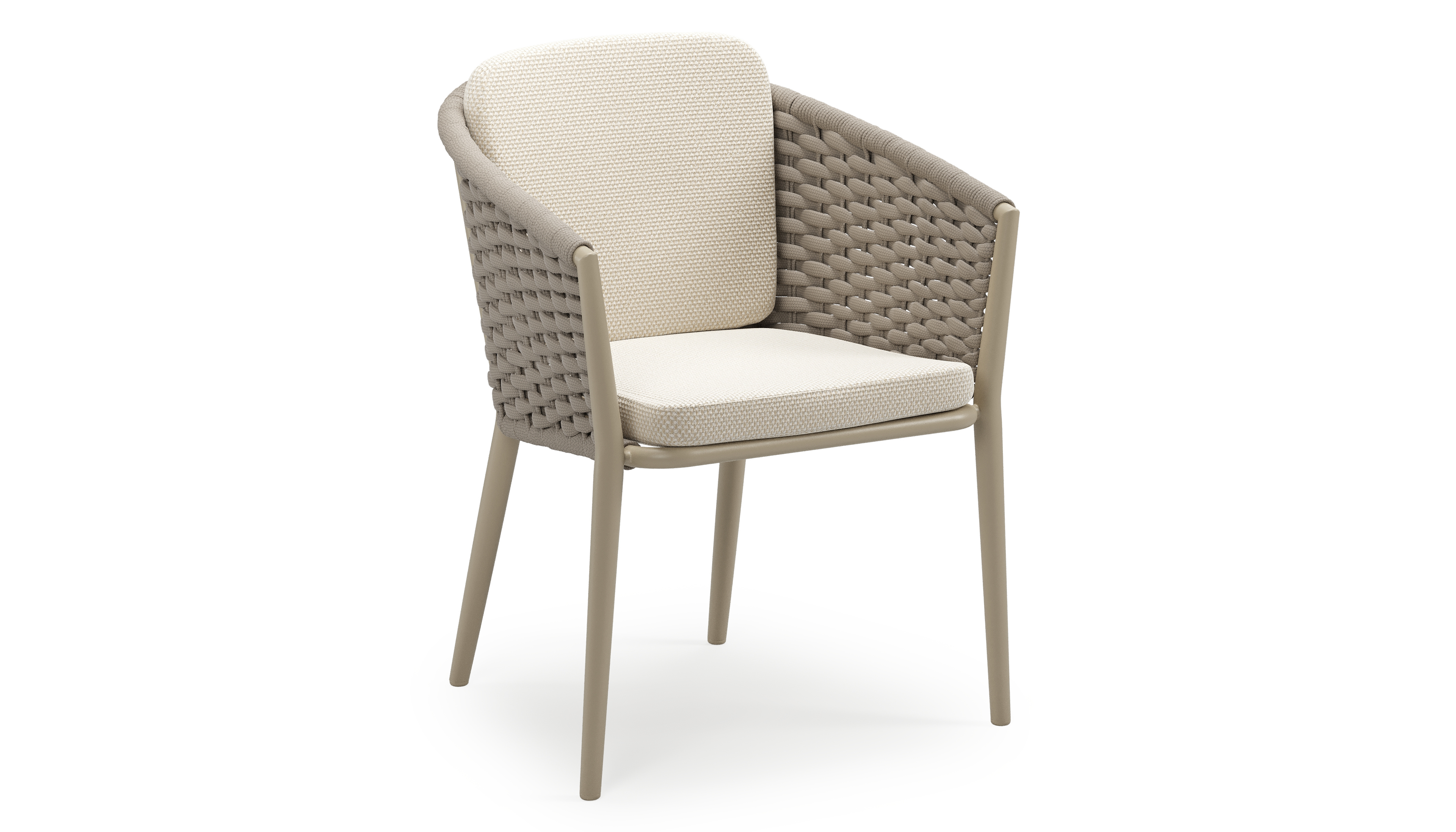 Orso stapelbare tuinstoel in beige aluminium en beige horizontaal geweven ronde rope met stoelkussen in All Weather Cosytica Althea Off White | Exterioo tuinmeubelen