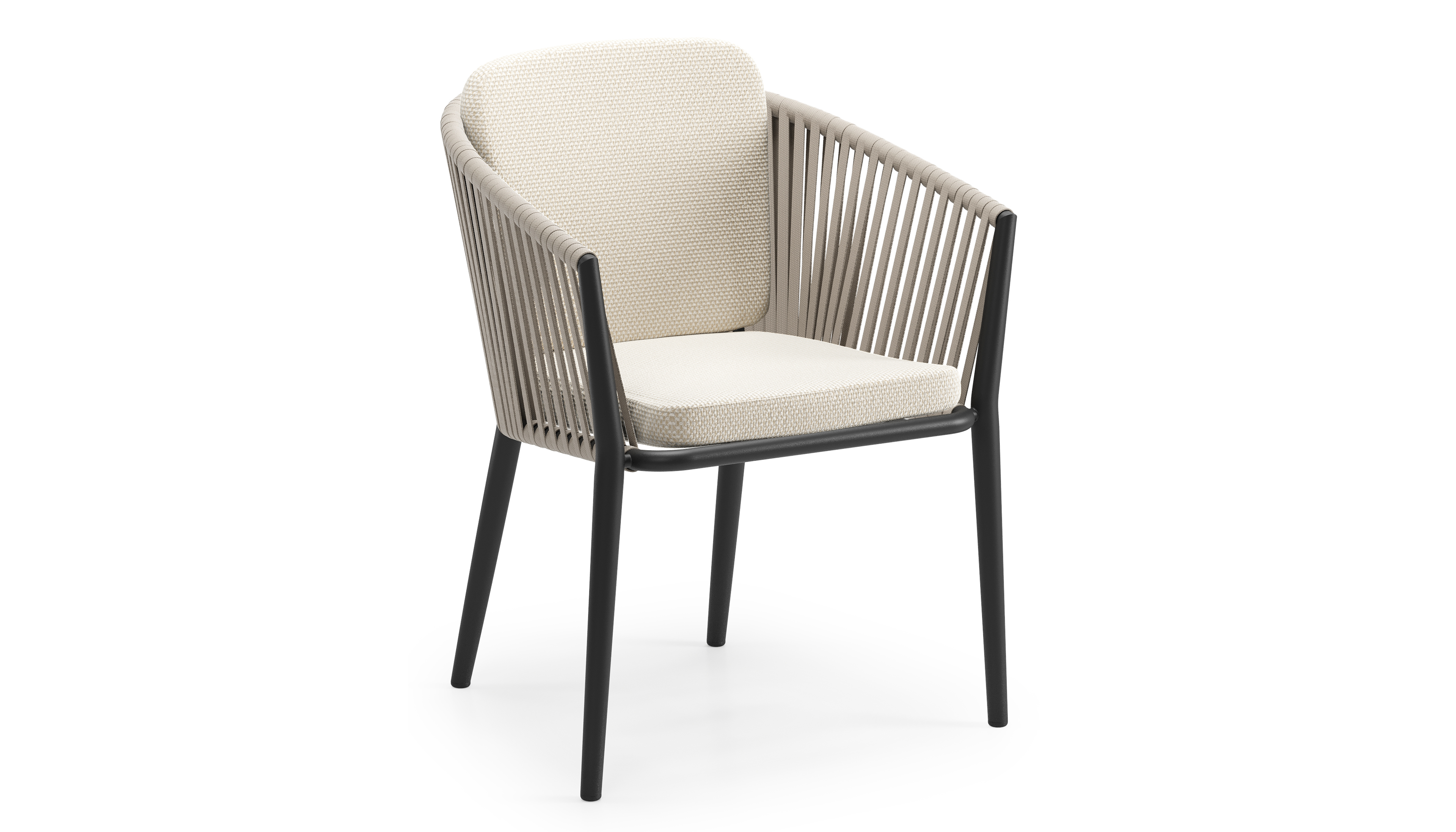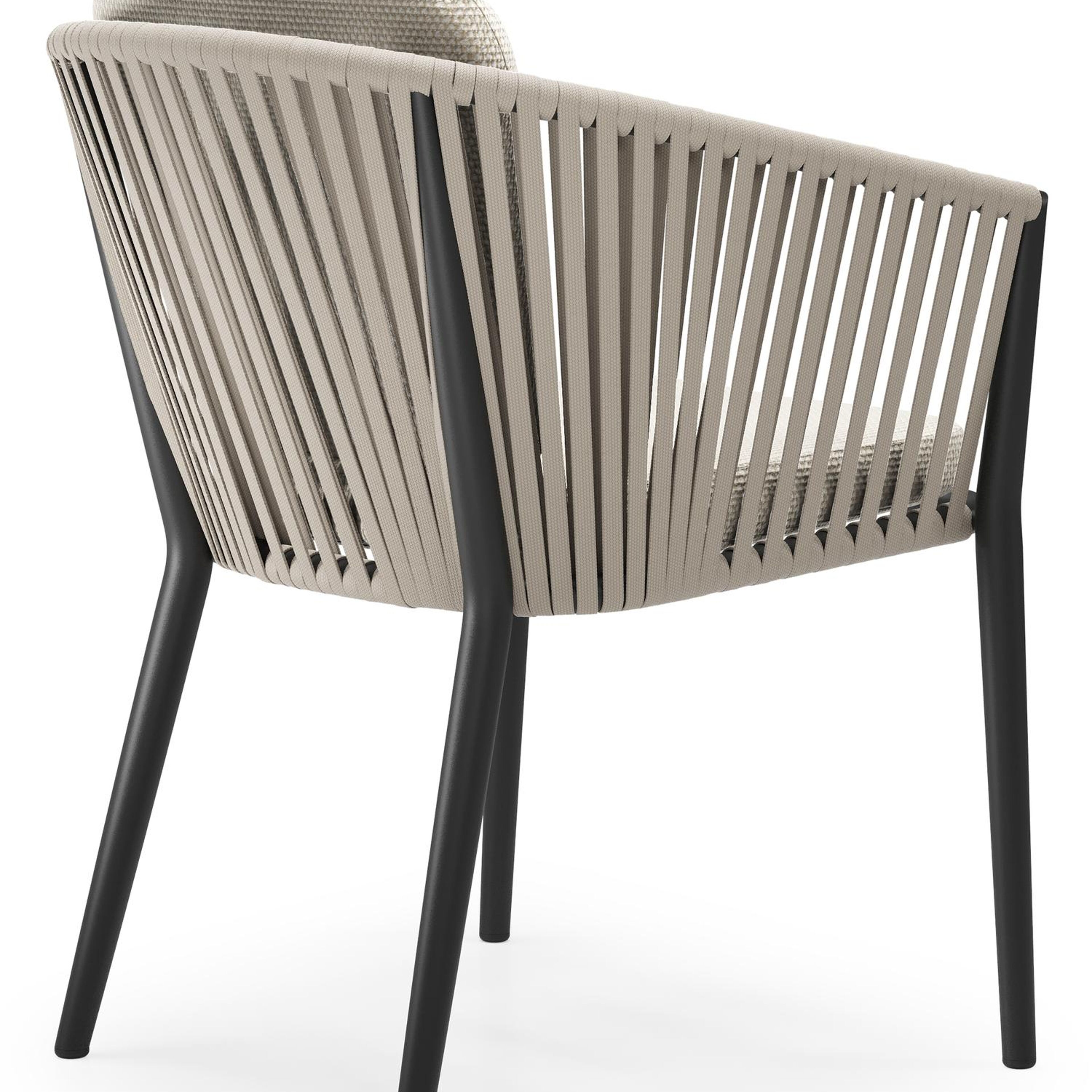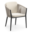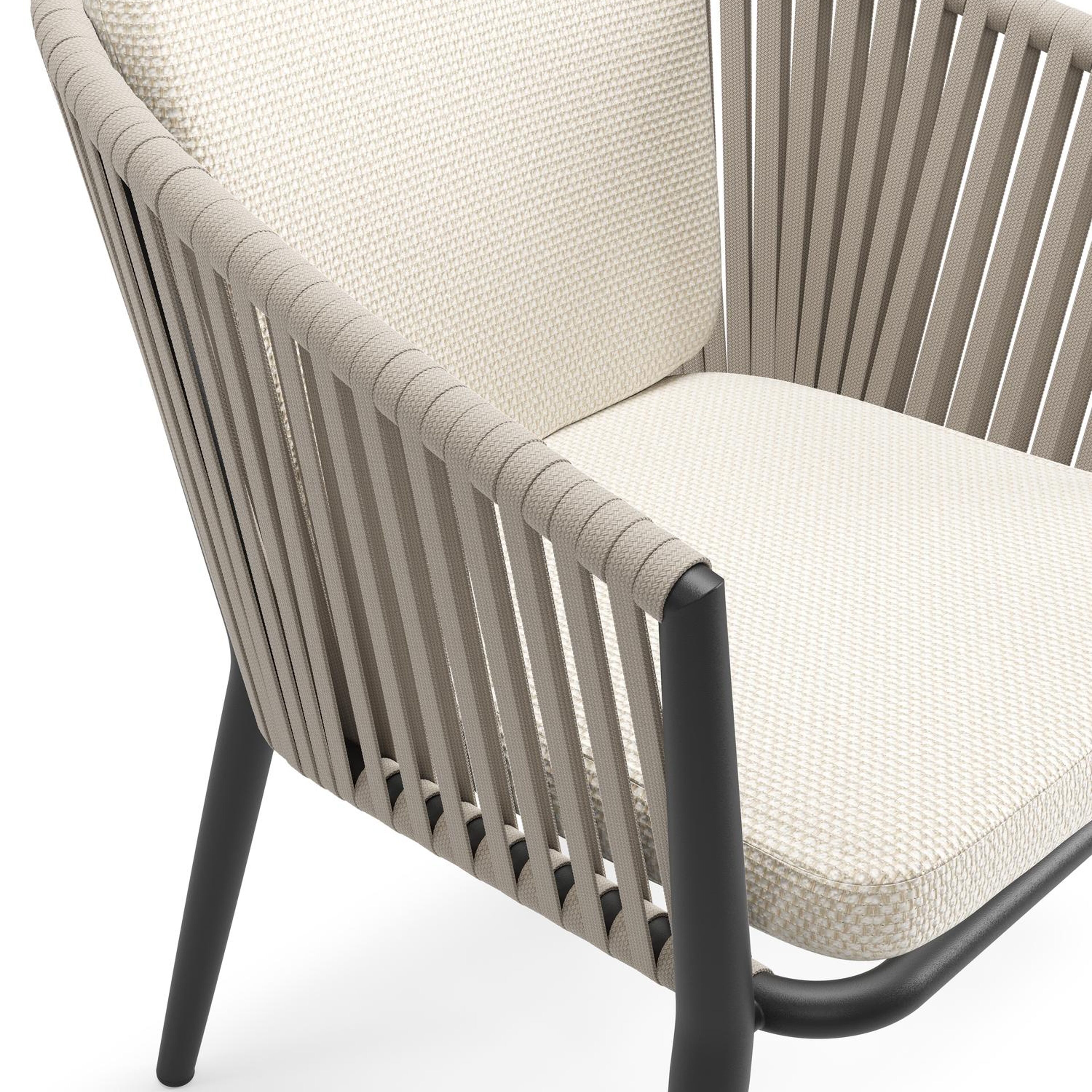Orso tuinstoel in zwart aluminium en beige verticaal geweven vlakke rope met zitkussen in All Weather Cosytica Althea Off White | Exterioo tuinmeubelen