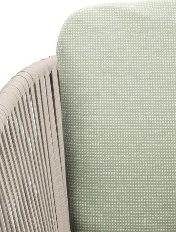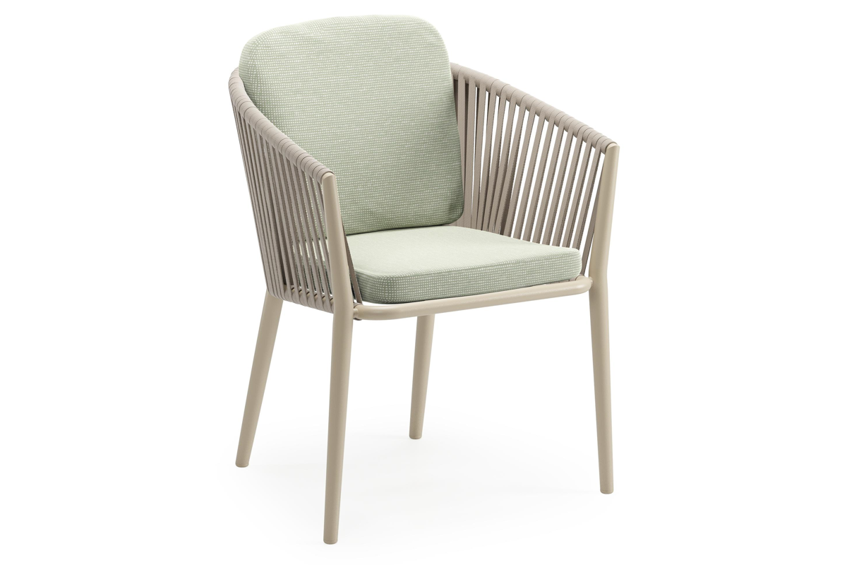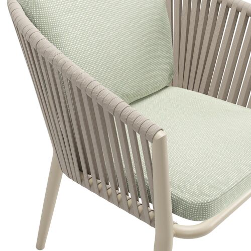 Orso tuinstoel in beige aluminium en beige verticaal geweven vlakke rope met luxe zitkussen in All Weather Sunbrella® Luxe Slow Spirea | Exterioo