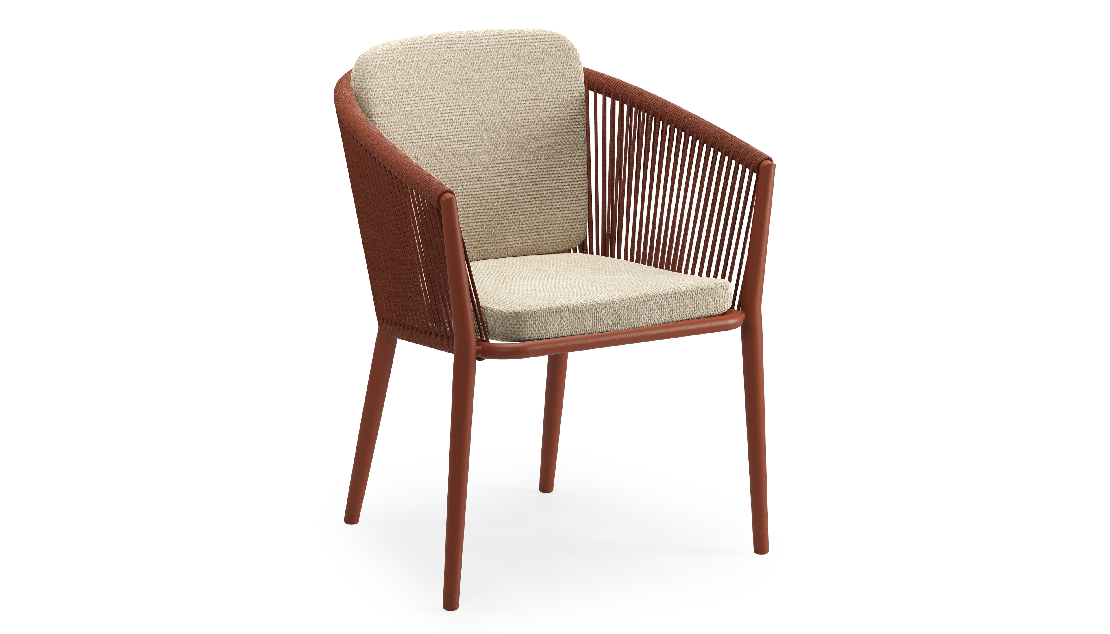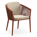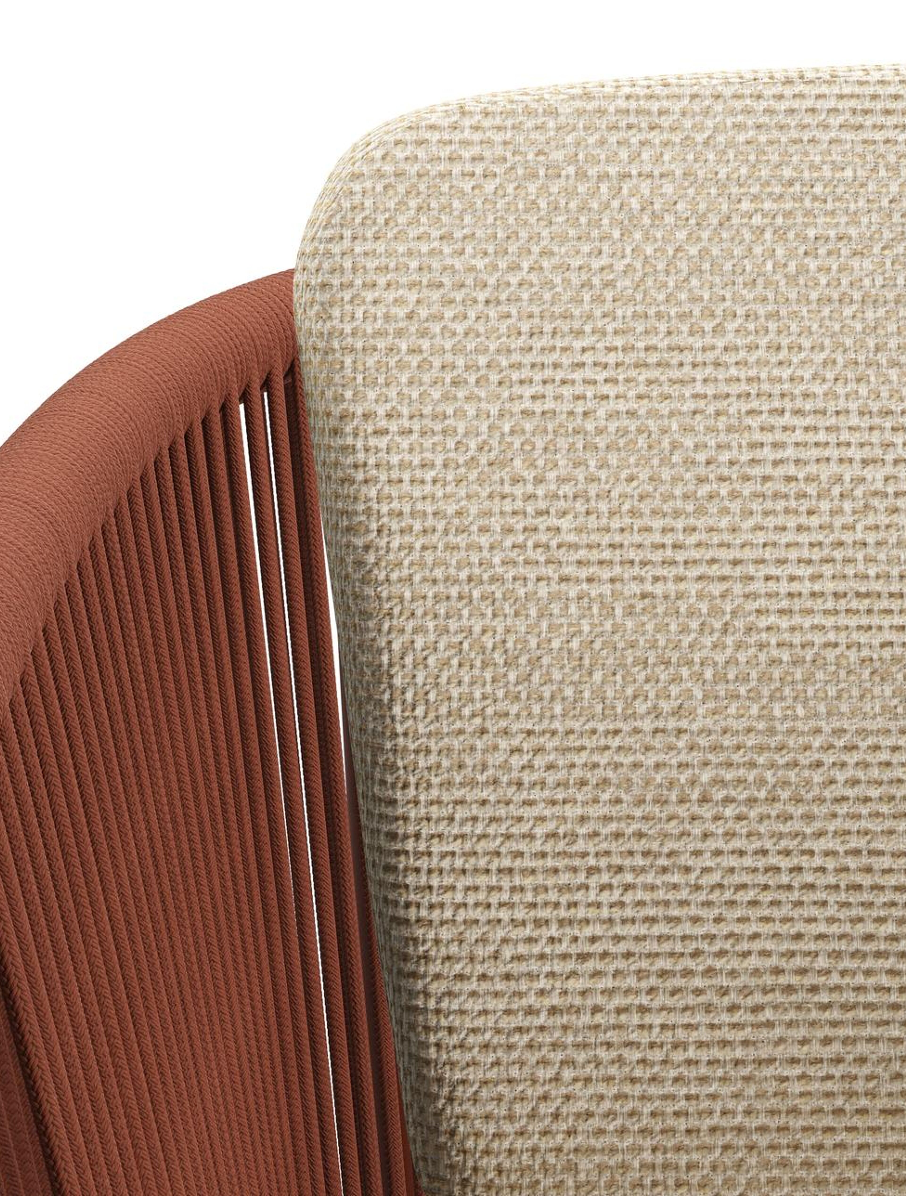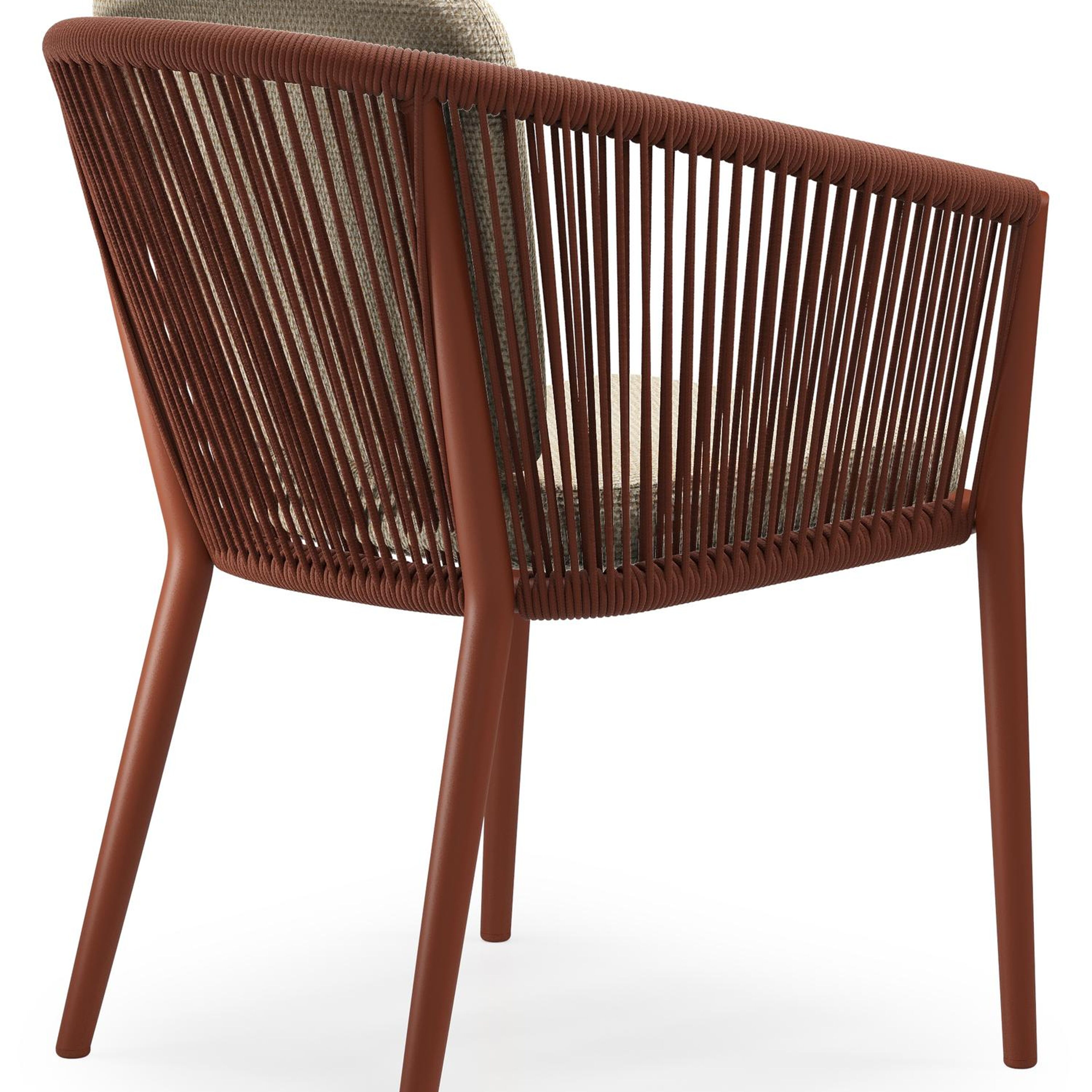 Orso tuinstoel in roestbruin aluminium en roestbruin verticaal geweven ronde rope met zitkussen in All Weather Cosytica Althea Camel | Exterioo tuinmeubelen