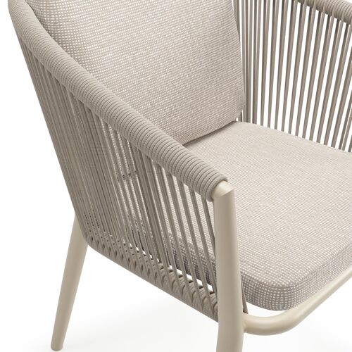 Orso tuinstoel in beige aluminium en beige verticaal geweven ronde rope met luxe zitkussen in All Weather Sunbrella® Luxe Slow Farafra | Exterioo