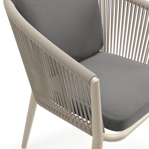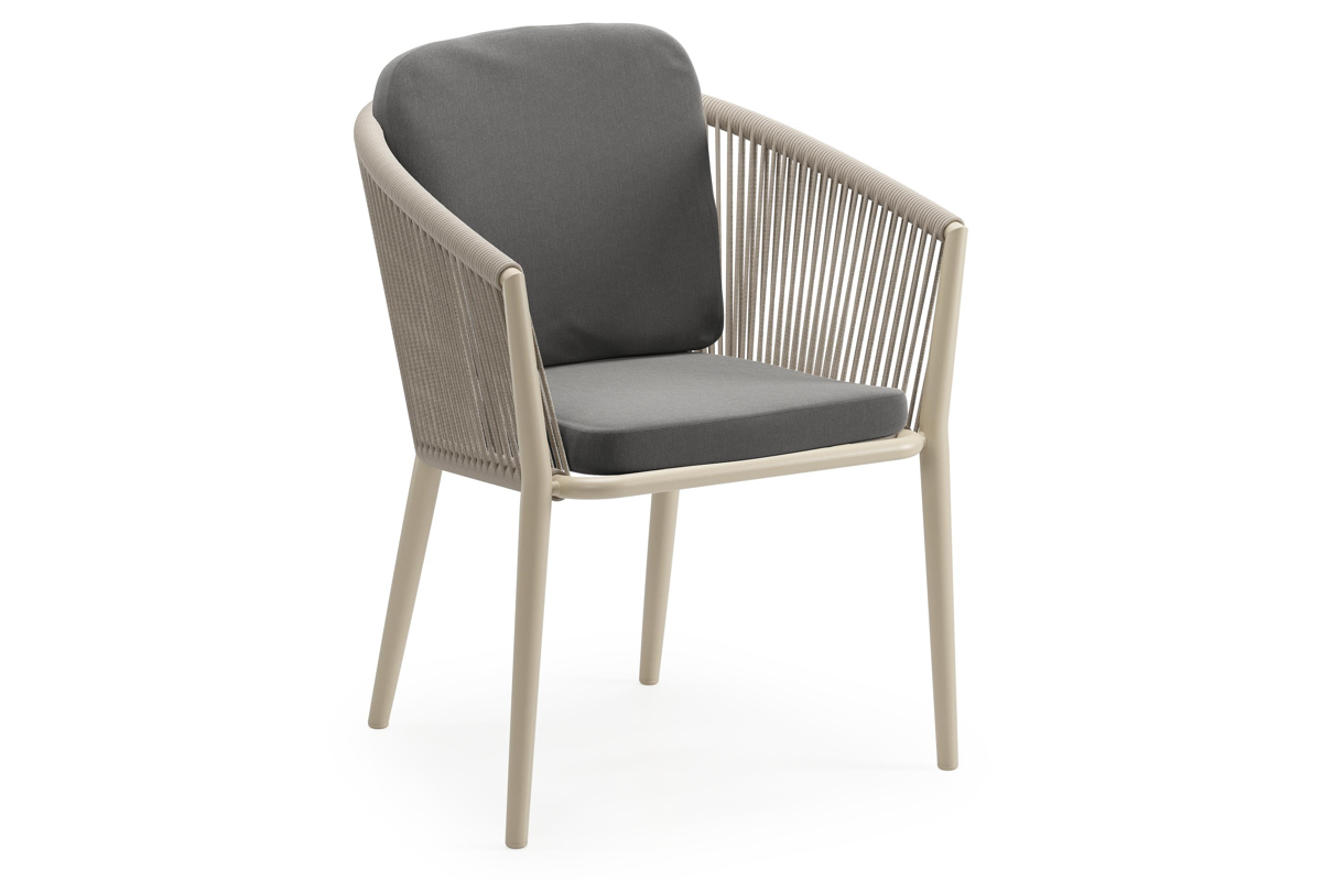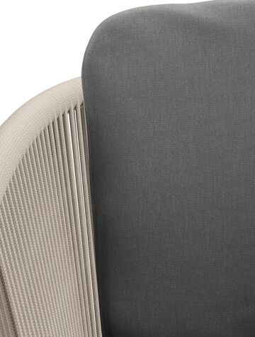 Orso tuinstoel in beige aluminium en beige verticaal geweven ronde rope met luxe zitkussen in All Weather Sunbrella® Luxe Natte Charcoal Chine | Exterioo