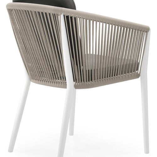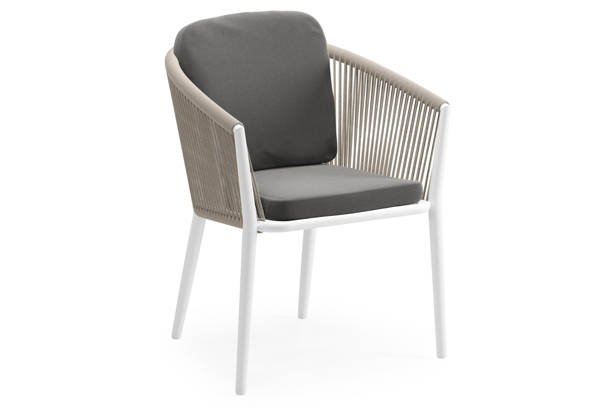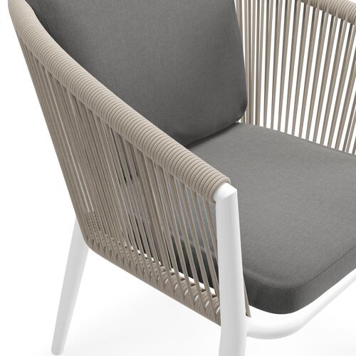 Orso tuinstoel in wit aluminium en beige verticaal geweven ronde rope met luxe zitkussen in All Weather Sunbrella® Luxe Natte Charcoal Chine | Exterioo