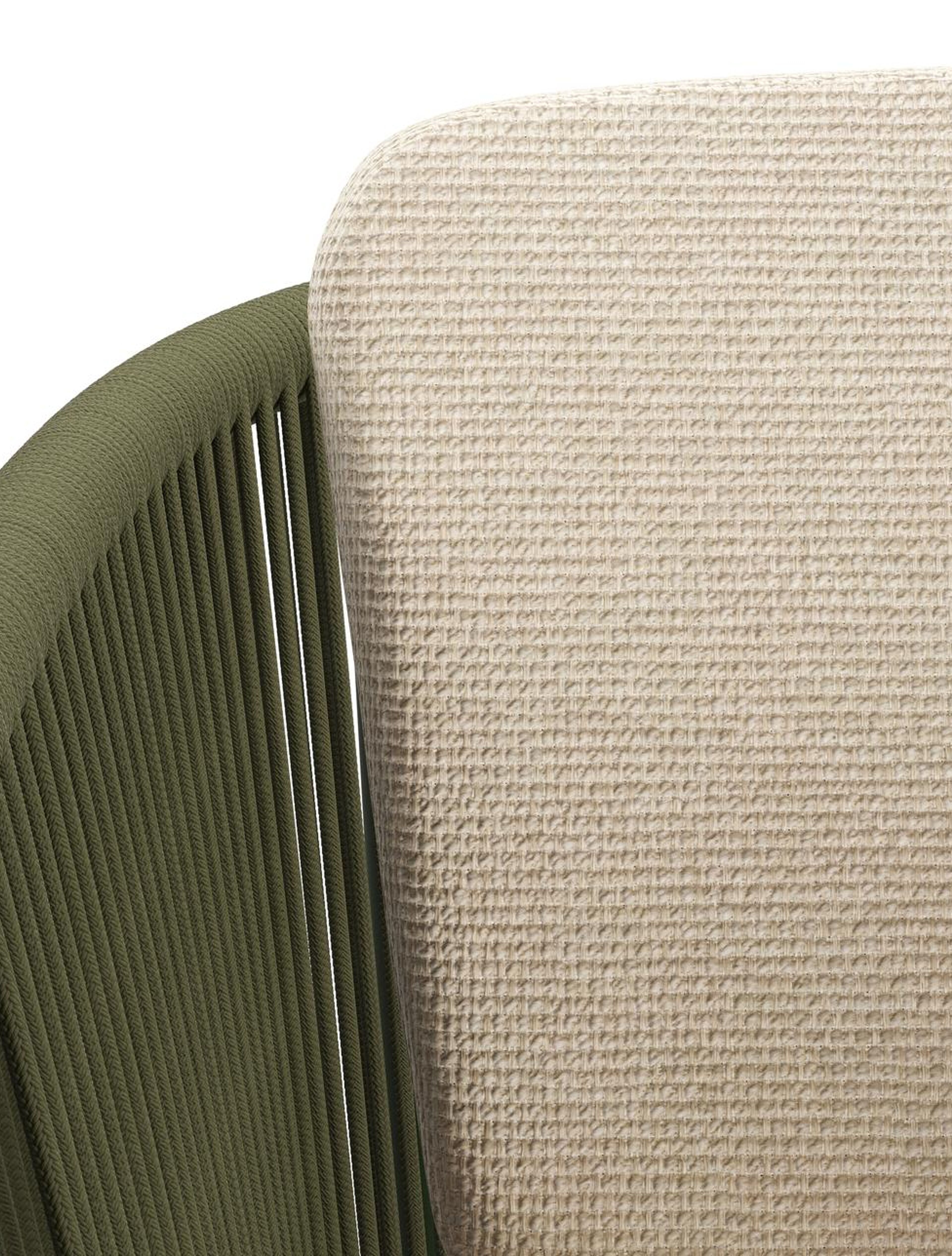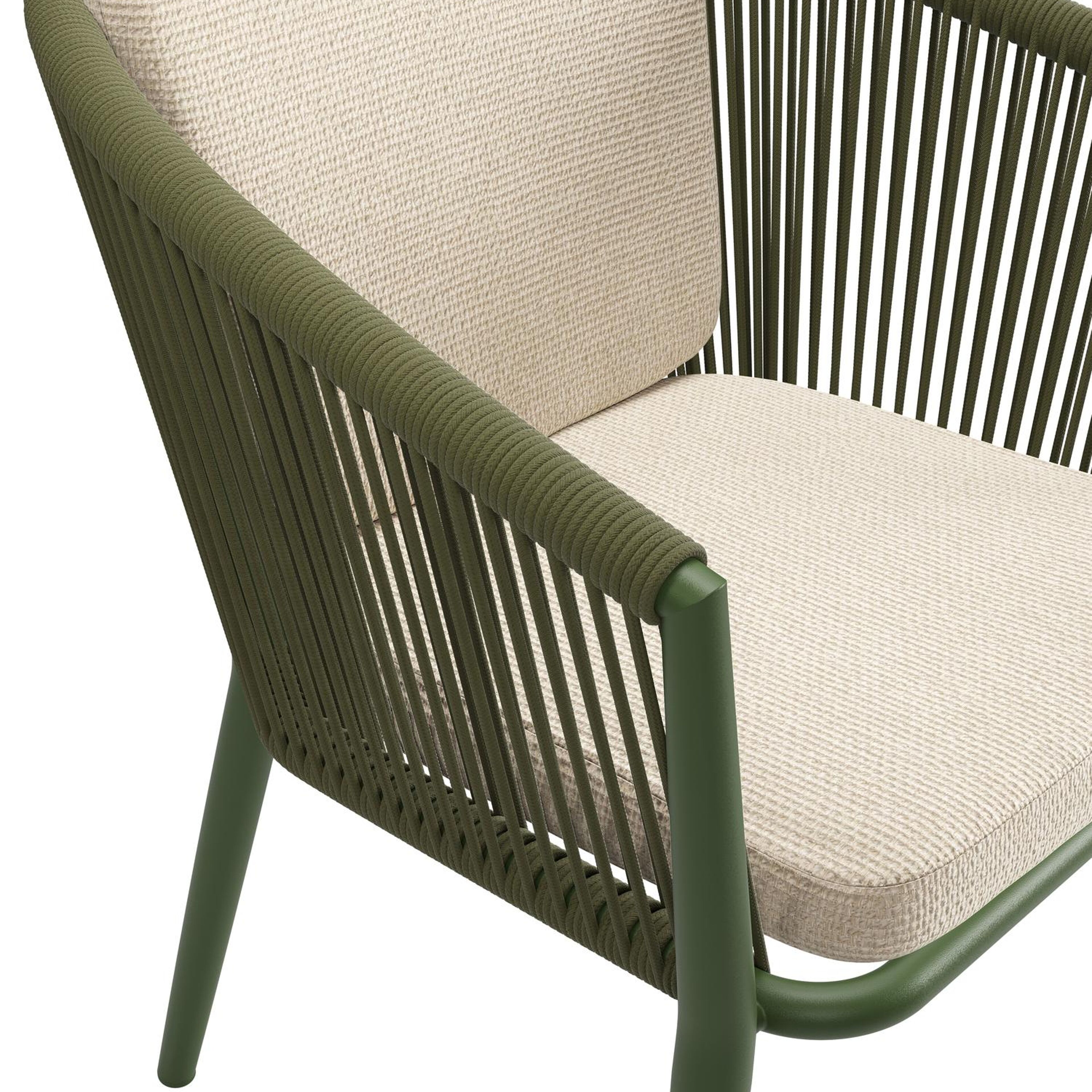 Orso tuinstoel in groen aluminium en groen verticaal geweven ronde rope met zitkussen in All Weather Cosytica Althea Chalk | Exterioo tuinmeubelen