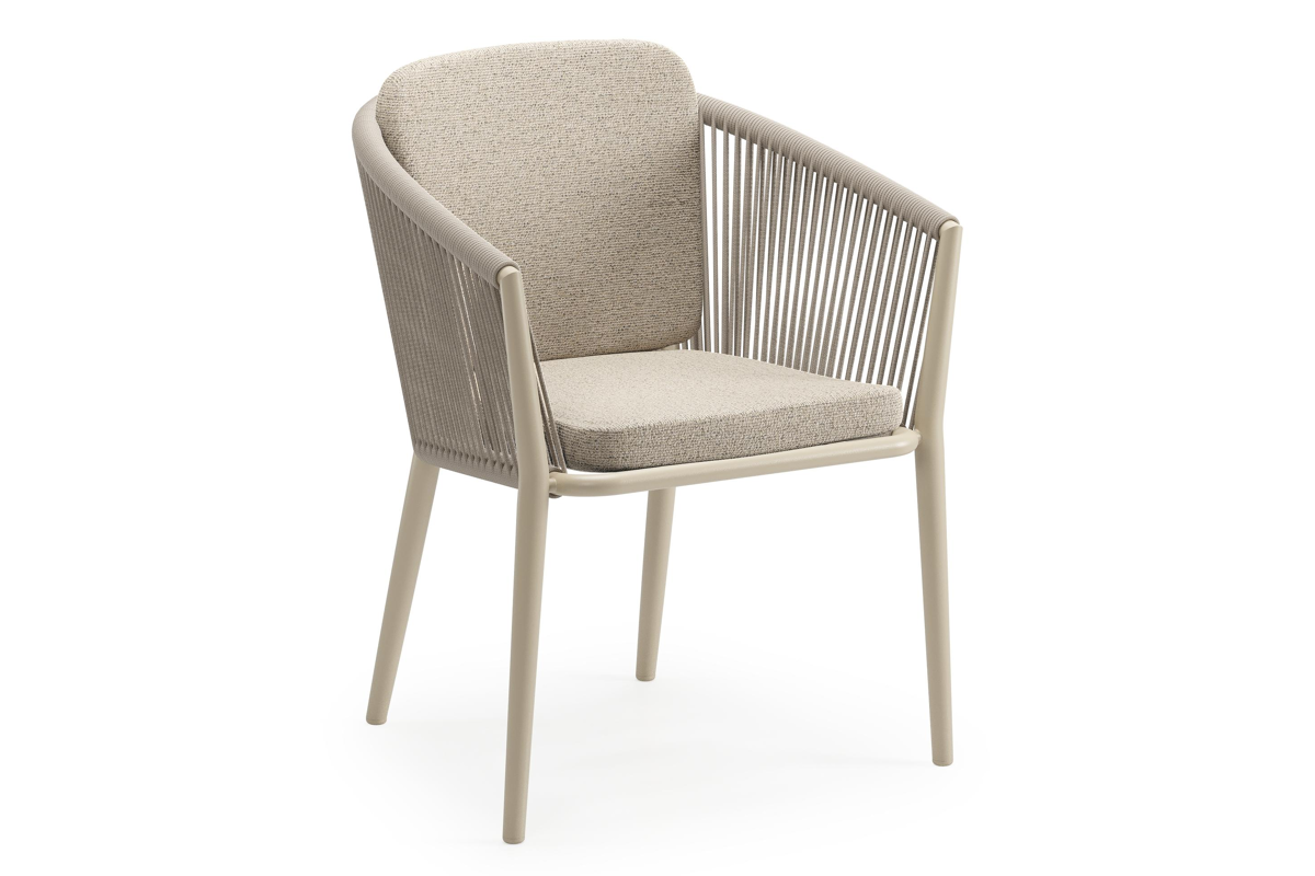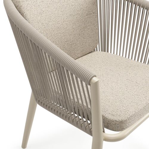 Orso stapelbare tuinstoel in beige aluminium en beige vierkant geweven ronde rope met kussen in All Weather Cosytica Marbella Beige | Exterioo