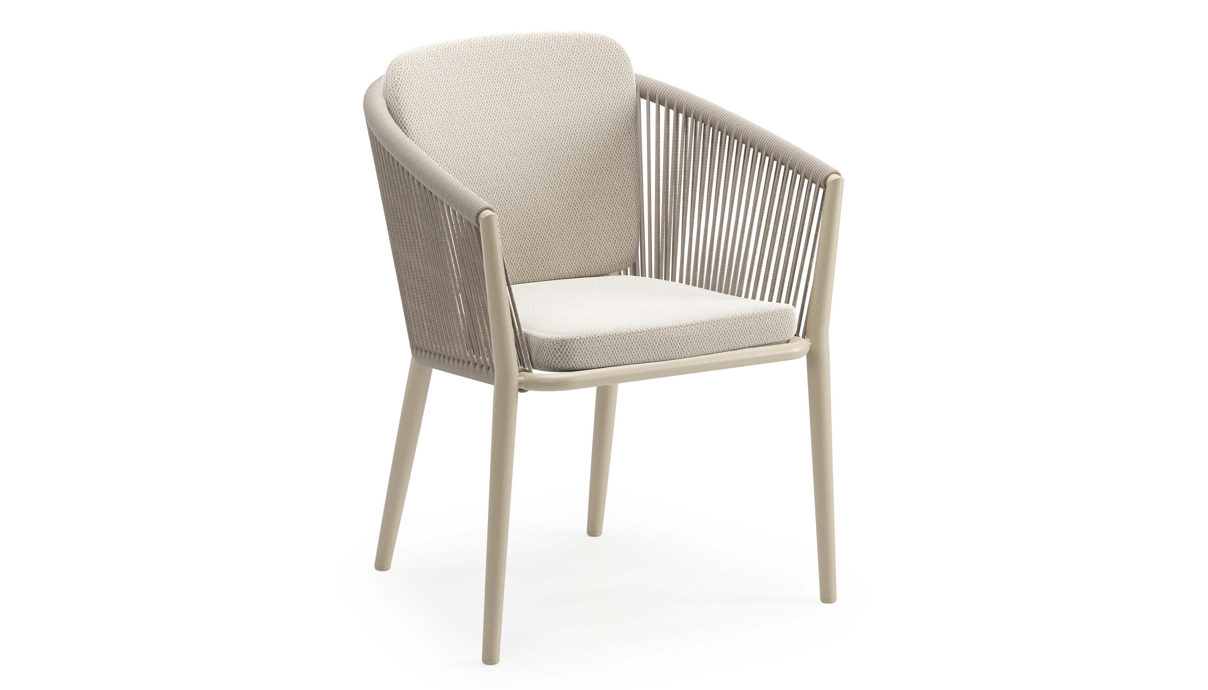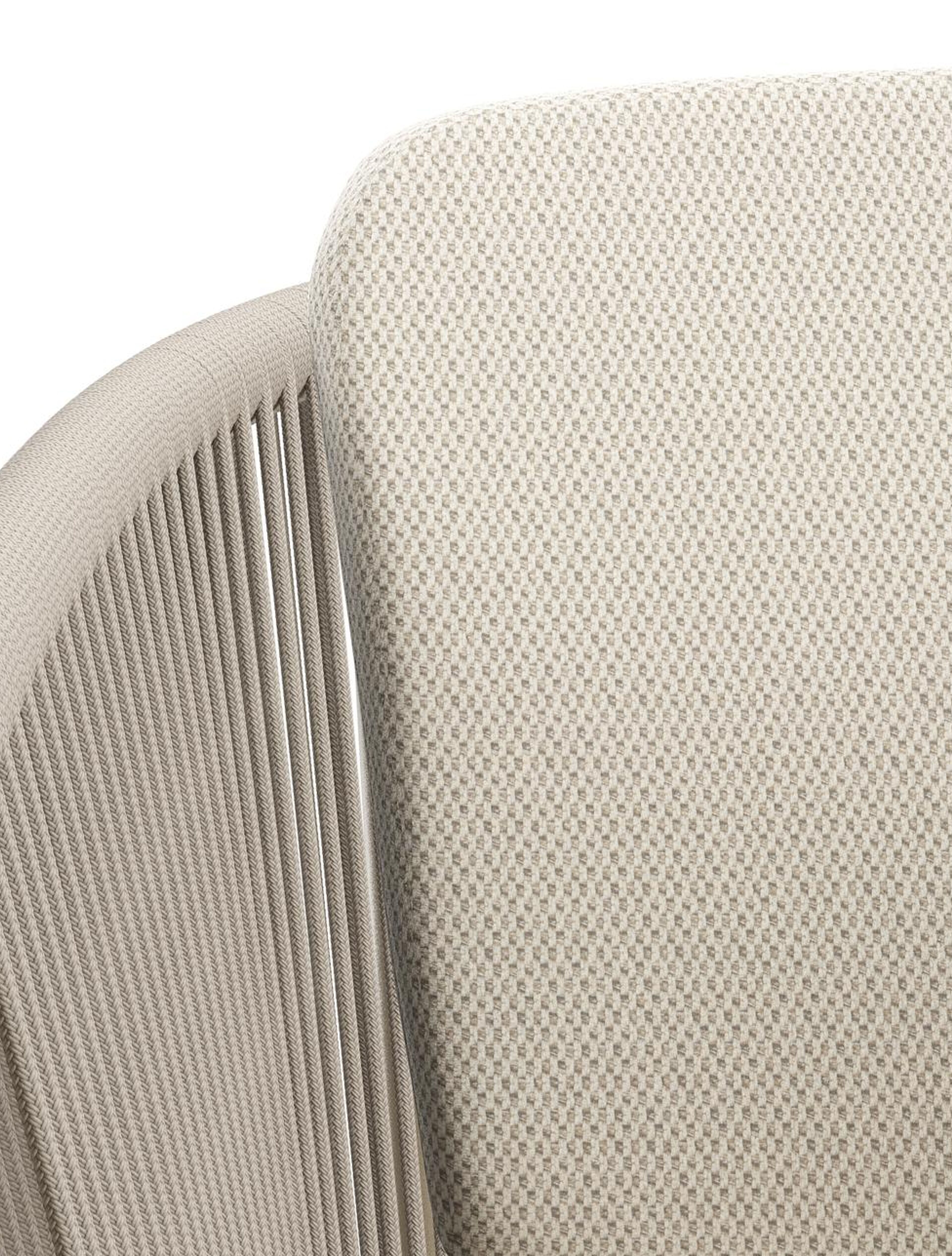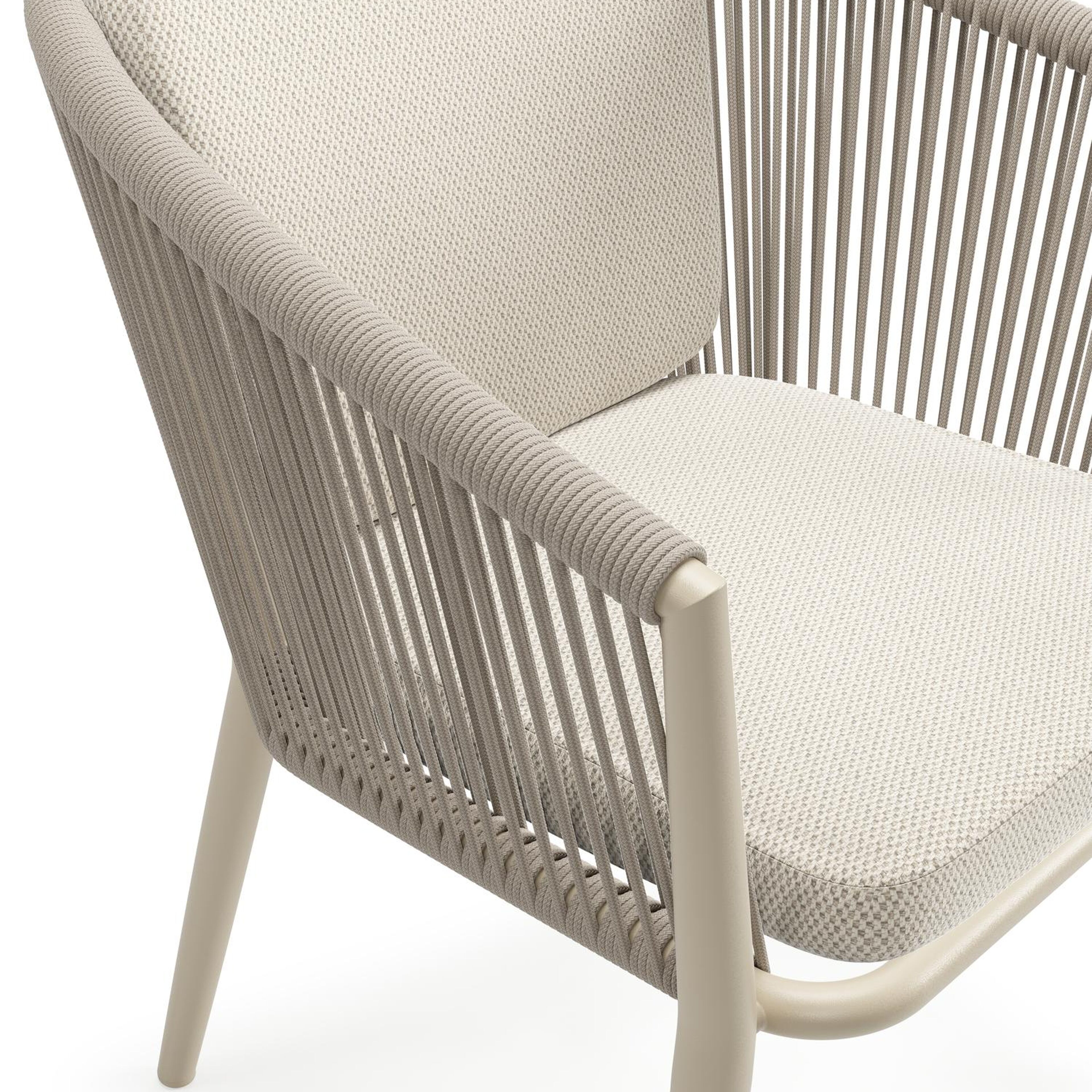 Orso stapelbare tuinstoel in beige aluminium en beige vierkant geweven ronde rope met kussen in All Weather Sunbrella® Luxe Lopi Marble | Exterioo tuinmeubelen