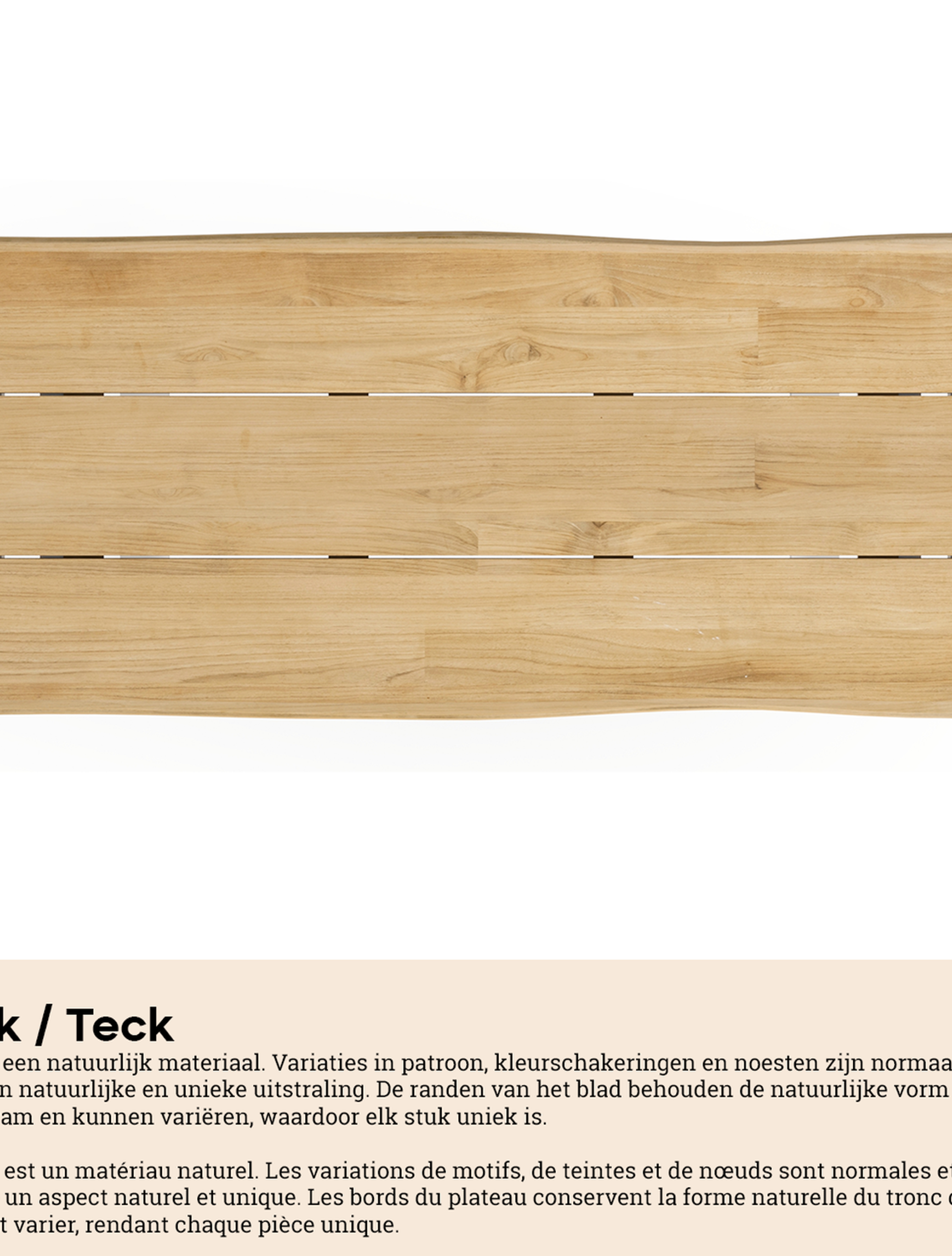 Een tafelblad uit teak staat gelijk aan bijzondere kwaliteit en natuurlijk design. Teak is een kwalitatieve houtsoort gekenmerkt door zijn hardheid. Aangezien hout leeft, kan de structuur of kleur licht anders zijn dan op het beeld weergegeven.