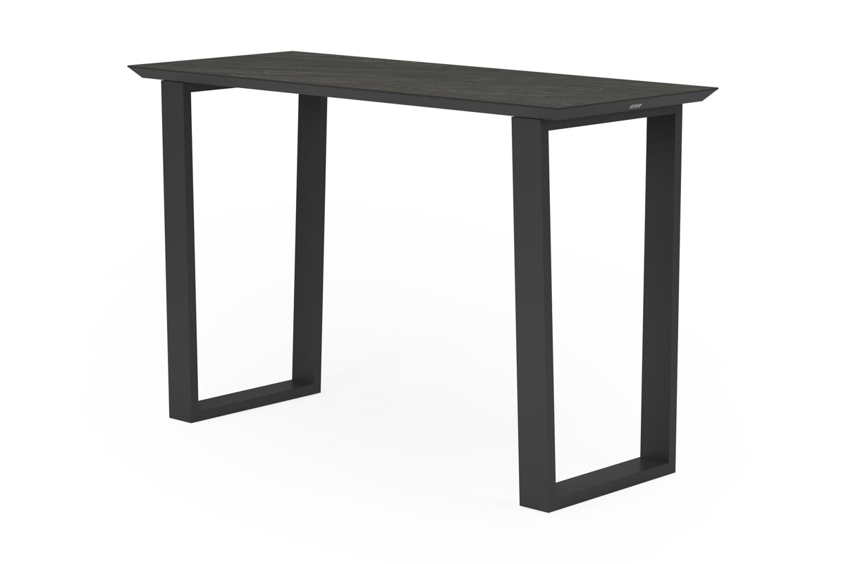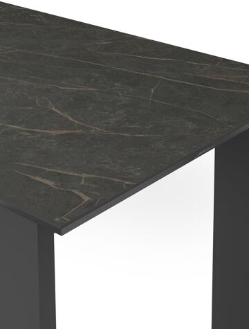 Klaar voor een gezellig apero moment in de tuin? Met de Pagino bartafel doe je dit in stijl. Het frame heeft een uniek trapeziumvormig onderstel en is gemaakt van aluminium. Deze tafel is afgewerkt met een Black Obsession tafelblad. Een echte eyecatcher voor wie het graag iets luxueuzer heeft. De ondergrond van het blad is zwart maar is afgewerkt met een goudgele aders die een prachtige marmerlook creëren. Het voordeel van volkeramische tafelbladen is dat ze krasbestendig zijn en bestand zijn tegen alle weersomstandigheden.