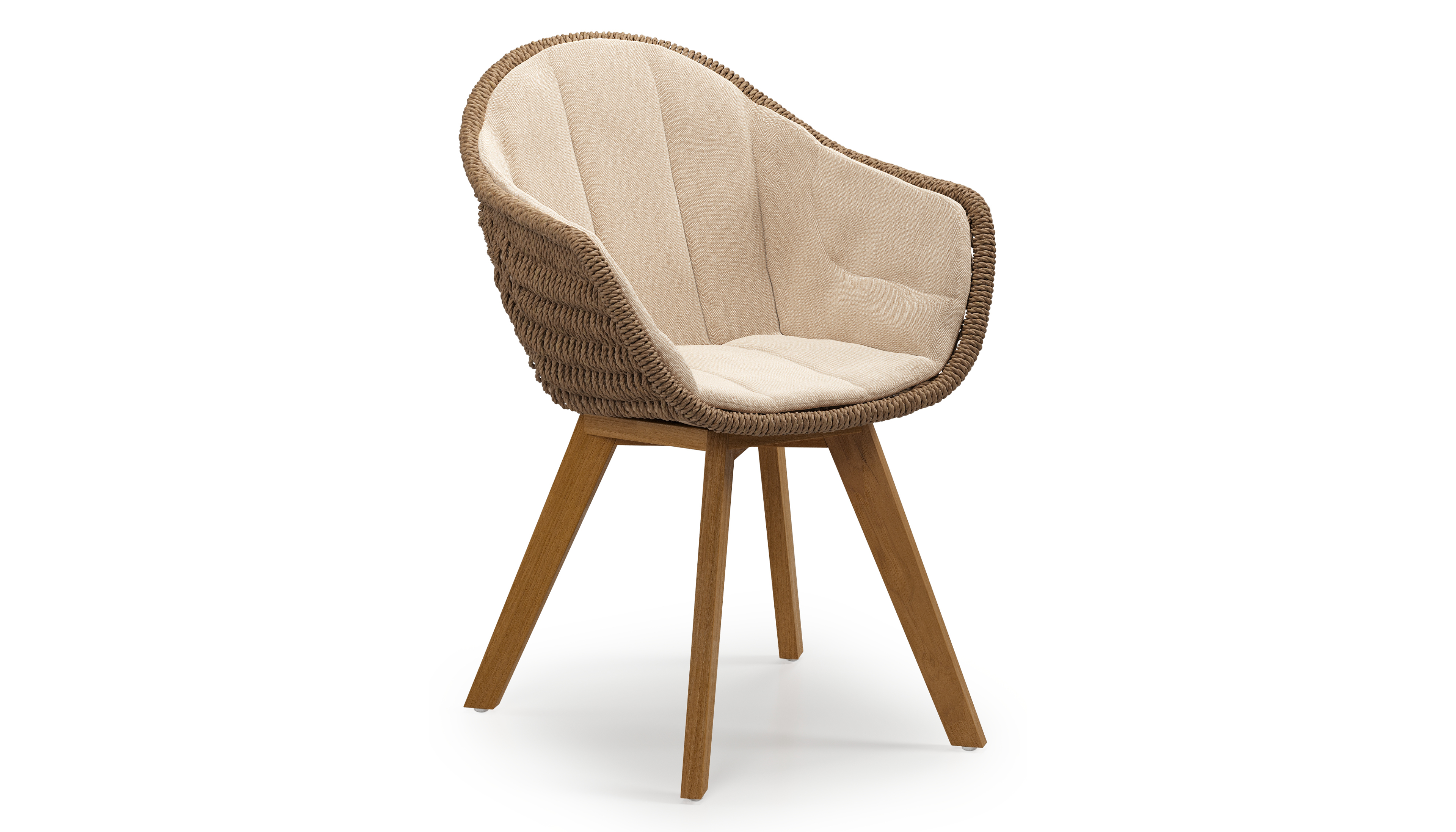 Pagino tuinstoel in teak en bruin ronde wicker met zitkussen in All Weather Sunbrella® Luxe Natte Heather Beige | Exterioo tuinmeubelen