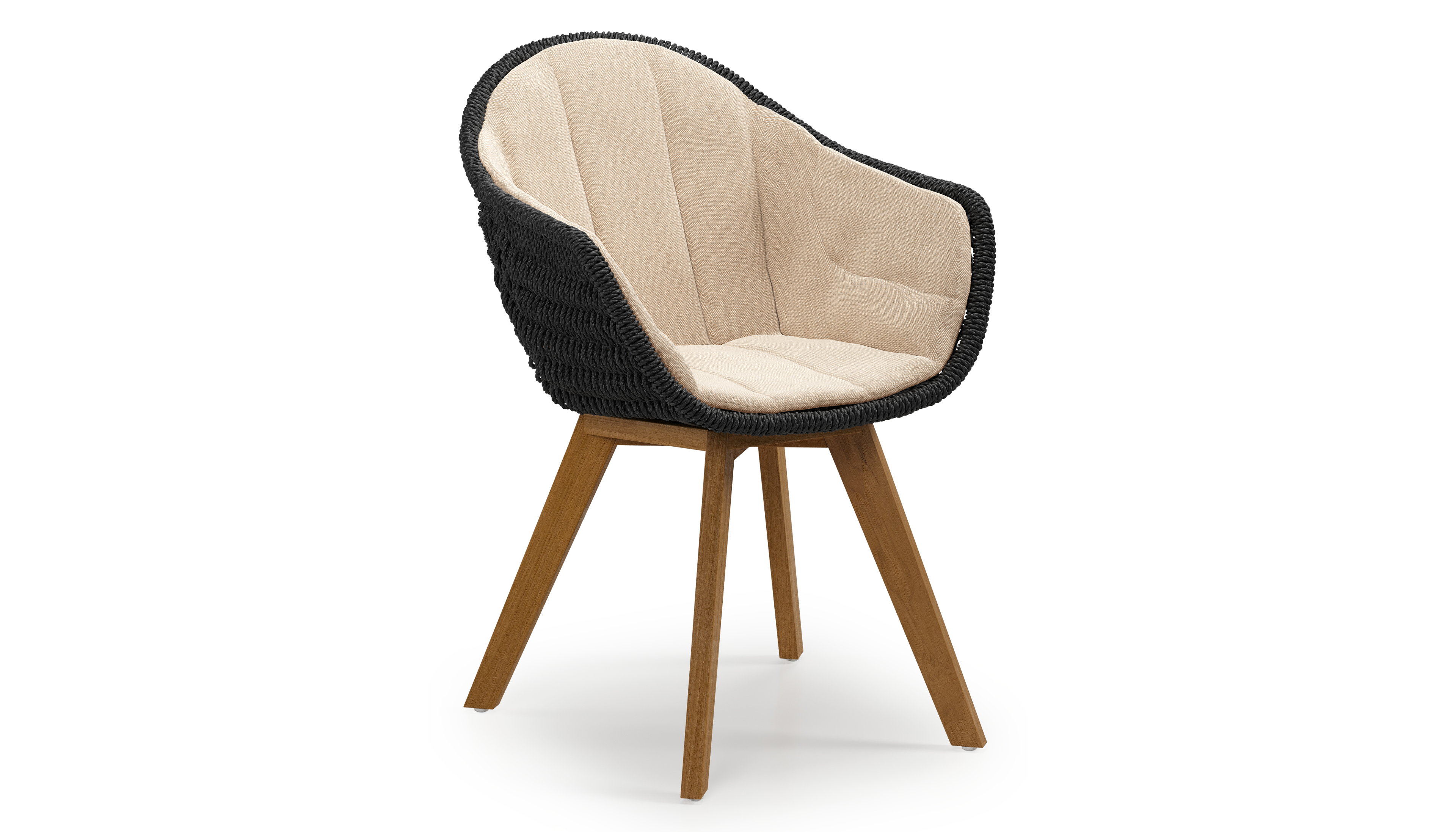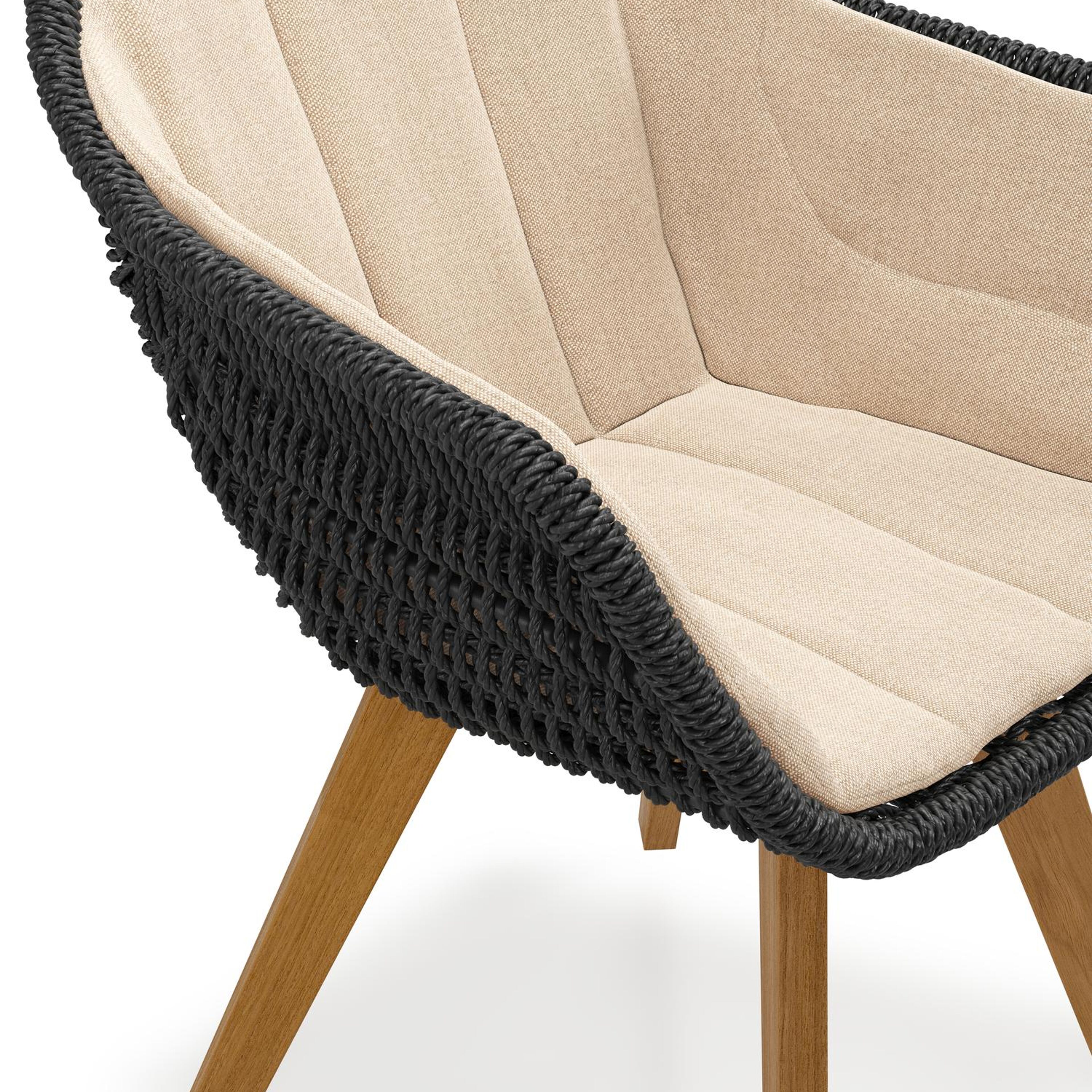 Pagino tuinstoel in teak en zwart ronde wicker met zitkussen in All Weather Sunbrella® Luxe Natte Heather Beige | Exterioo tuinmeubelen