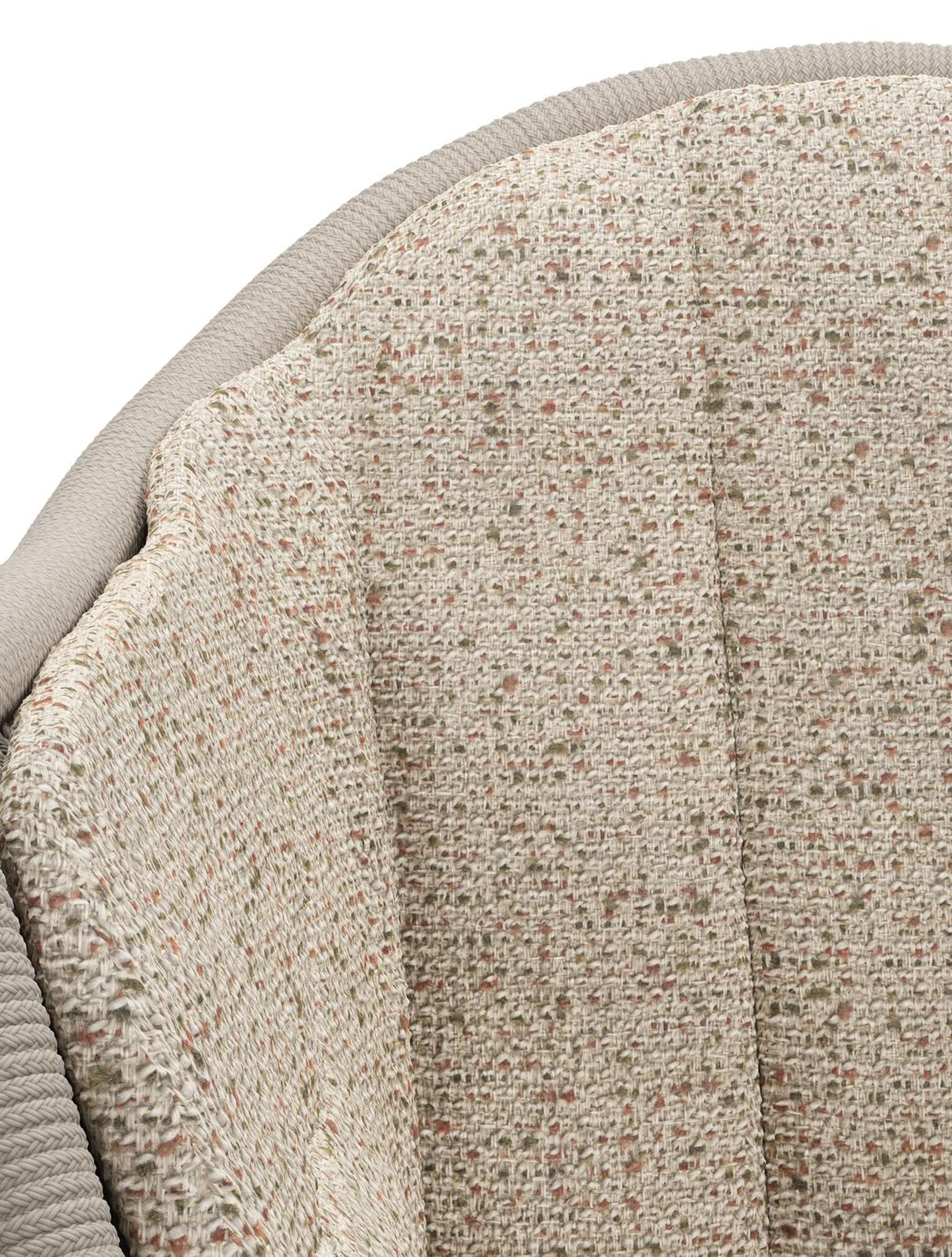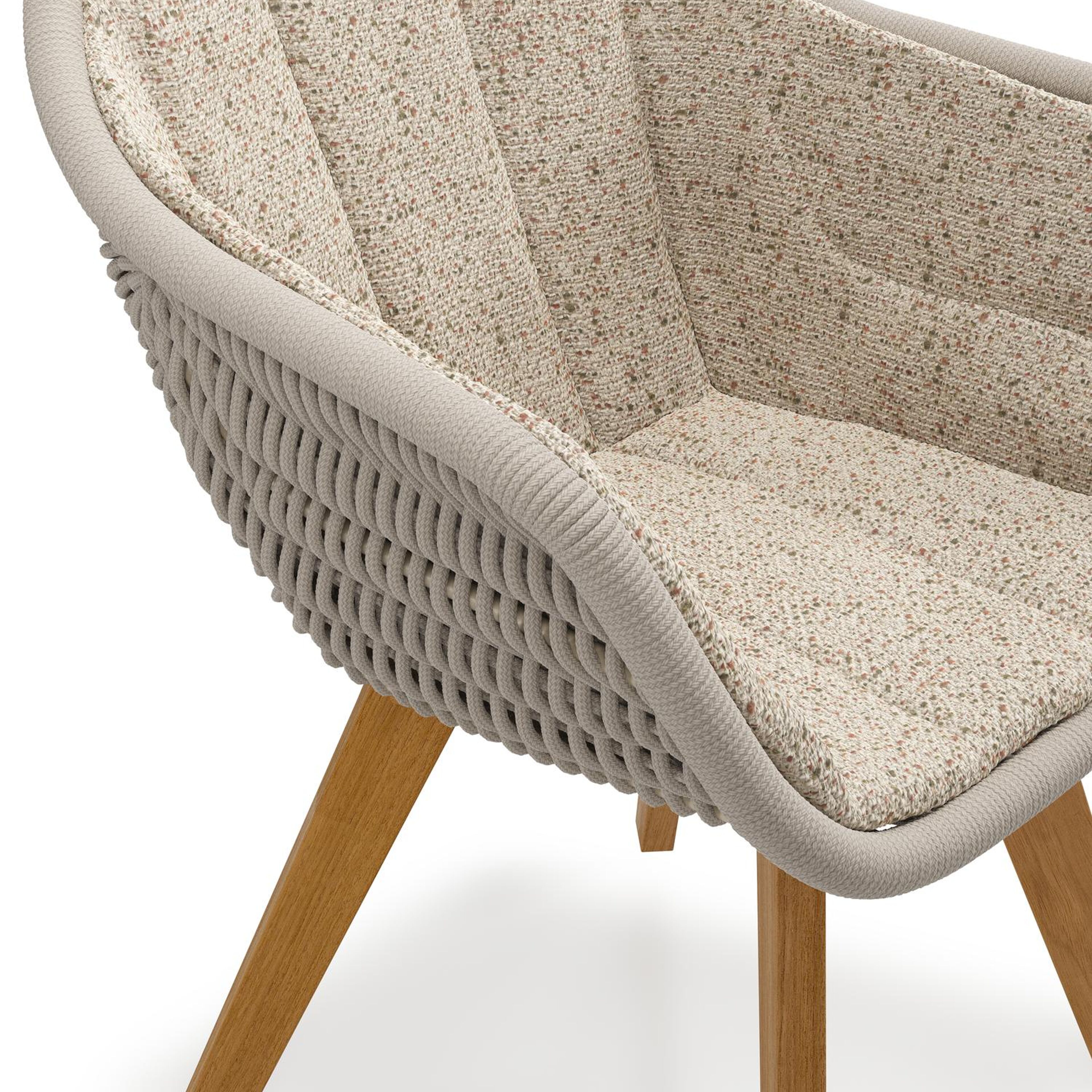 Pagino tuinstoel in teak en beige verticaal geweven ronde rope met zitkussen in All Weather Cosytica Bora Jungle | Exterioo tuinmeubelen