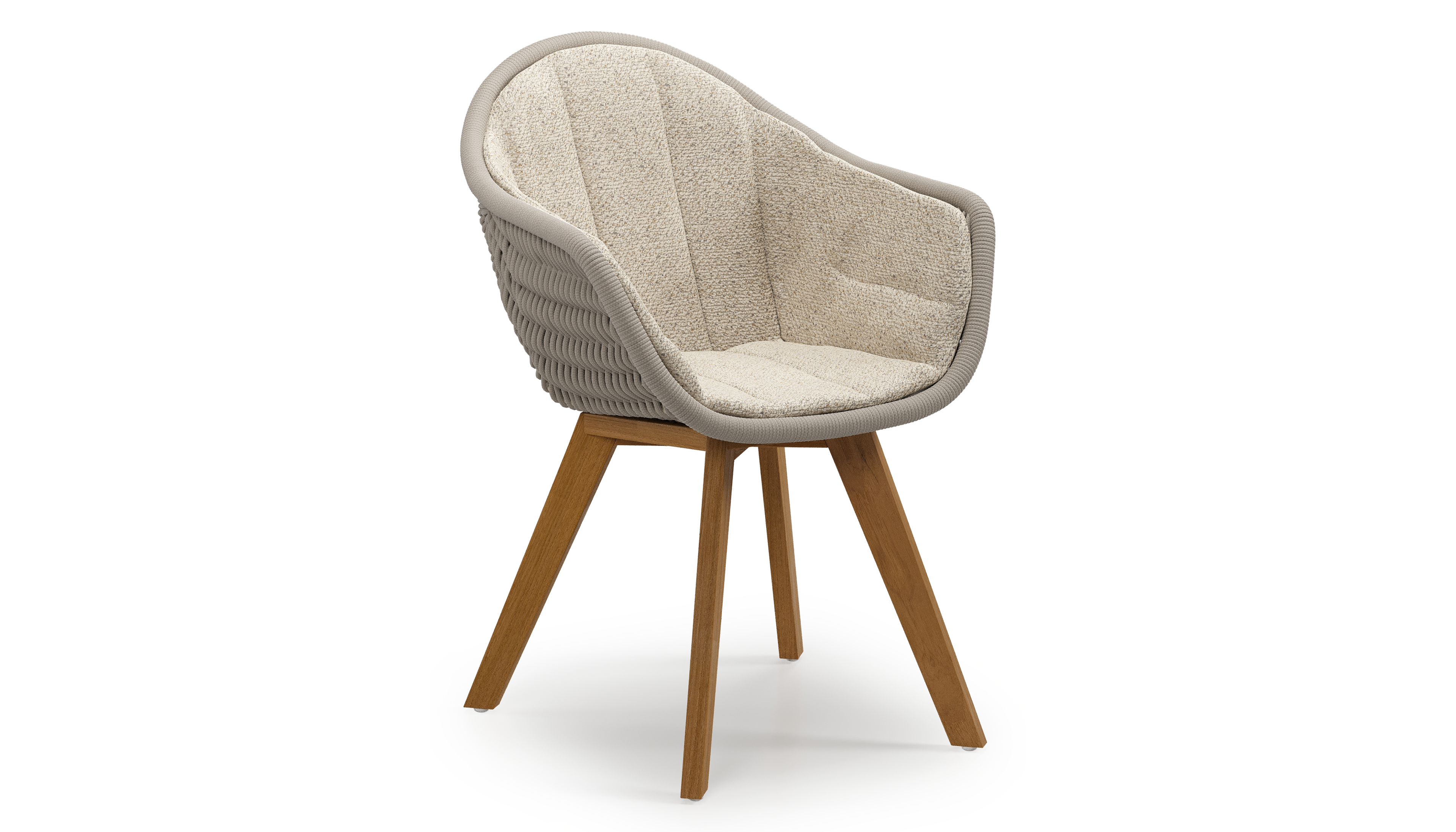 Pagino tuinstoel in teak en beige verticaal geweven ronde rope met zitkussen in All Weather Cosytica Bora Desert | Exterioo tuinmeubelen