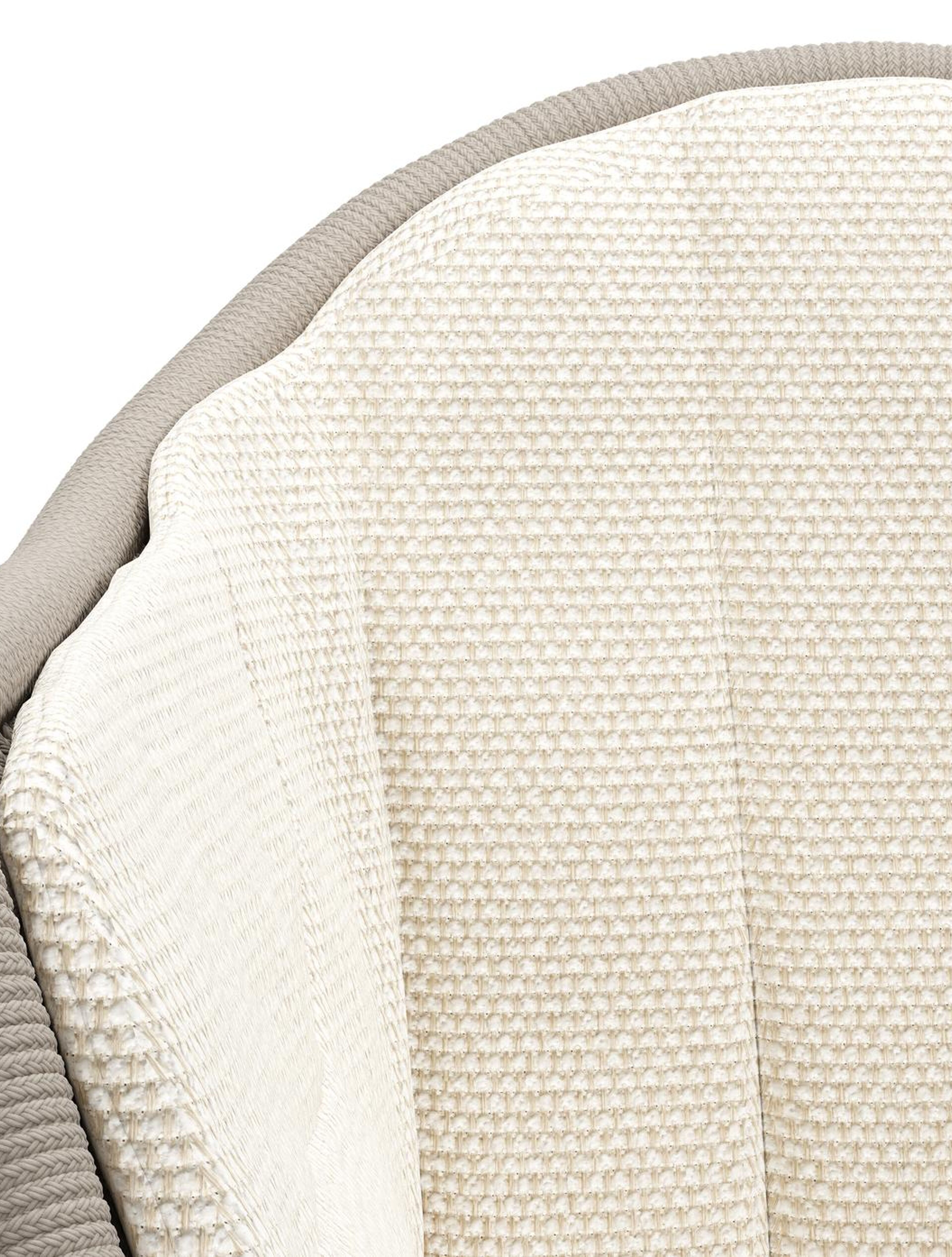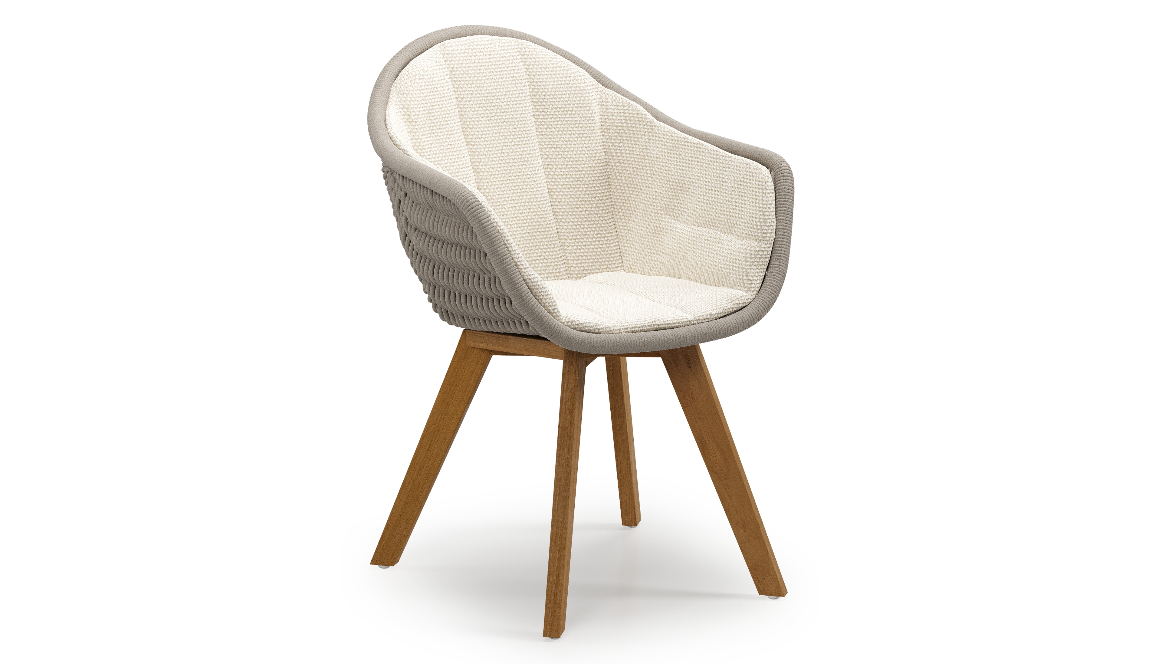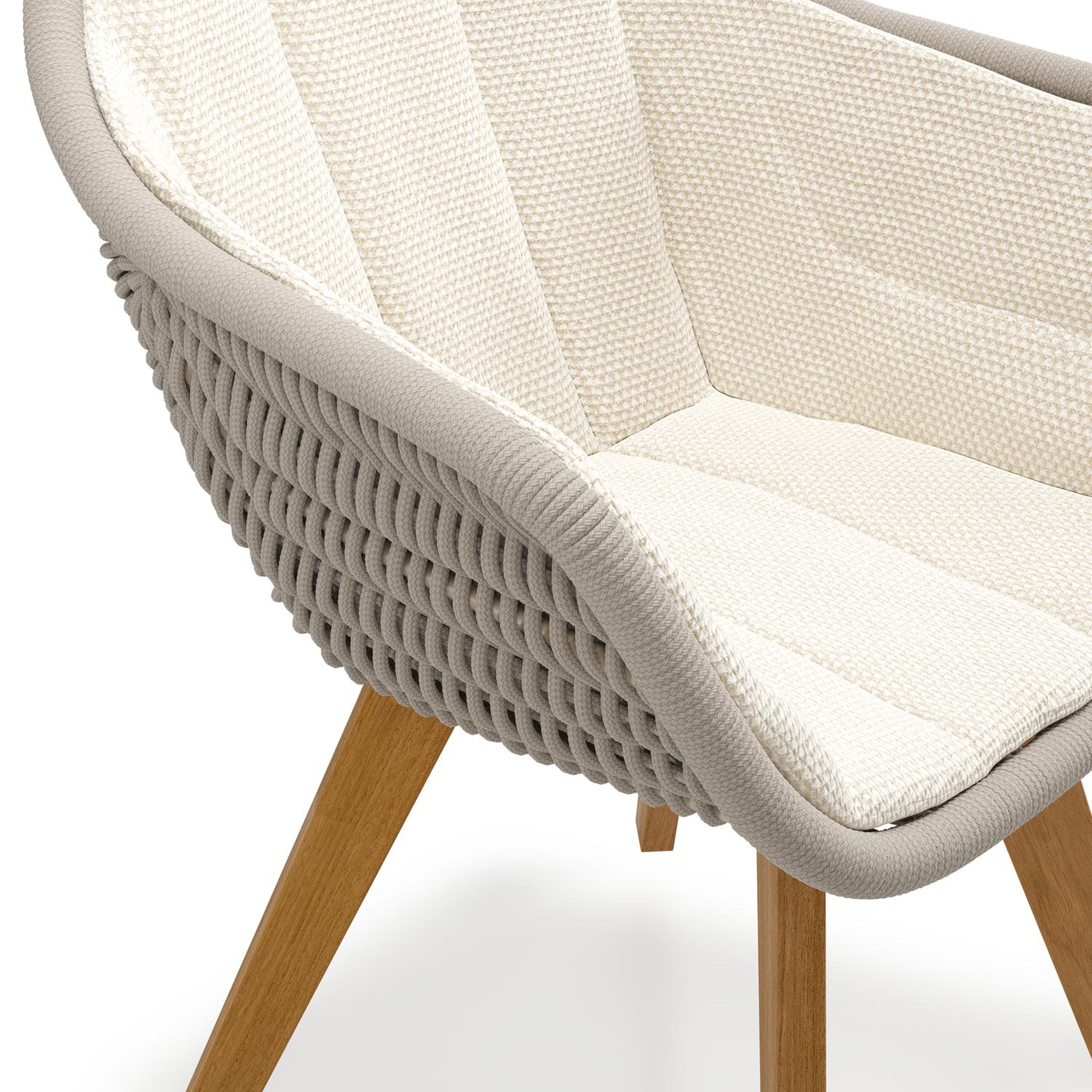 Pagino tuinstoel in teak en beige verticaal geweven ronde rope met zitkussen in All Weather Cosytica Althea Off White | Exterioo tuinmeubelen