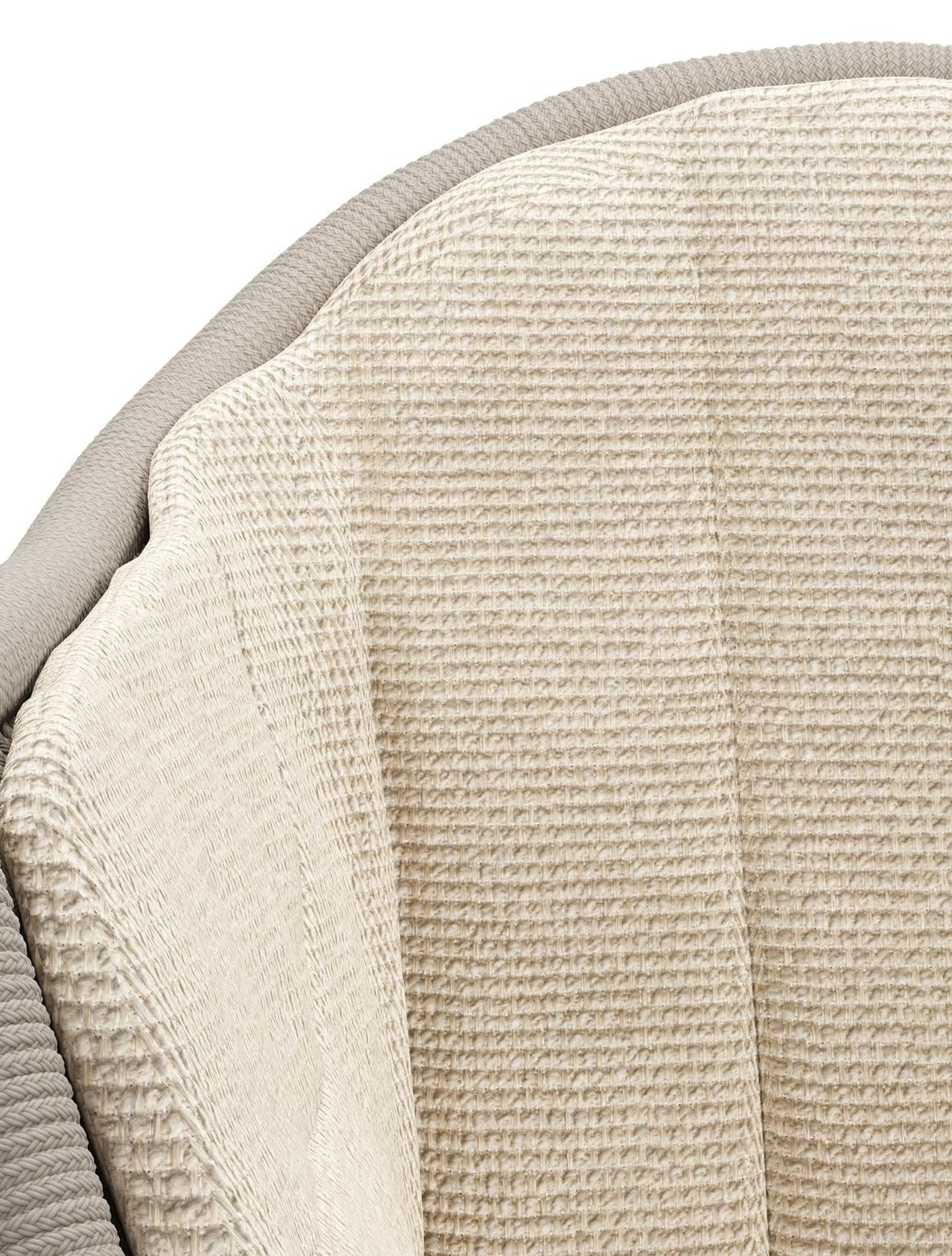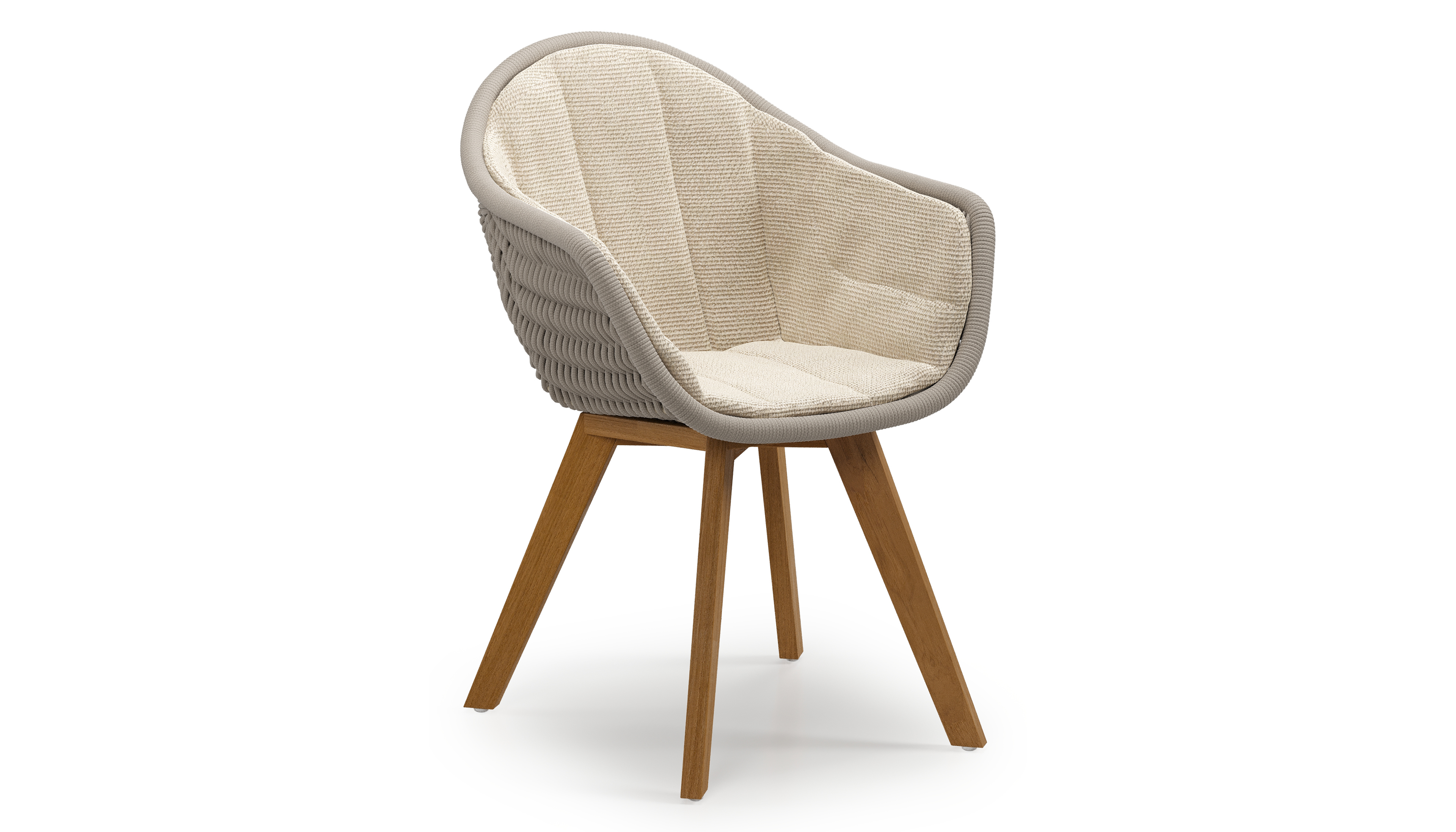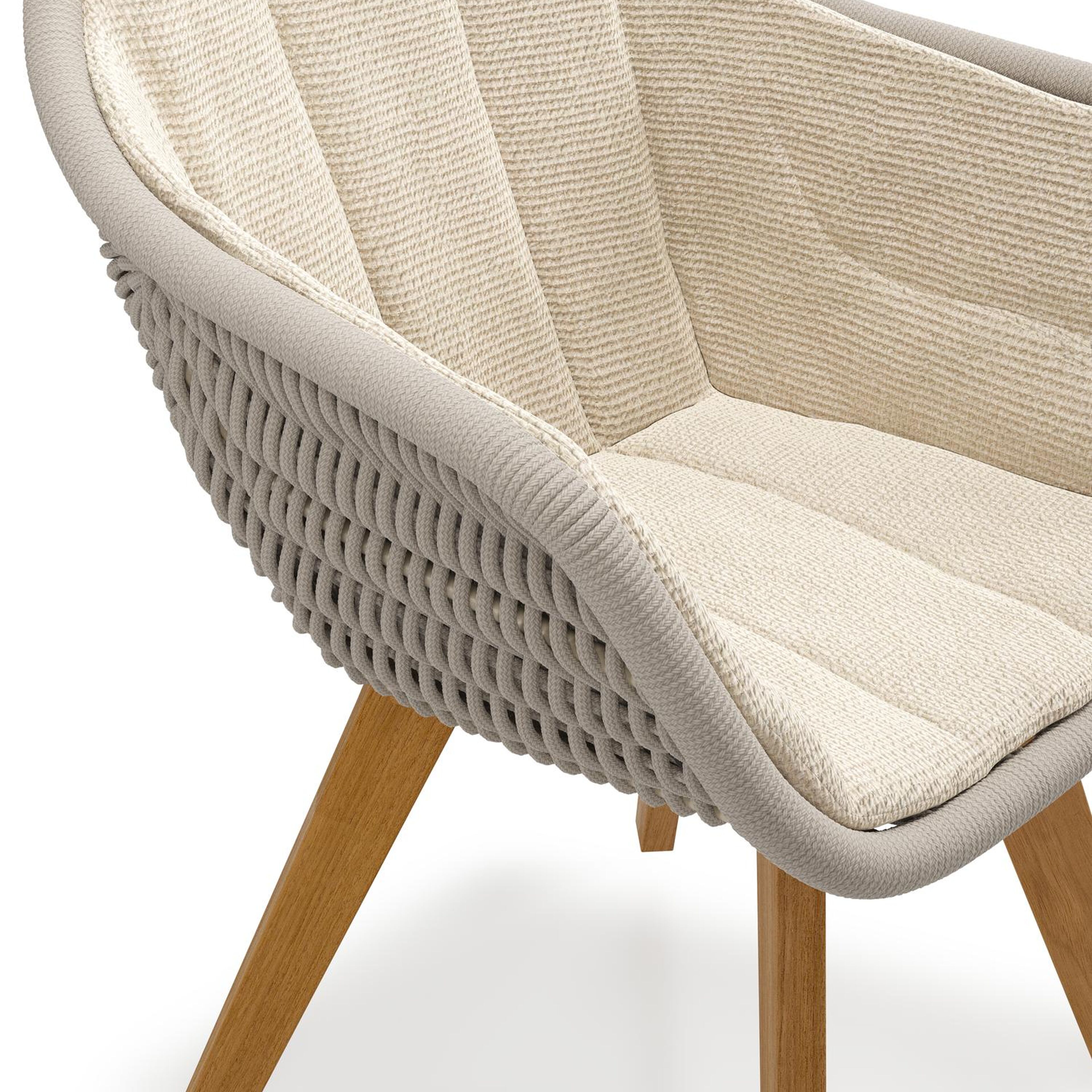 Pagino tuinstoel in teak en beige verticaal geweven ronde rope met zitkussen in All Weather Cosytica Althea Chalk | Exterioo tuinmeubelen