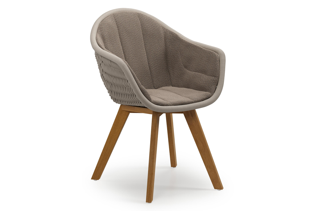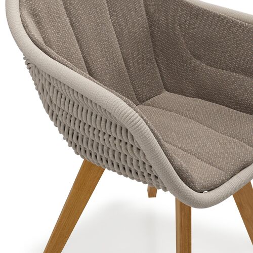 Pagino tuinstoel in teak en beige verticaal geweven ronde rope met zitkussen in All Weather Sunbrella® Luxe Lopi Coconut | Exterioo