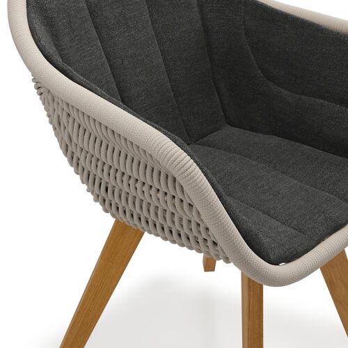 Pagino tuinstoel in teak en beige verticaal geweven ronde rope met zitkussen in All Weather Sunbrella® Luxe Chartres Sooty | Exterioo