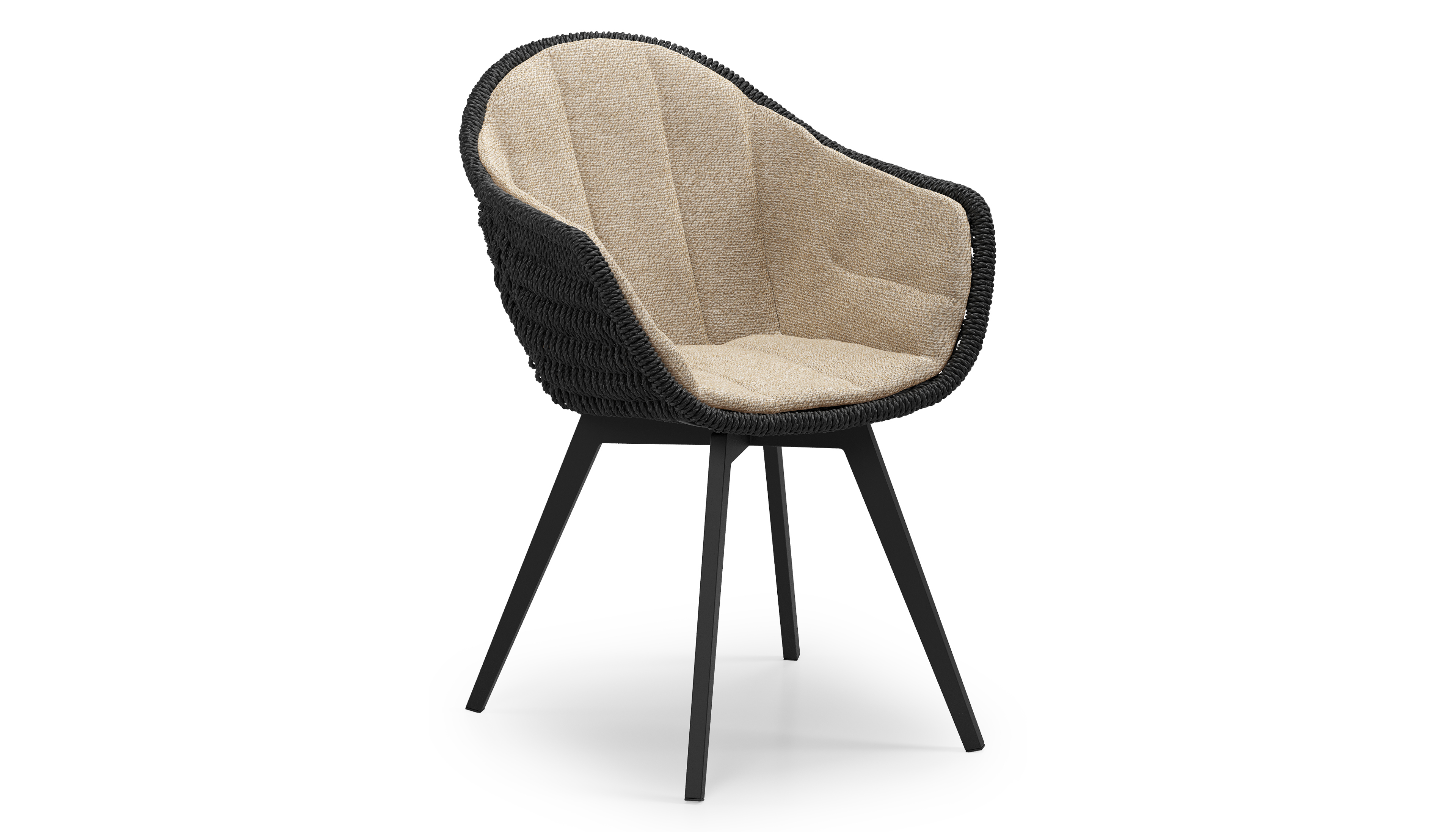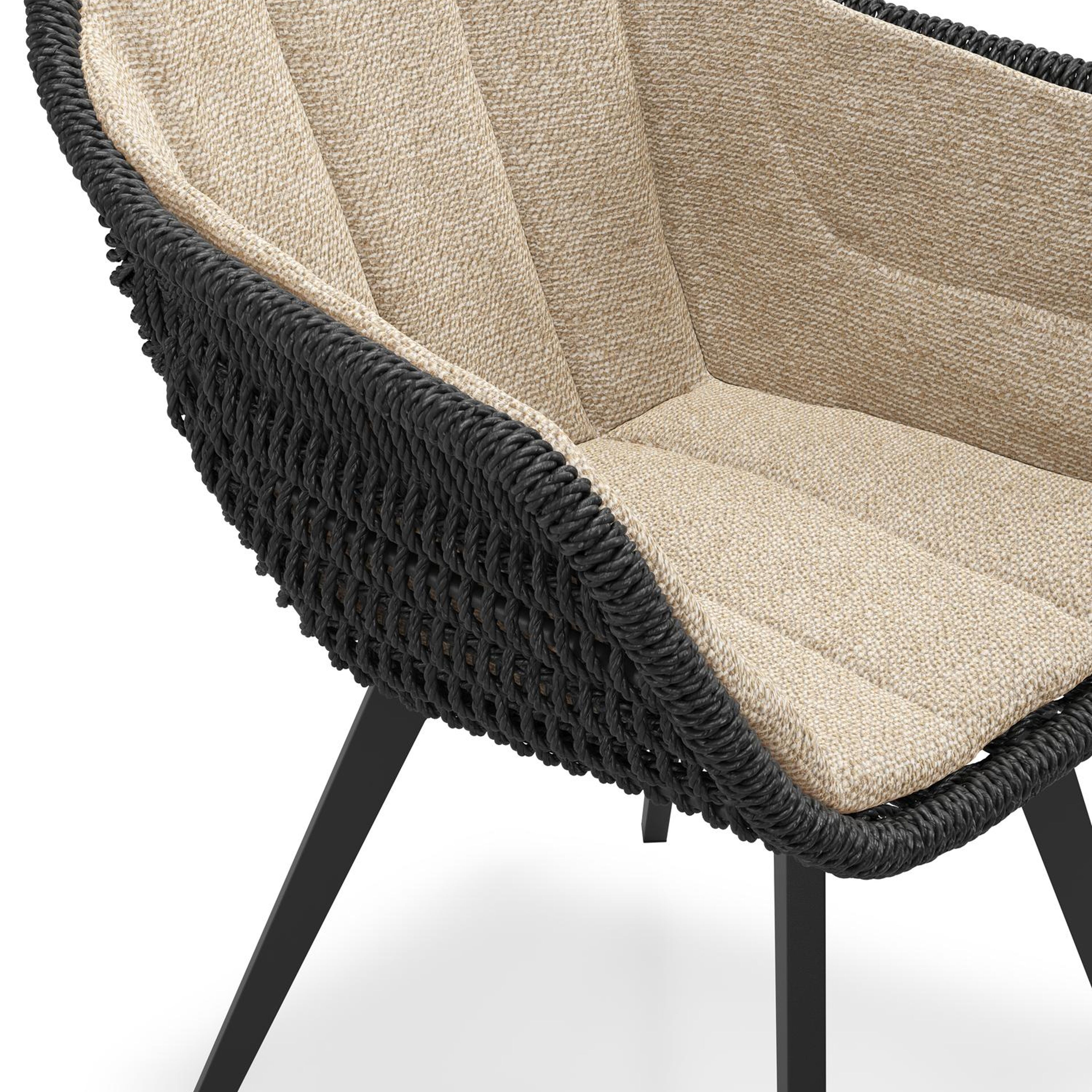 Pagino tuinstoel in zwart aluminium en zwart ronde wicker met zitkussen in All Weather Cosytica Madagascar Oak | Exterioo tuinmeubelen