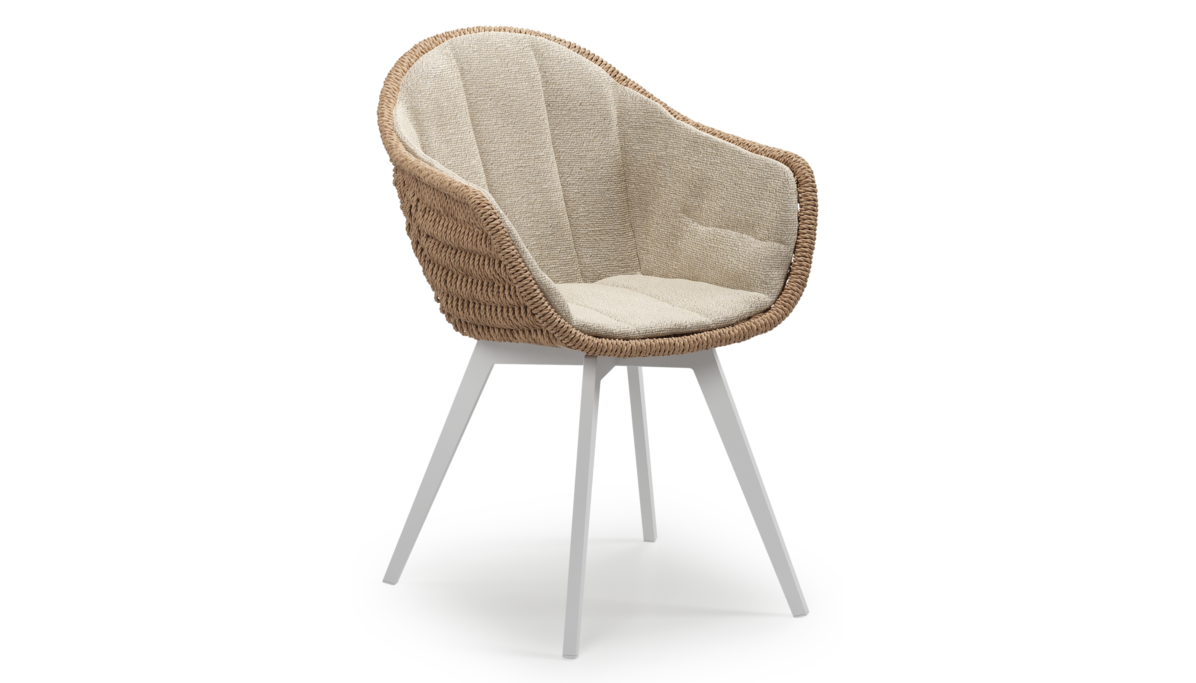 Pagino tuinstoel in wit aluminium en naturel ronde wicker met zitkussen in All Weather Cosytica Marbella Sand | Exterioo tuinmeubelen