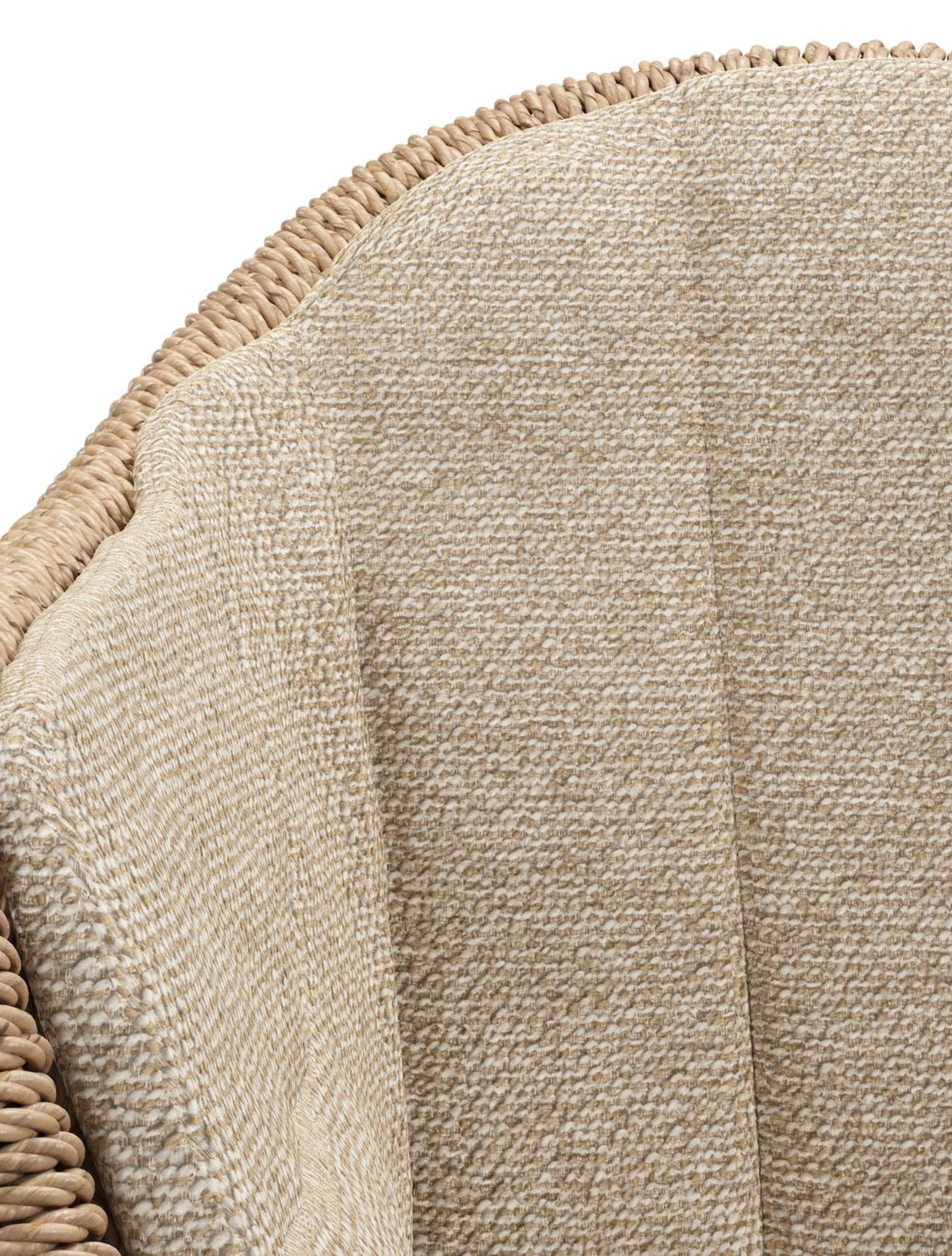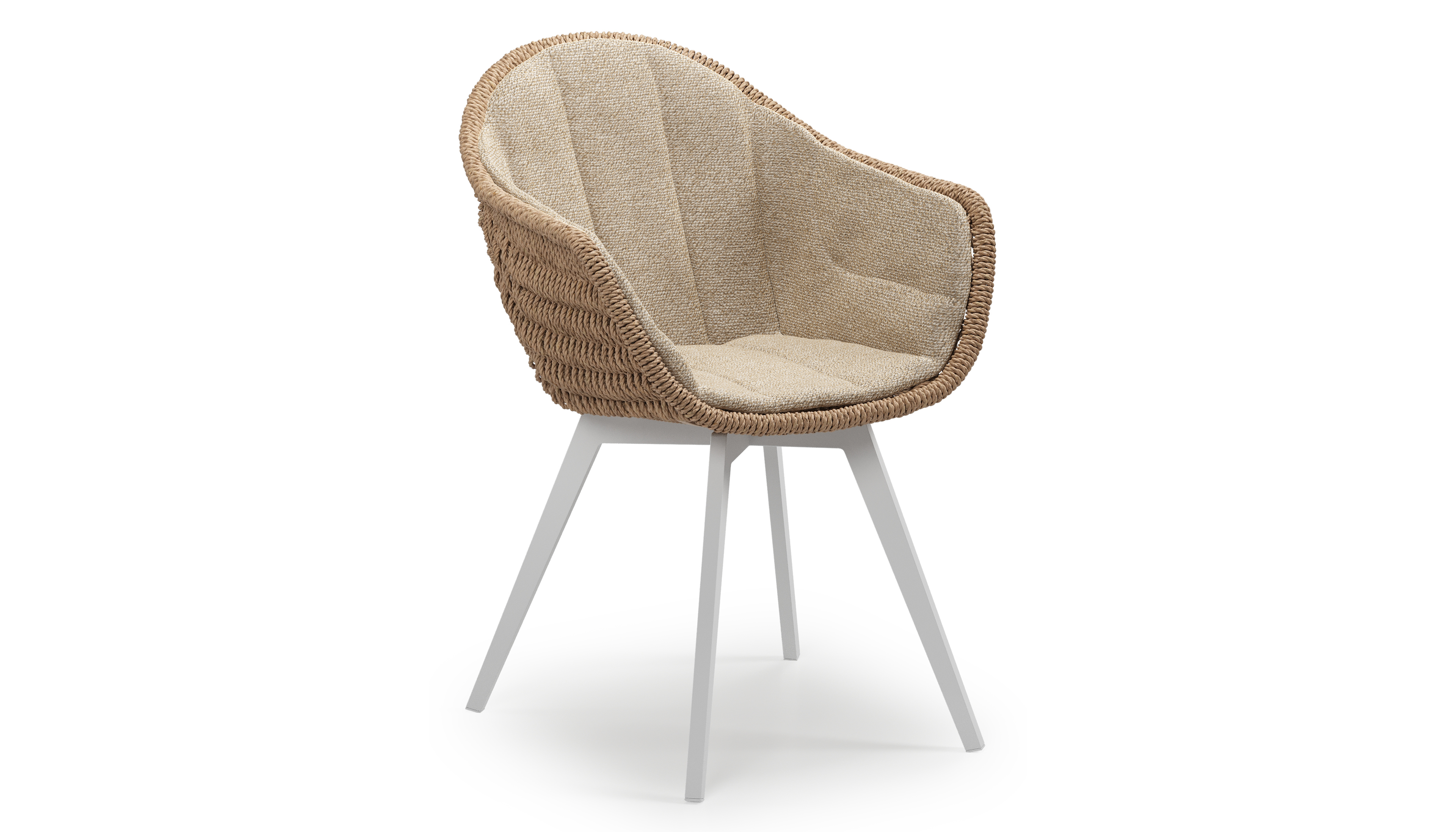 Pagino tuinstoel in wit aluminium en naturel ronde wicker met zitkussen in All Weather Cosytica Madagascar Oak | Exterioo tuinmeubelen