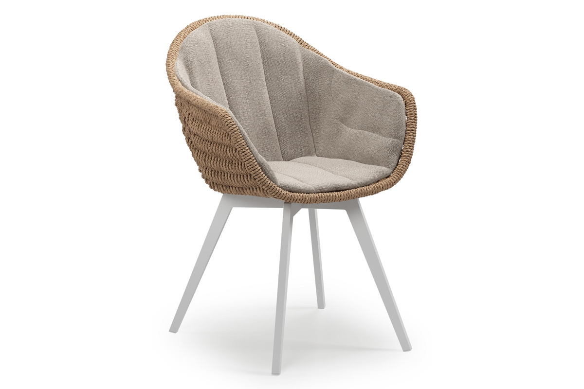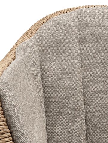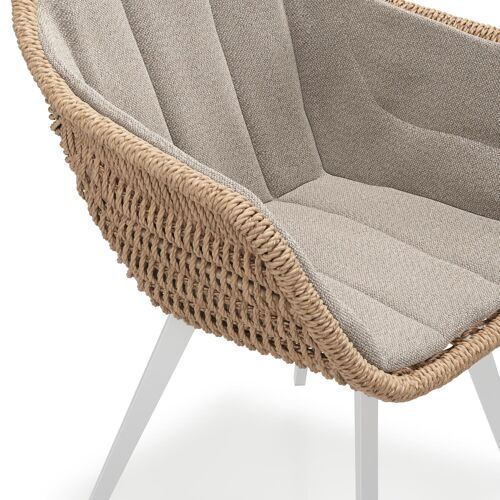 Pagino tuinstoel in wit aluminium en naturel ronde wicker met zitkussen in All Weather Sunbrella® Luxe Savane Coconut | Exterioo