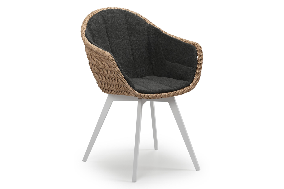 Pagino tuinstoel in wit aluminium en naturel ronde wicker met zitkussen in All Weather Sunbrella® Luxe Chartres Sooty | Exterioo