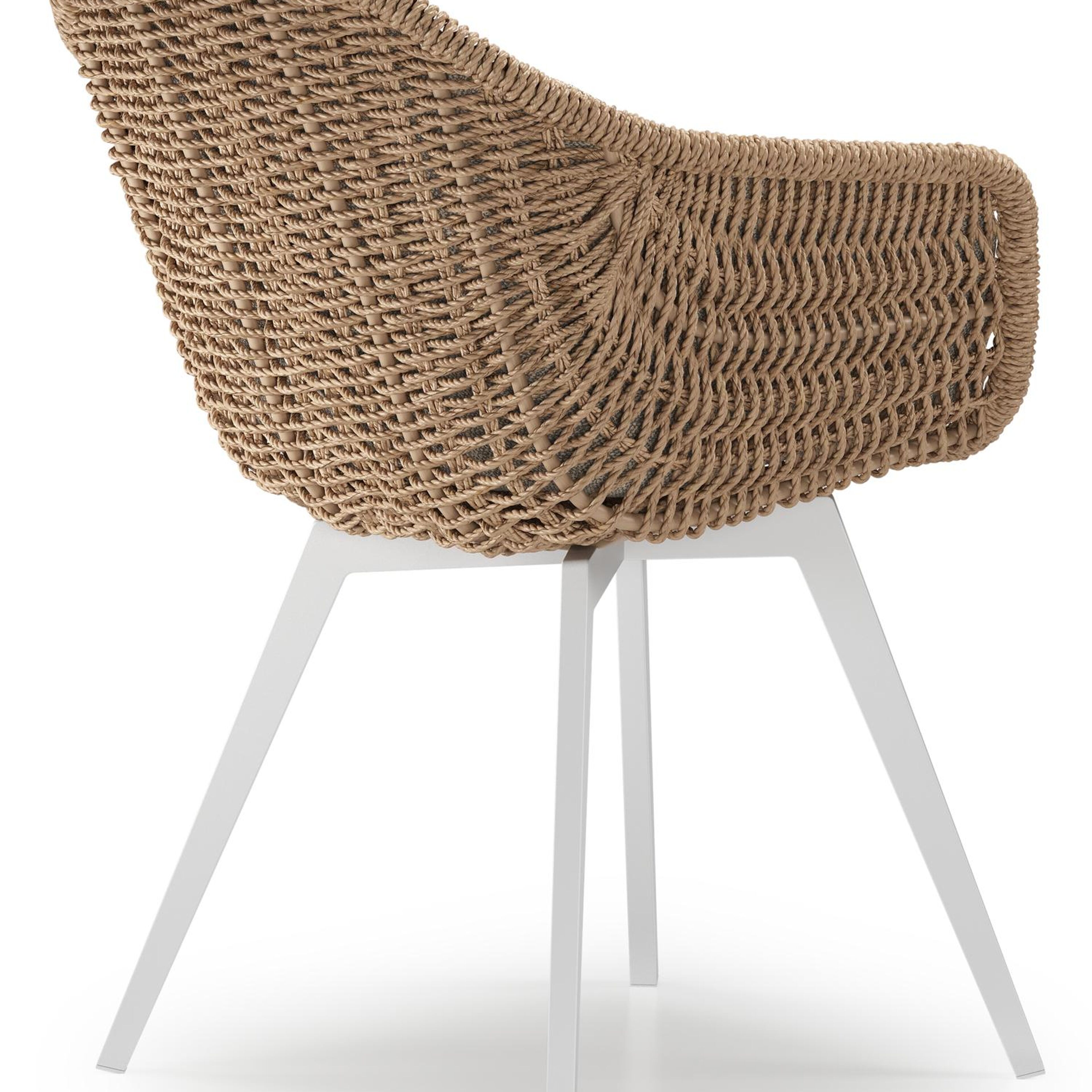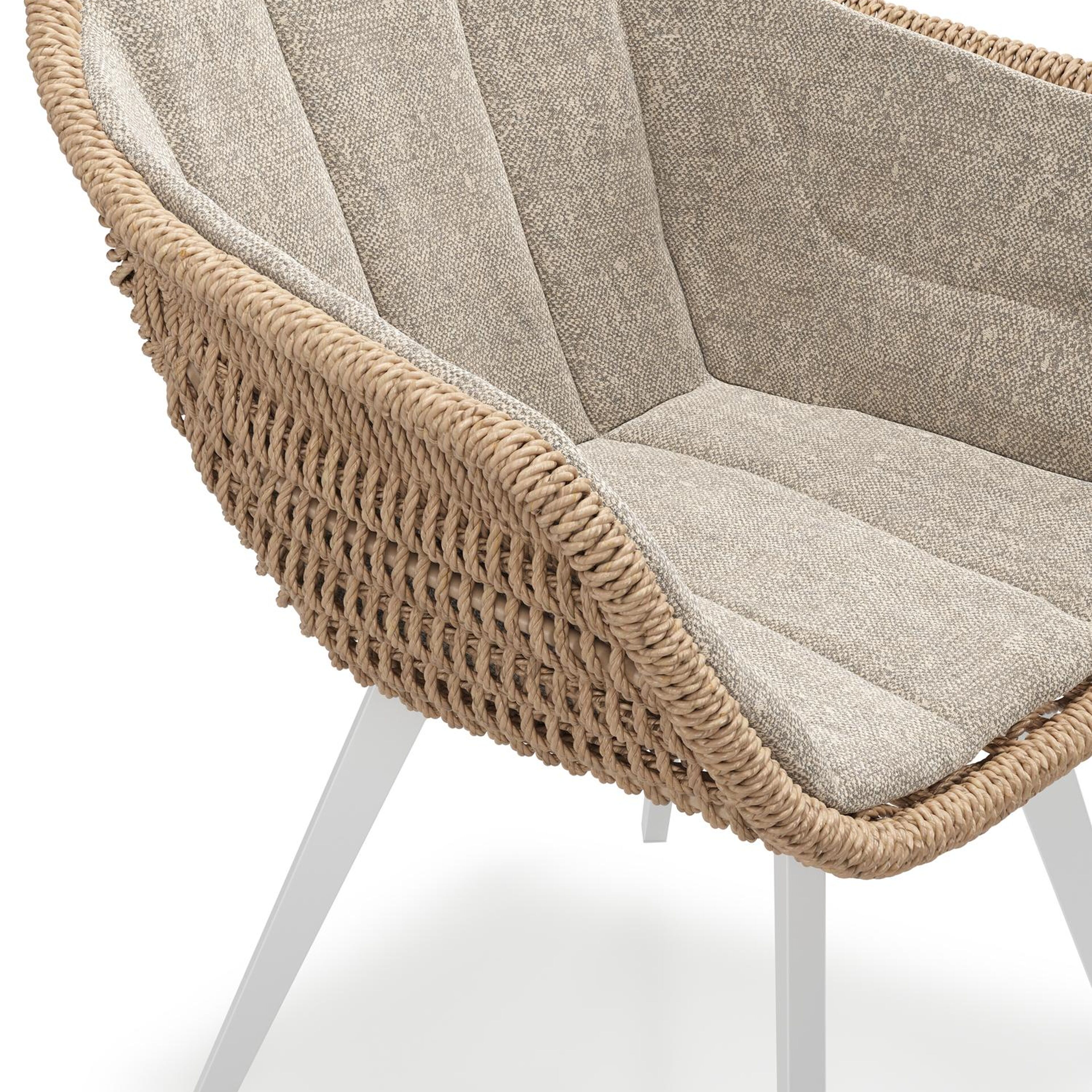 Pagino tuinstoel in wit aluminium en naturel ronde wicker met zitkussen in All Weather Sunbrella® Luxe Chartres Pewter | Exterioo tuinmeubelen