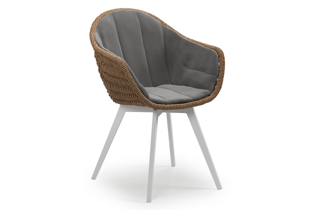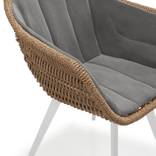 Pagino tuinstoel in wit aluminium en bruin ronde wicker met zitkussen in All Weather Sunbrella® Luxe Natte Charcoal Chine | Exterioo