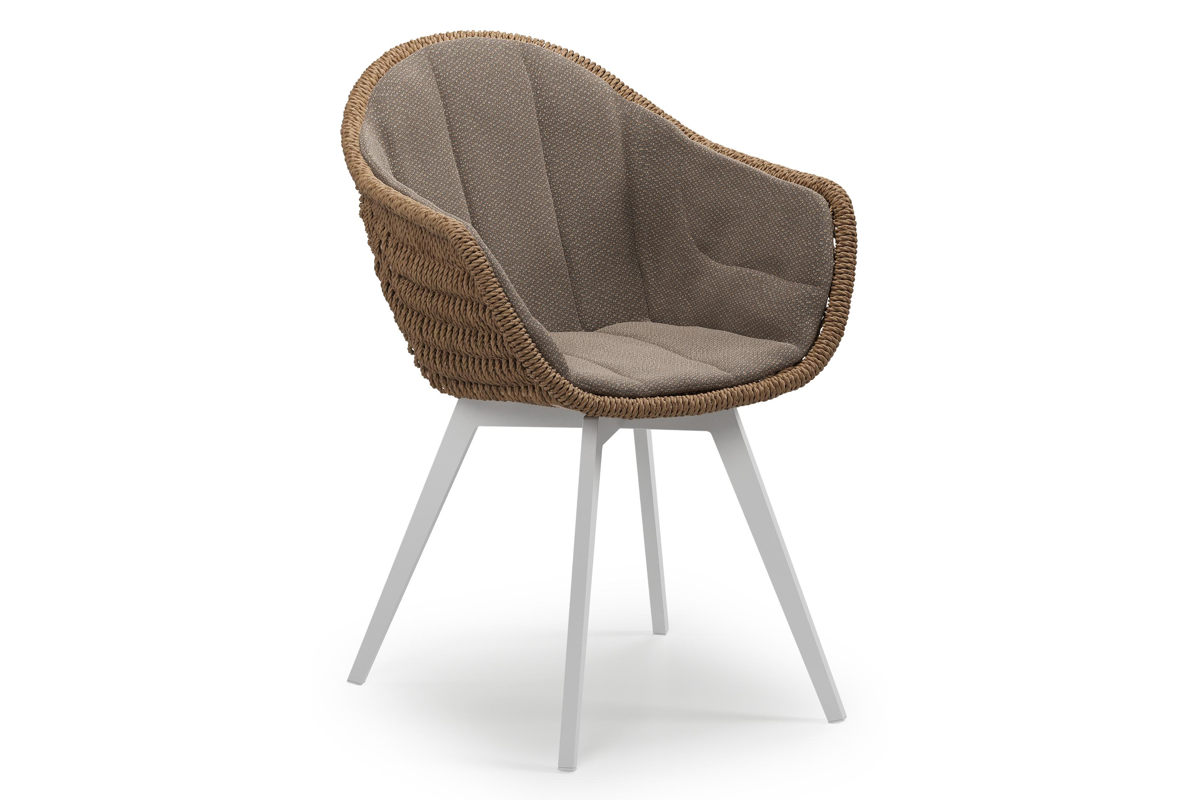 Pagino tuinstoel in wit aluminium en bruin ronde wicker met zitkussen in All Weather Sunbrella® Luxe Lopi Coconut | Exterioo