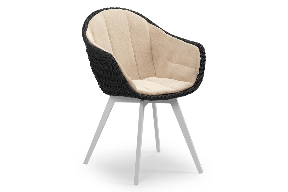 Pagino tuinstoel in wit aluminium en zwart ronde wicker met zitkussen in All Weather Sunbrella® Luxe Natte Heather Beige | Exterioo