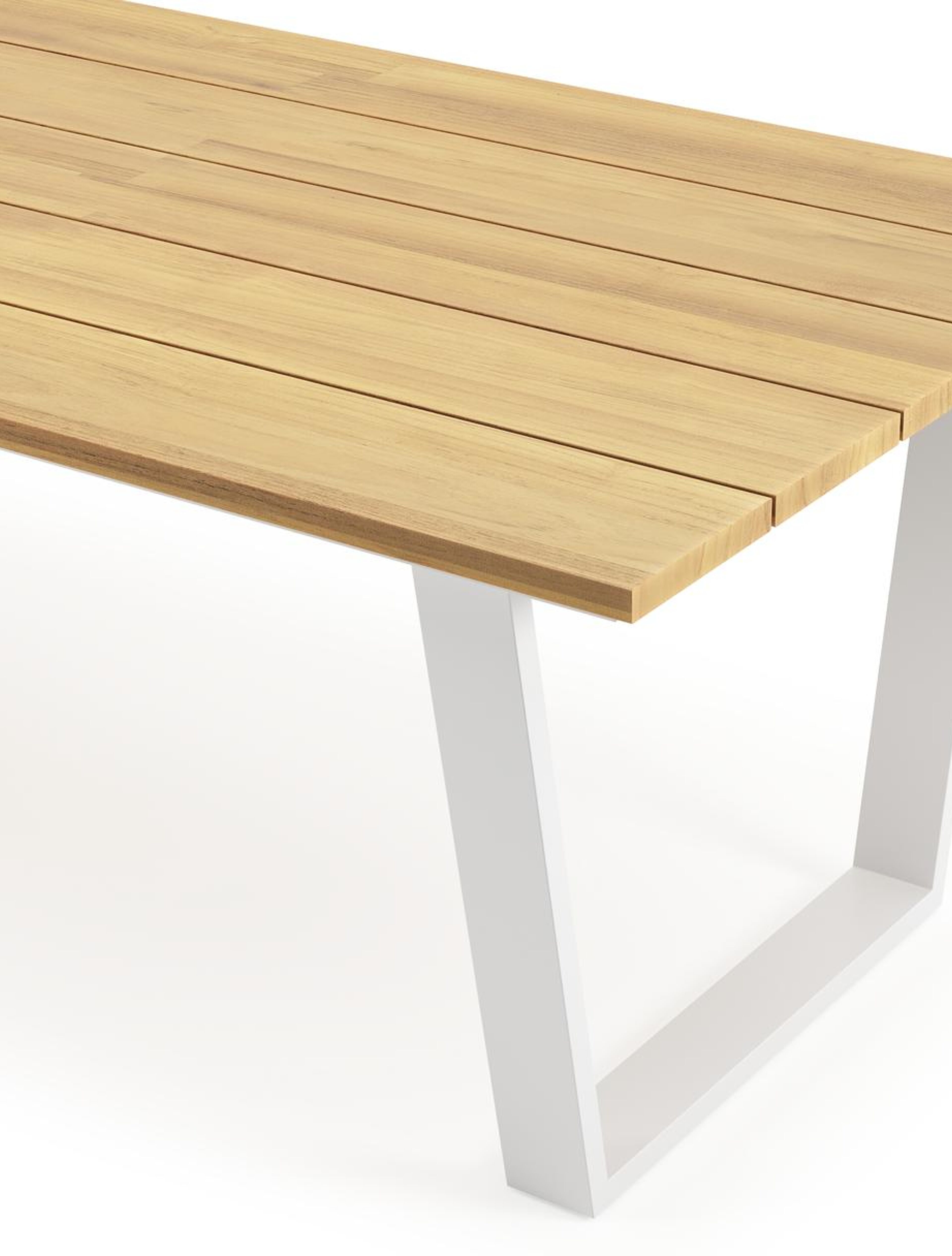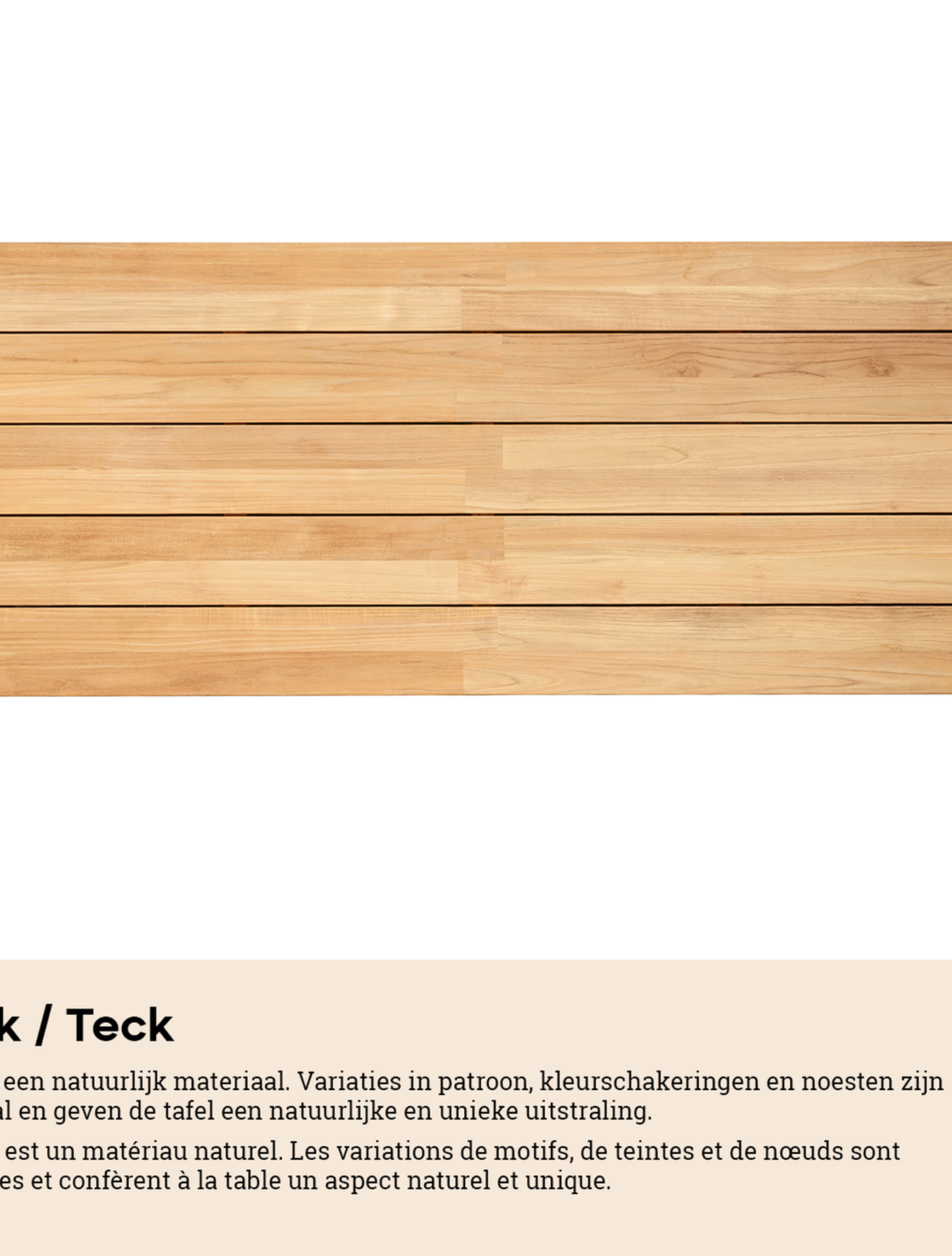 Een tafelblad uit teak staat gelijk aan bijzondere kwaliteit en natuurlijk design. Teak is een kwalitatieve houtsoort gekenmerkt door zijn hardheid. Aangezien hout leeft, kan de structuur of kleur licht anders zijn dan op het beeld weergegeven.