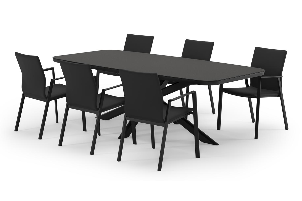 De Pamplona tuinset straalt met zijn afgeronde vorm en opvallende kruispoot een robuuste hedendaagse look uit. Deze tuinset is ideaal voor een groot gezelschap.