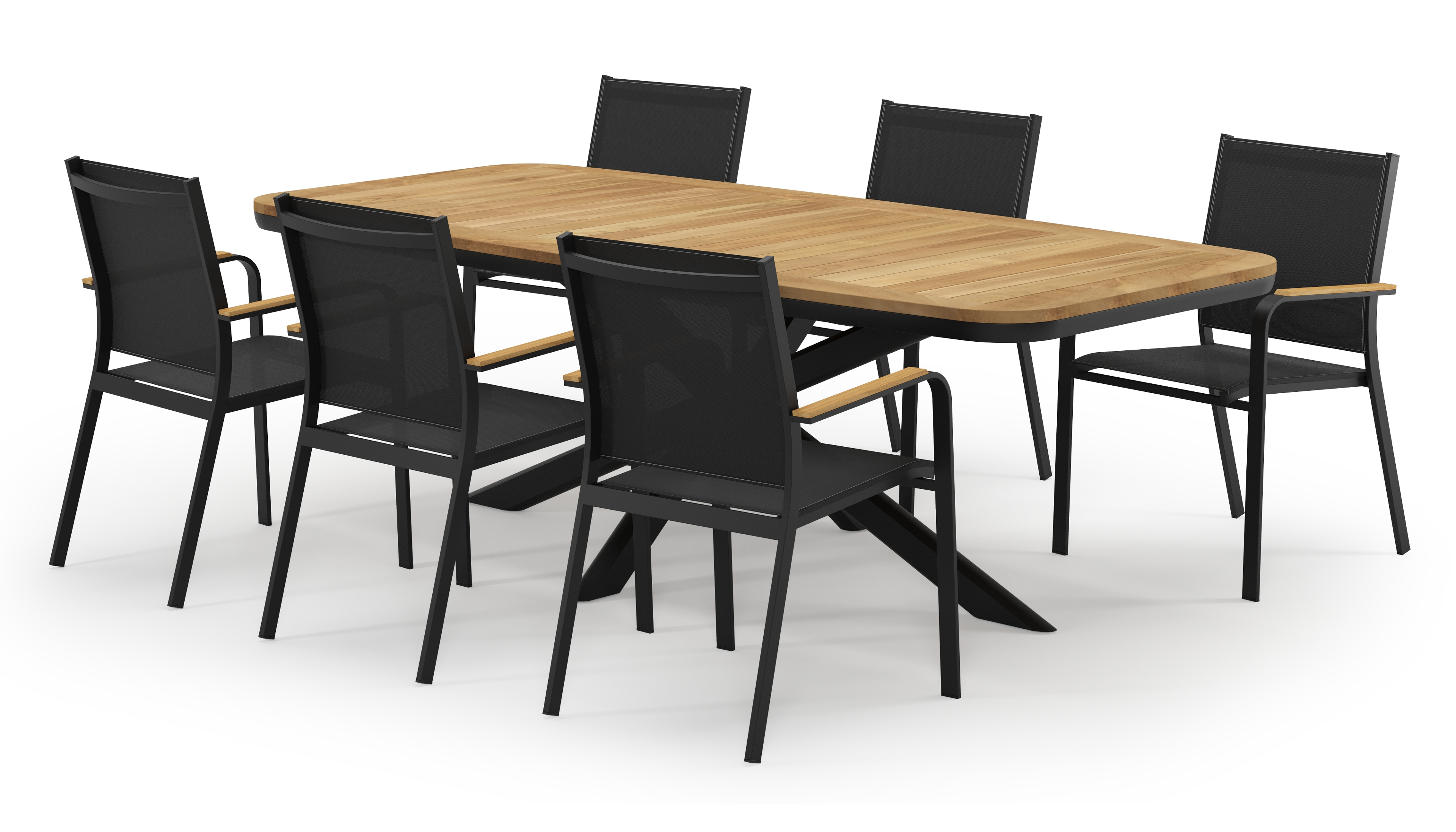 De Pamplona tuinset straalt met zijn afgeronde vorm en opvallende kruispoot een robuuste hedendaagse look uit. Deze tuinset is ideaal voor een groot gezelschap.
