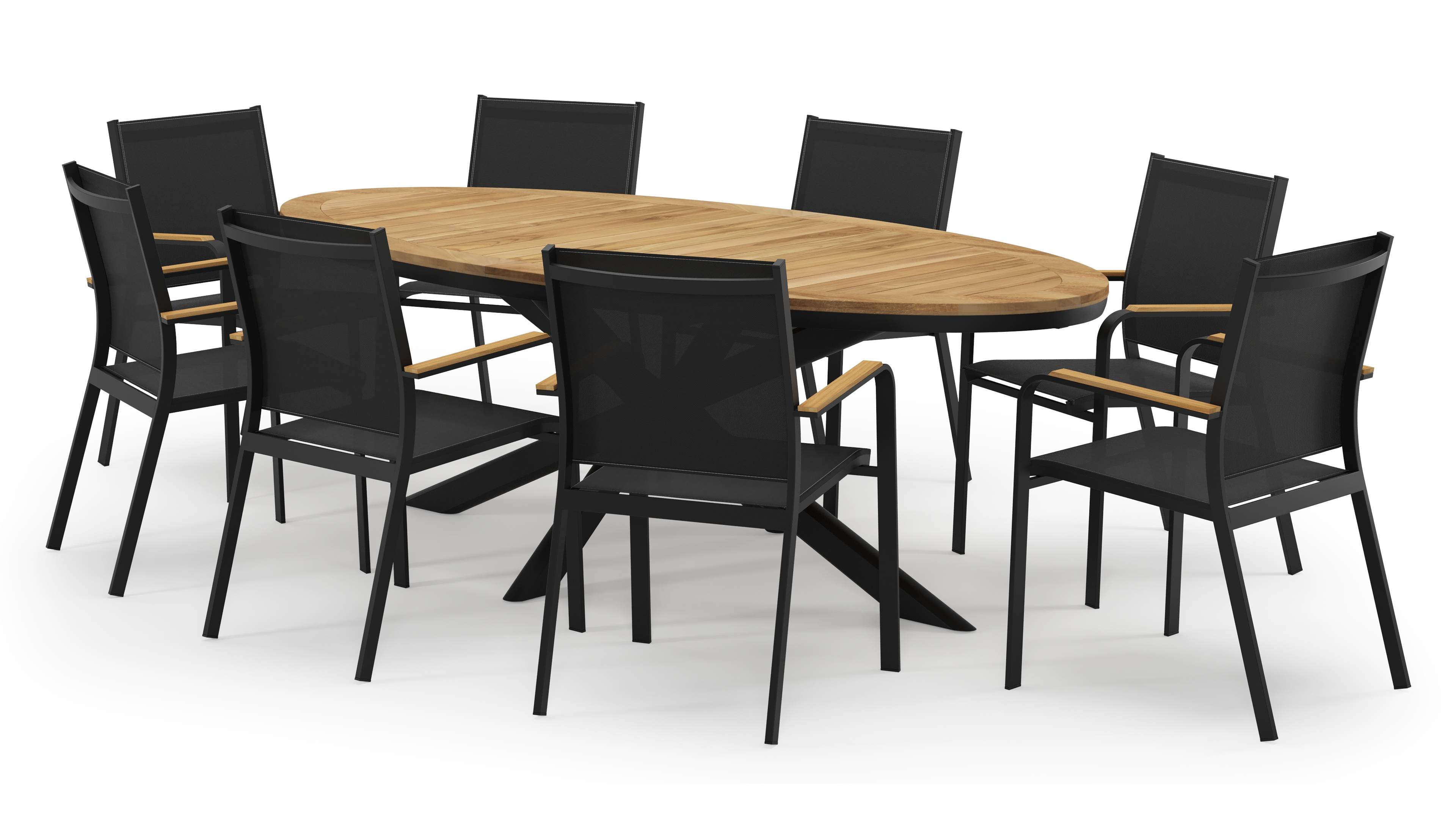 De Pamplona tuinset straalt met zijn afgeronde vorm en opvallende kruispoot een robuuste hedendaagse look uit. Deze tuinset is ideaal voor een groot gezelschap.