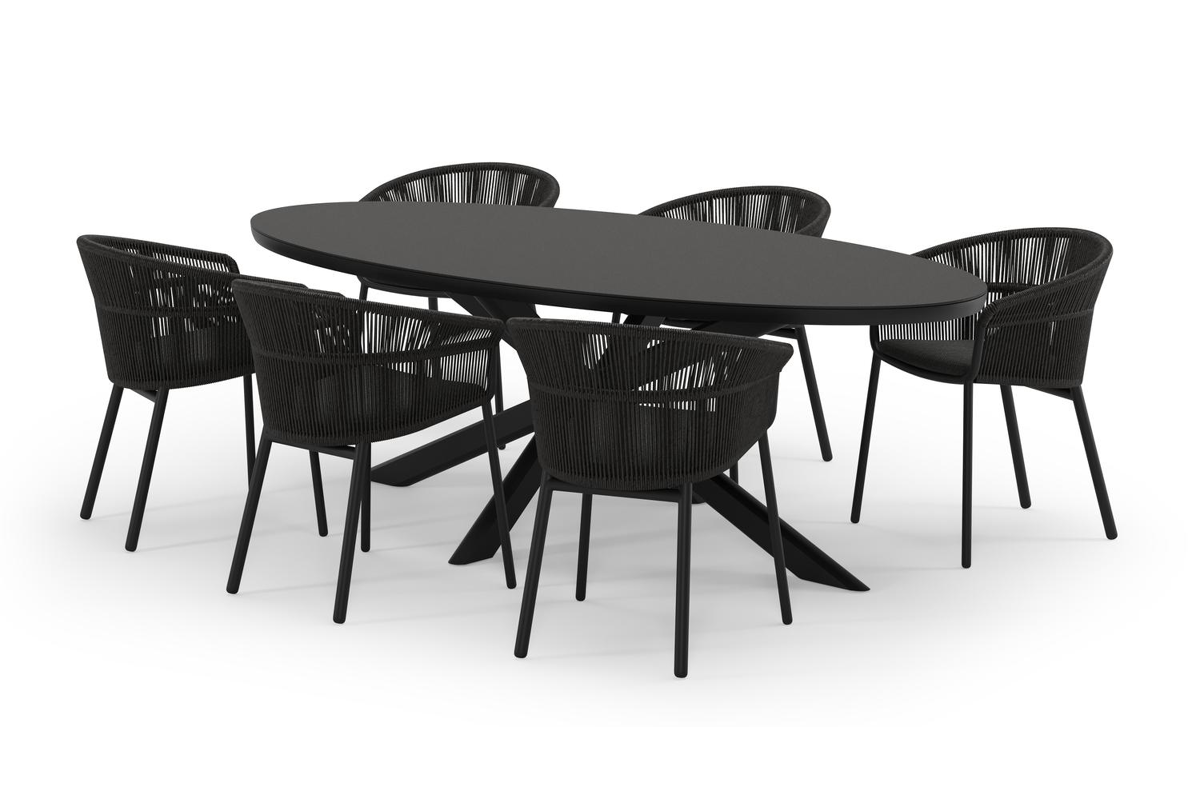 De Pamplona tuinset straalt met zijn afgeronde vorm en opvallende kruispoot een robuuste hedendaagse look uit. Deze tuinset is ideaal voor een groot gezelschap.