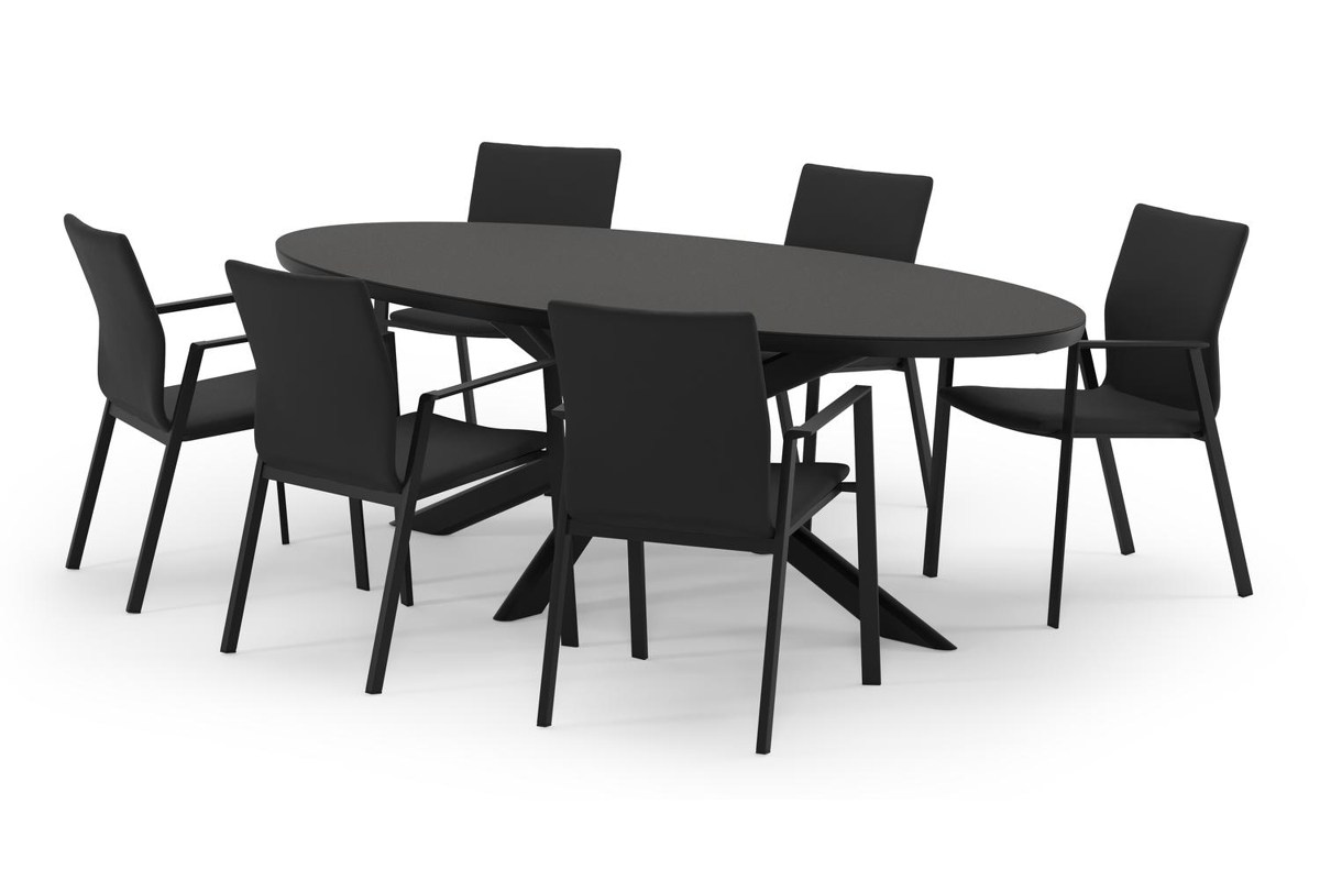 De Pamplona tuinset straalt met zijn afgeronde vorm en opvallende kruispoot een robuuste hedendaagse look uit. Deze tuinset is ideaal voor een groot gezelschap.