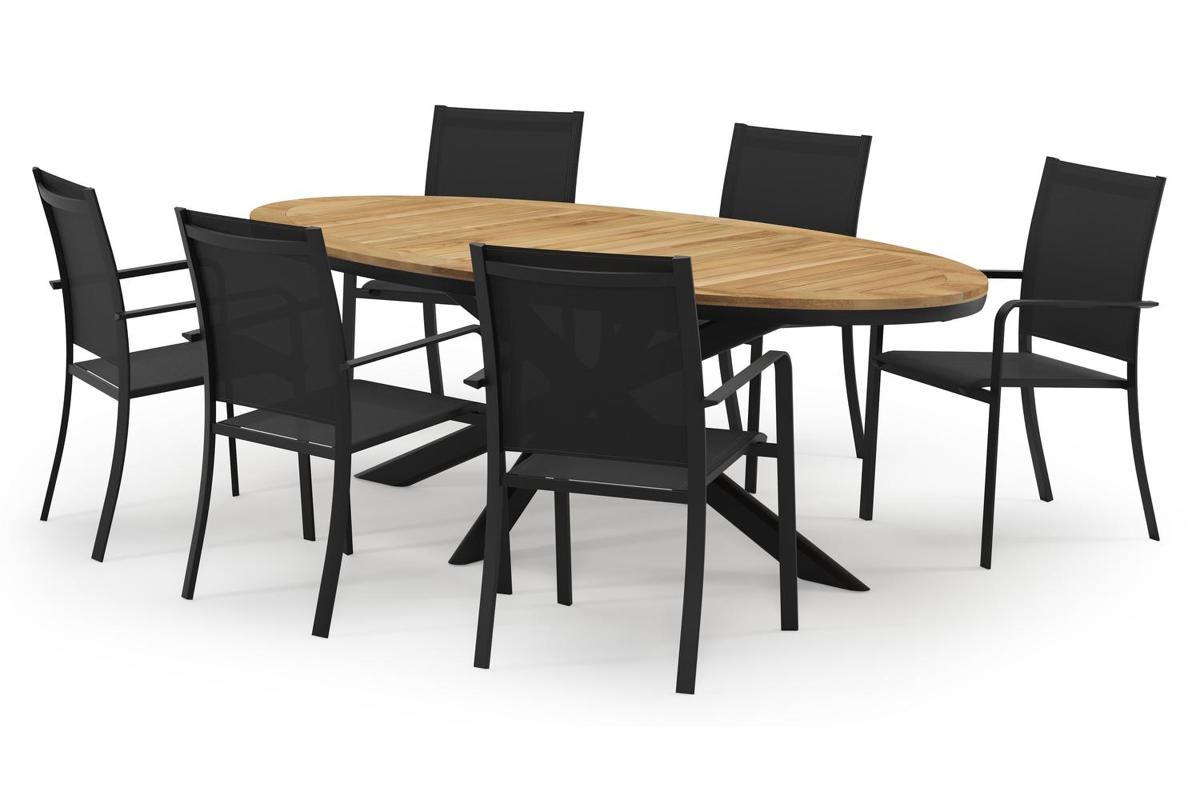 Pamplona ovale tuinset in zwart aluminium en teak natural finish met 6 Calobra tuinstoelen | Exterioo