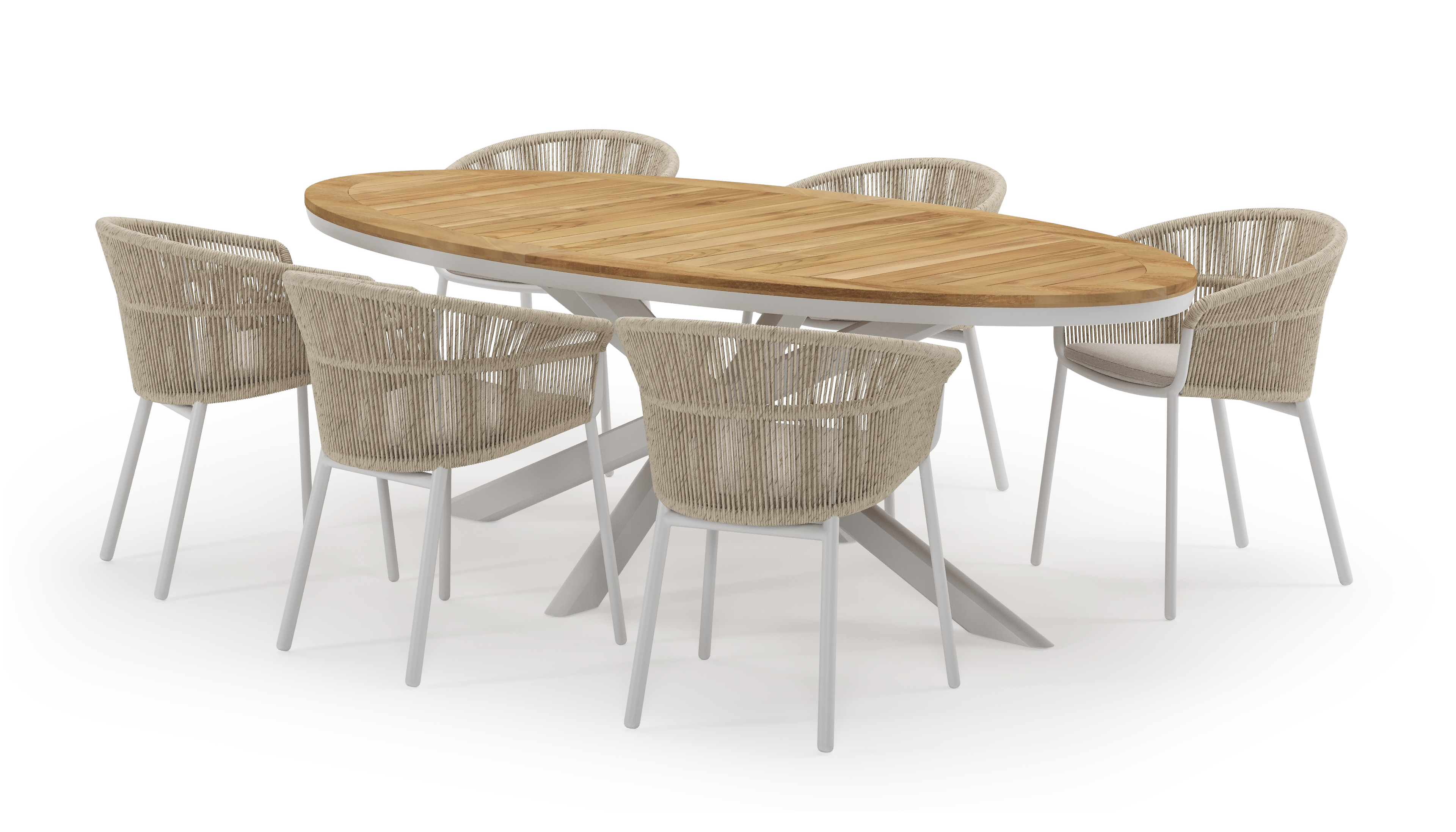 De Pamplona tuinset straalt met zijn afgeronde vorm en opvallende kruispoot een robuuste hedendaagse look uit. Deze tuinset is ideaal voor een groot gezelschap.