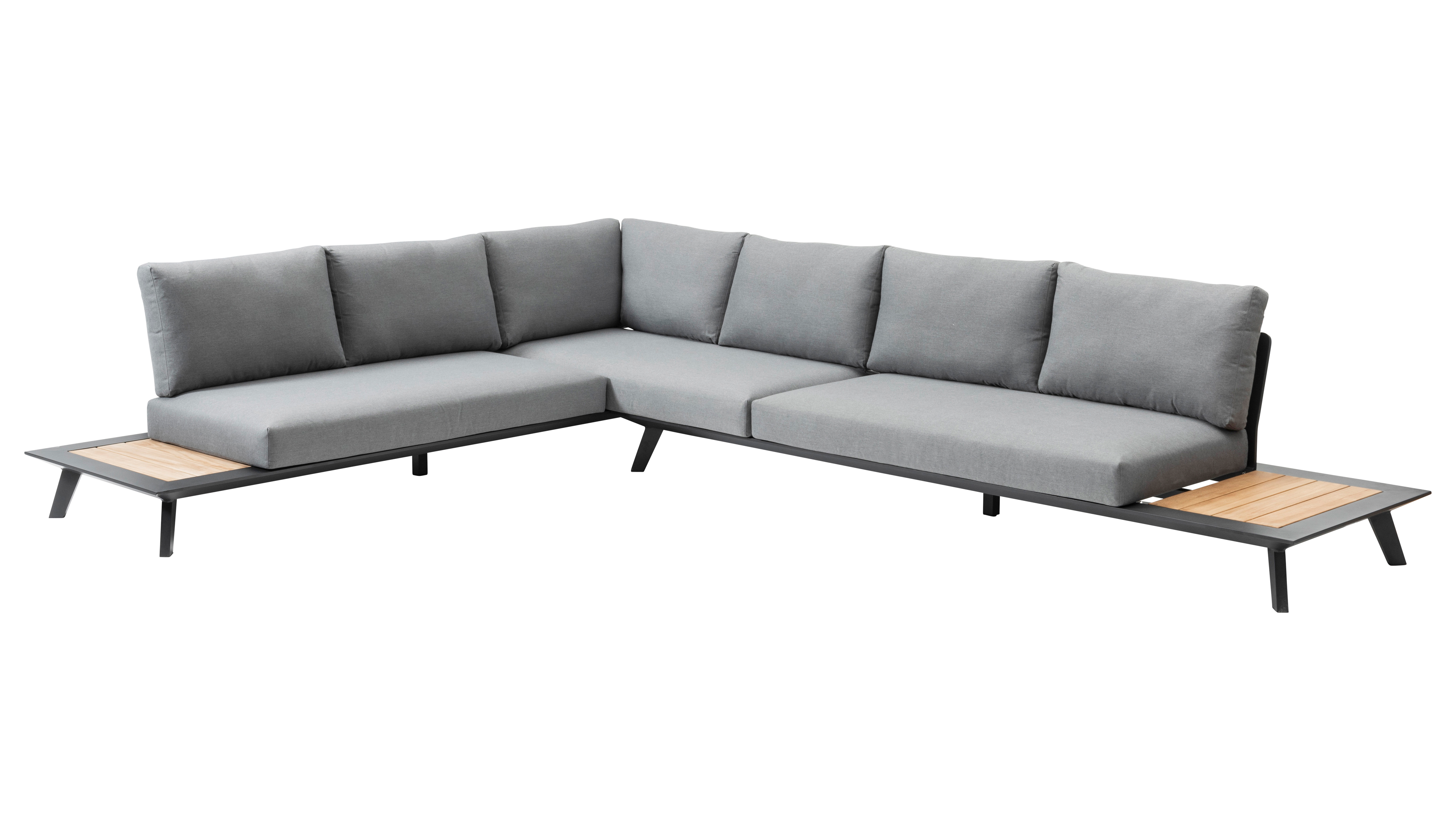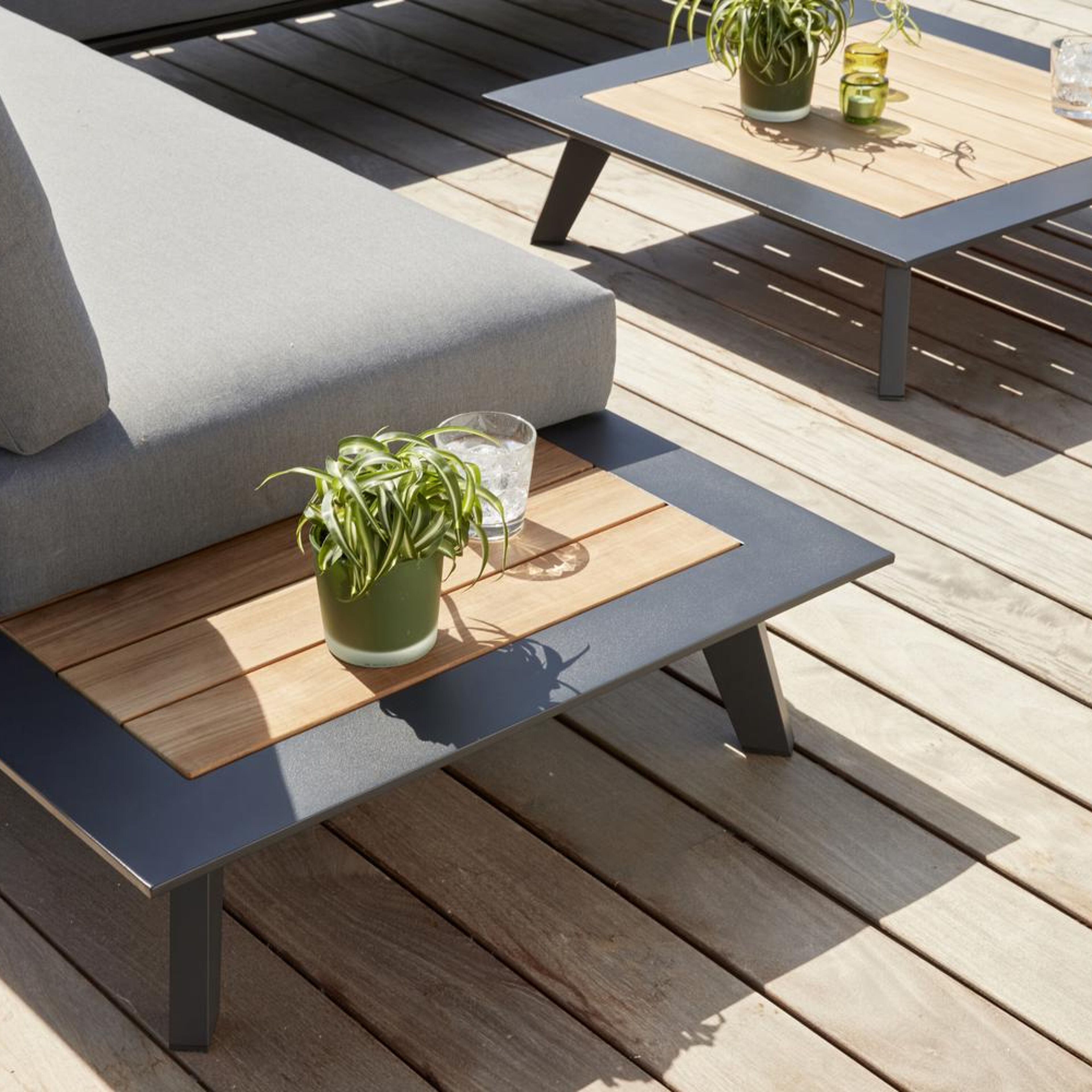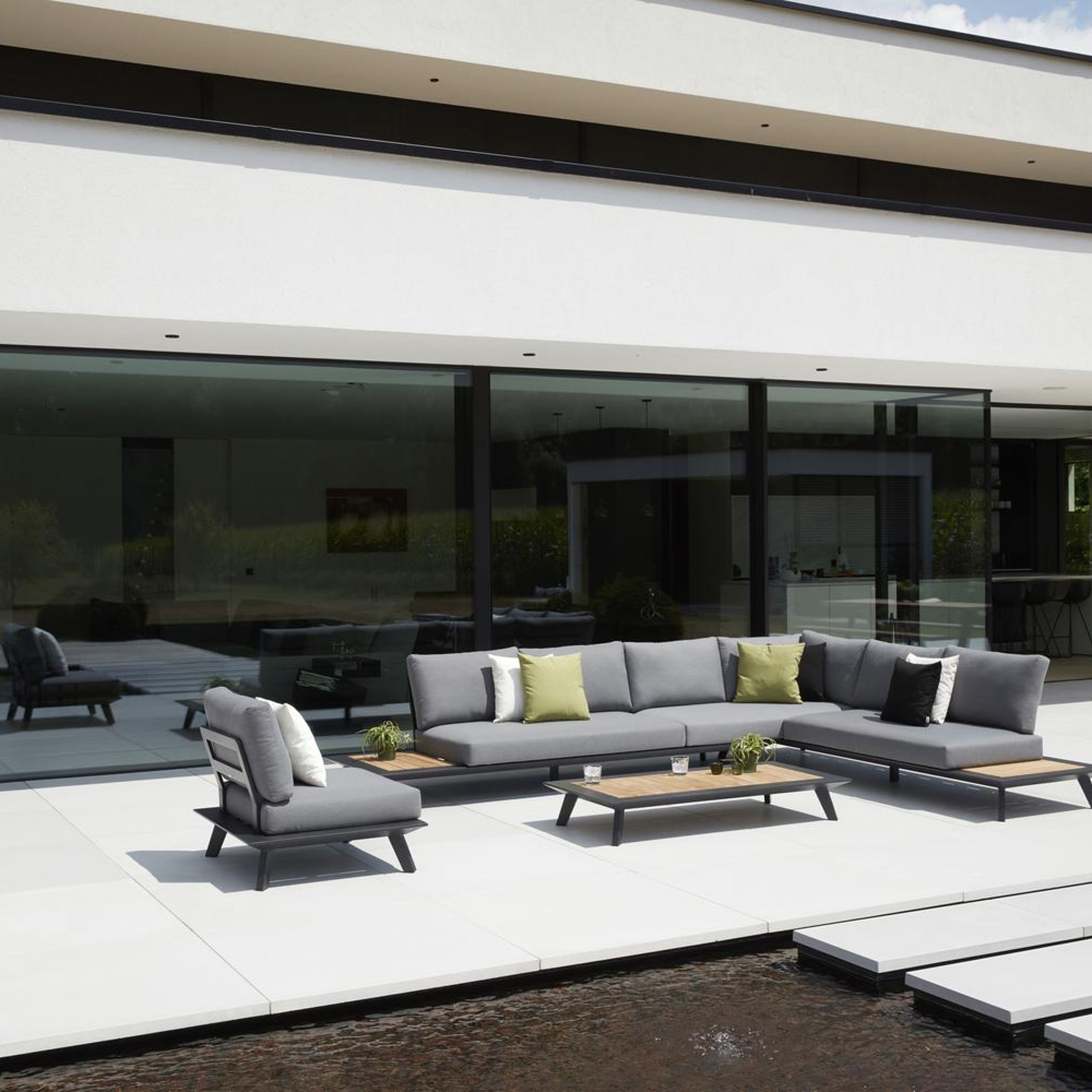 Het frame van de lounge is gemaakt uit roestvrij aluminium, een sterk, maar toch licht materiaal dat makkelijk verplaatsbaar is. Het oppervlak is glad afgewerkt waardoor het geen vuil aantrekt en onderhoudsvriendelijk is. De poedercoating zorgt voor de UV- en weersbestendigheid van je meubel.De zijtafels uit teak staan gelijk aan een bijzondere kwaliteit en een natuurlijk design. Teak is een kwalitatieve houtsoort gekenmerkt door zijn hardheid. Aangezien hout een 'levend materiaal' is, kan de structuur of kleur licht anders zijn.