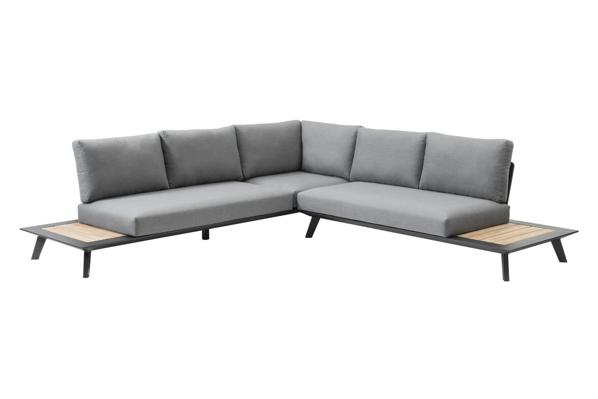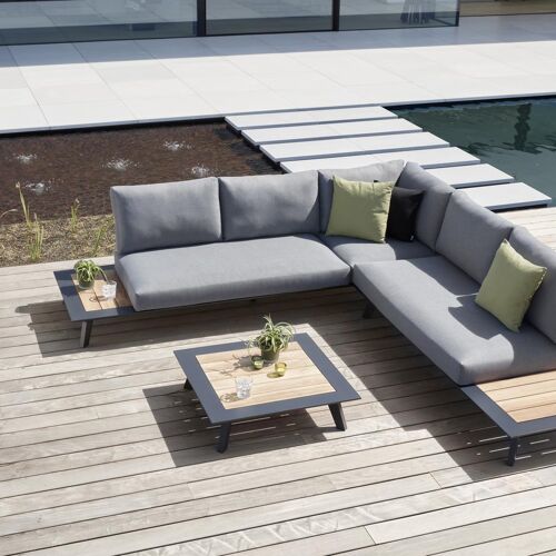 Het frame van de lounge is gemaakt uit roestvrij aluminium, een sterk, maar toch licht materiaal dat makkelijk verplaatsbaar is. Het oppervlak is glad afgewerkt waardoor het geen vuil aantrekt en onderhoudsvriendelijk is. De poedercoating zorgt voor de UV- en weersbestendigheid van je meubel.De zijtafels uit teak staan gelijk aan een bijzondere kwaliteit en een natuurlijk design. Teak is een kwalitatieve houtsoort gekenmerkt door zijn hardheid. Aangezien hout een 'levend materiaal' is, kan de structuur of kleur licht anders zijn.