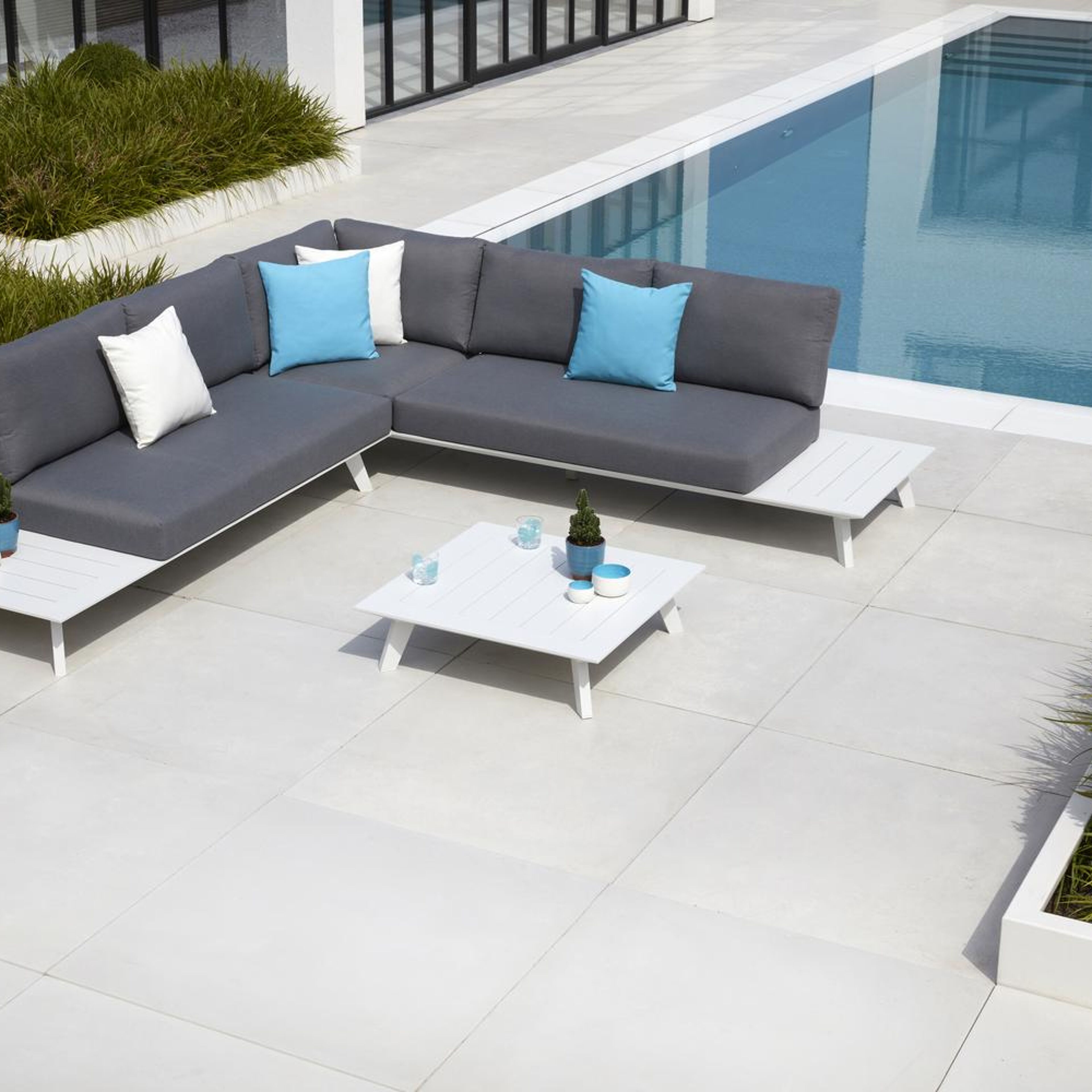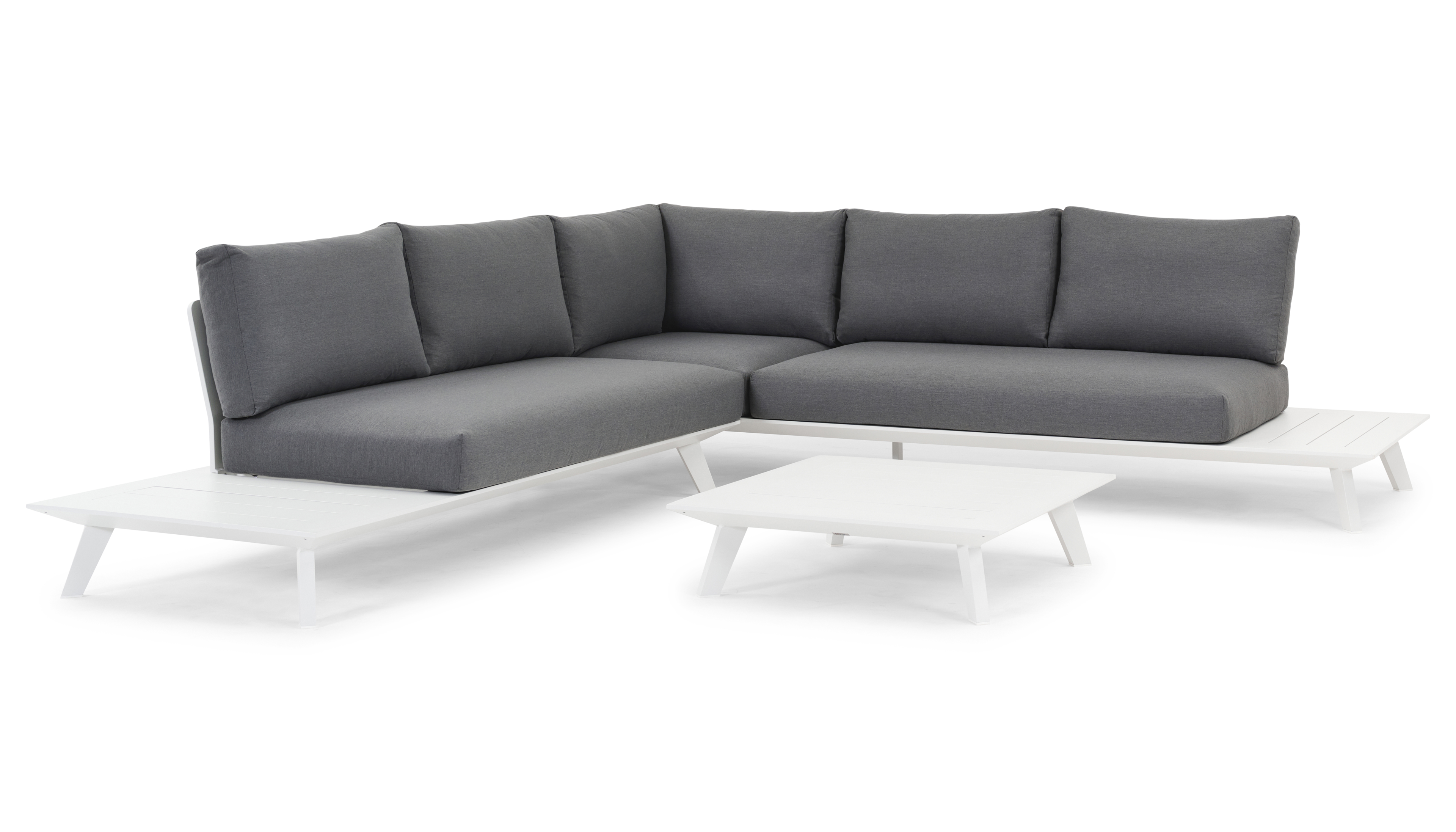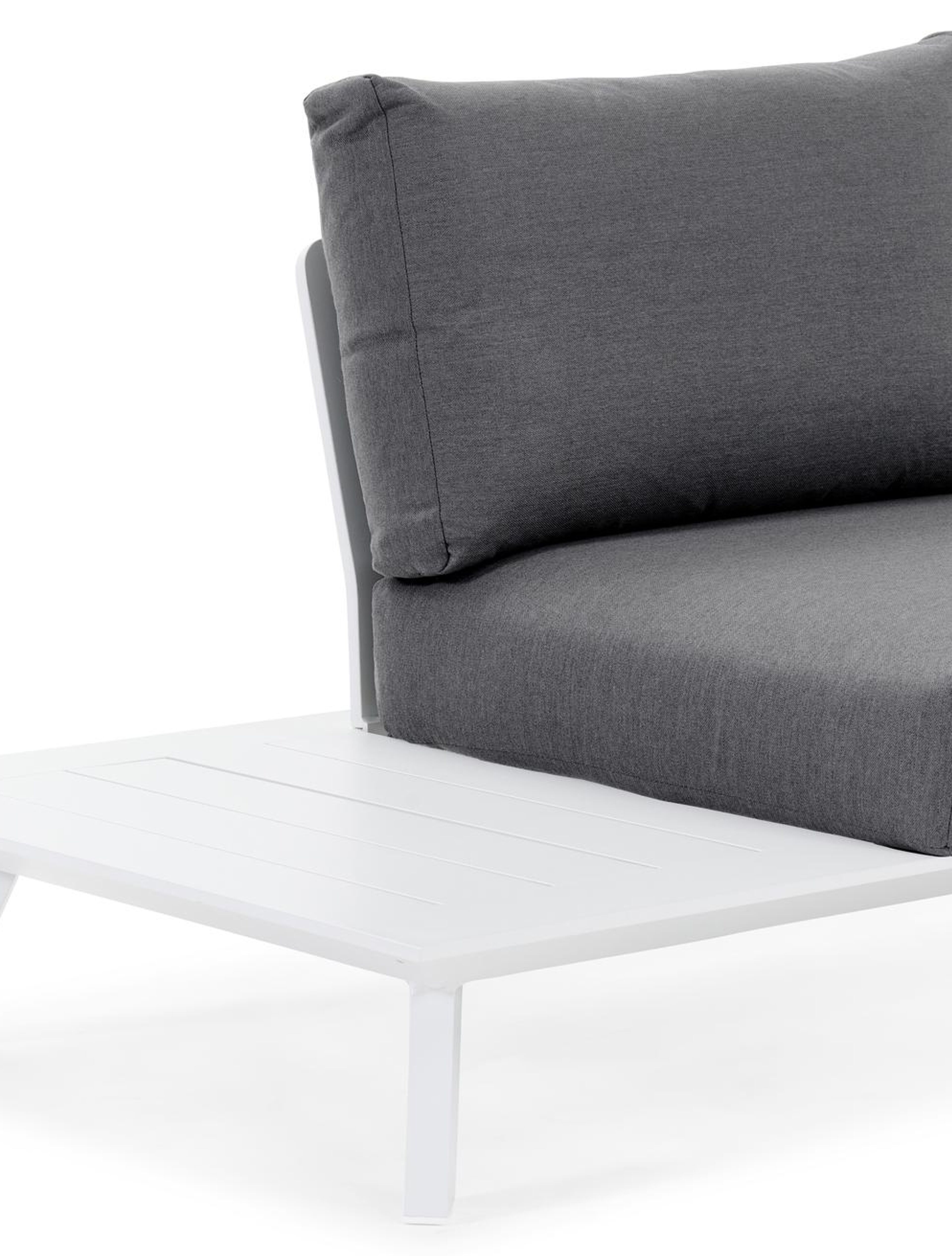 De loungetafel is inbegrepen en volledig gemaakt uit roestvrij aluminium.