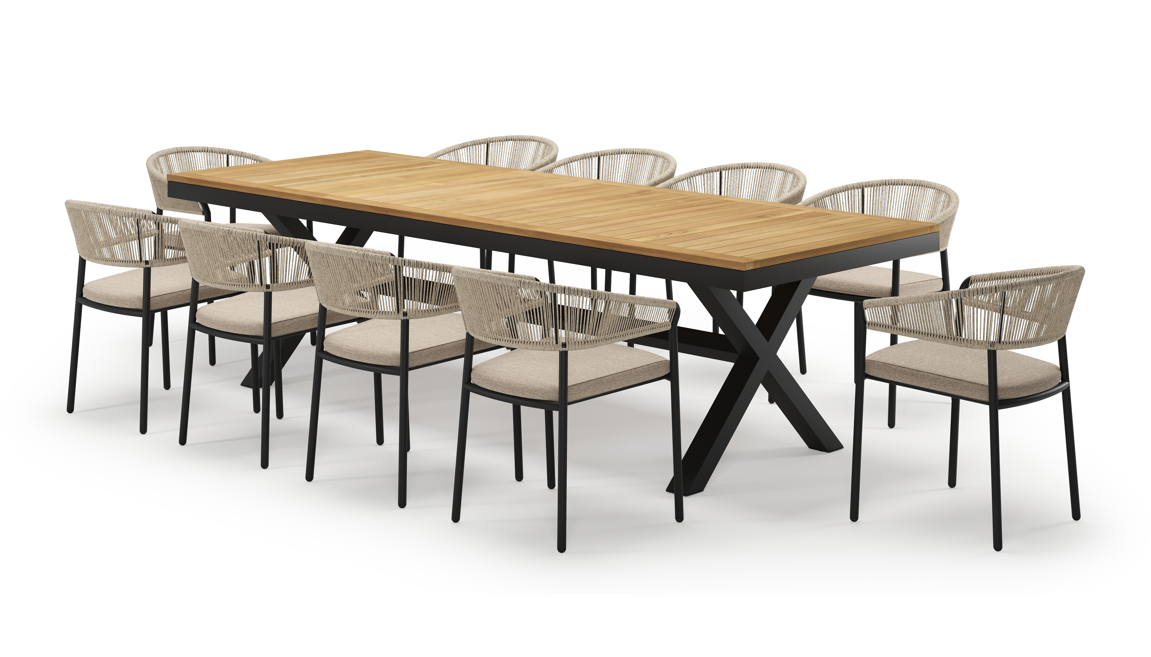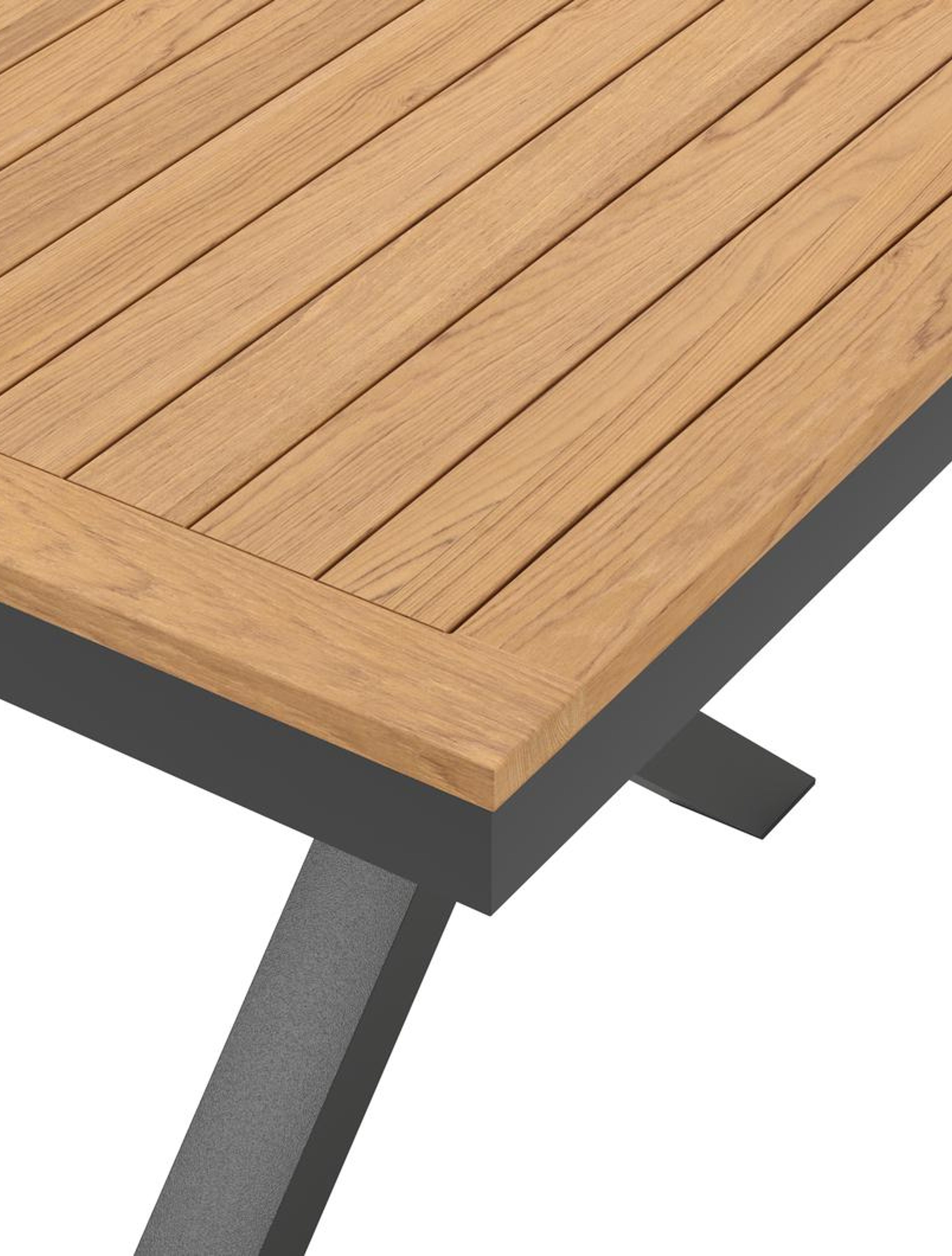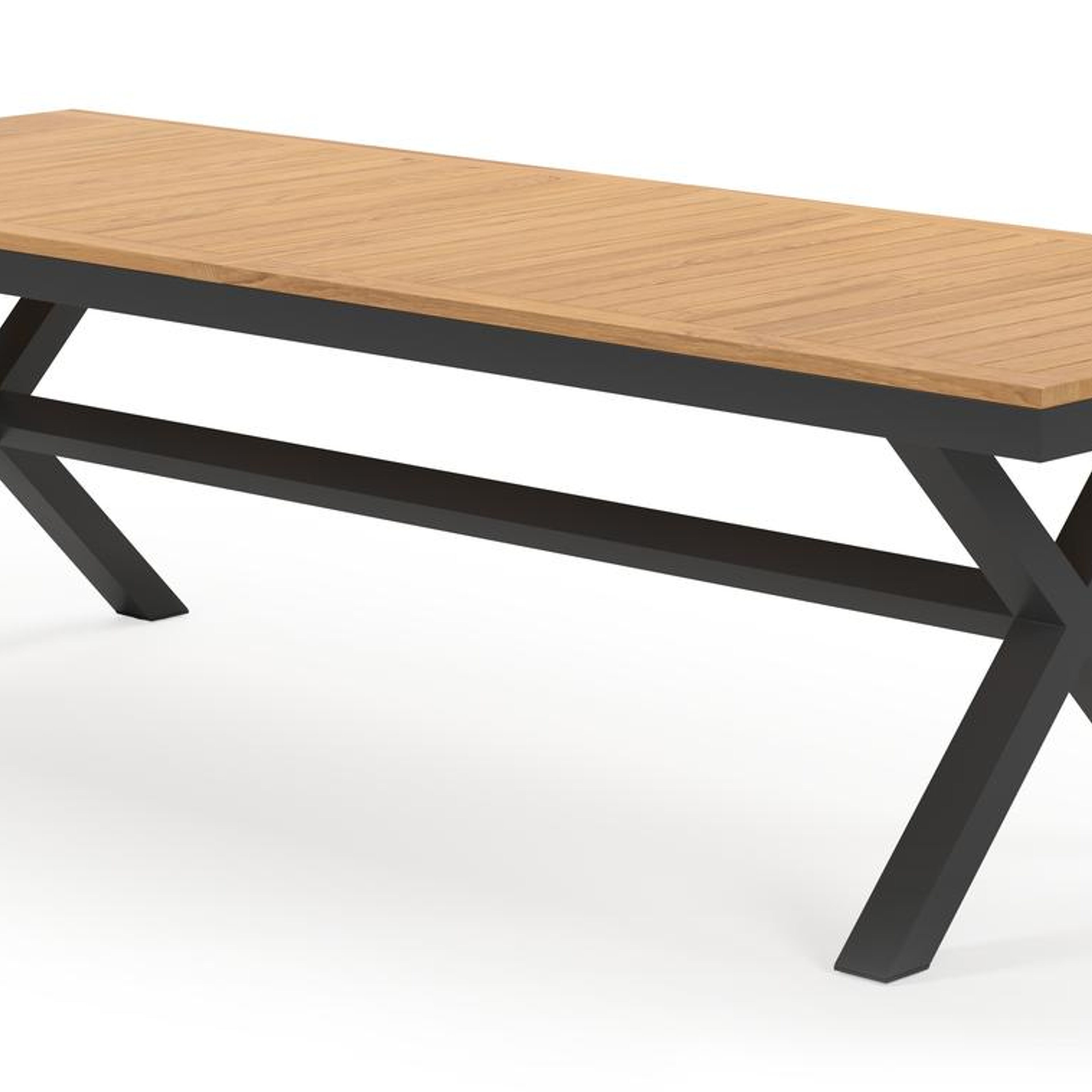 De Reza tuinset heeft een uitzonderlijke kruispoot en een stevig, dik frame waarin het tafelblad geplaatst is. In het midden van de tafel loopt een balk als extra ondersteuning van het frame.