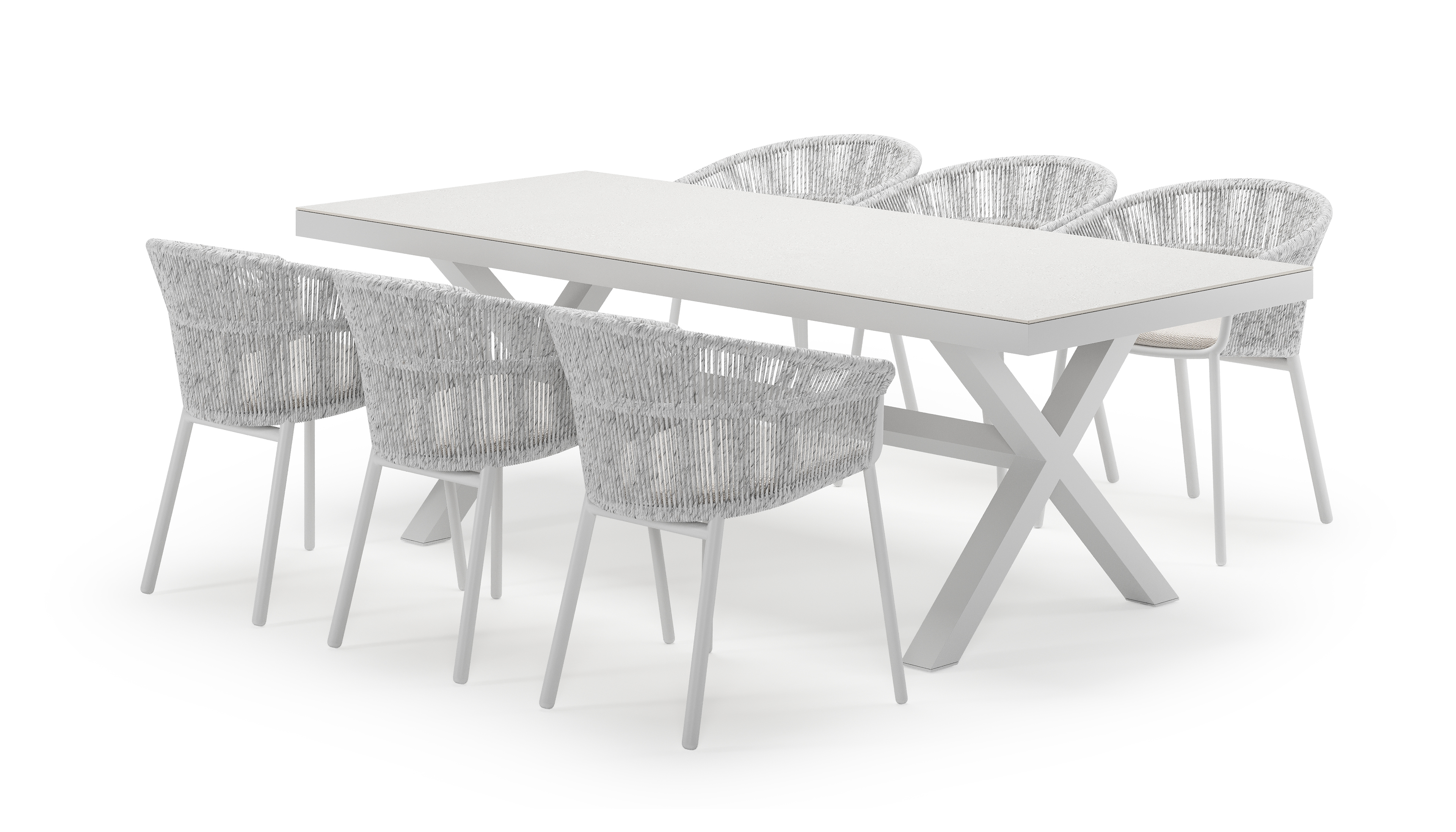 De Reza tuinset heeft een uitzonderlijke kruispoot en een stevig, dik frame waarin het tafelblad geplaatst is. In het midden van de tafel loopt een balk als extra ondersteuning van het frame.