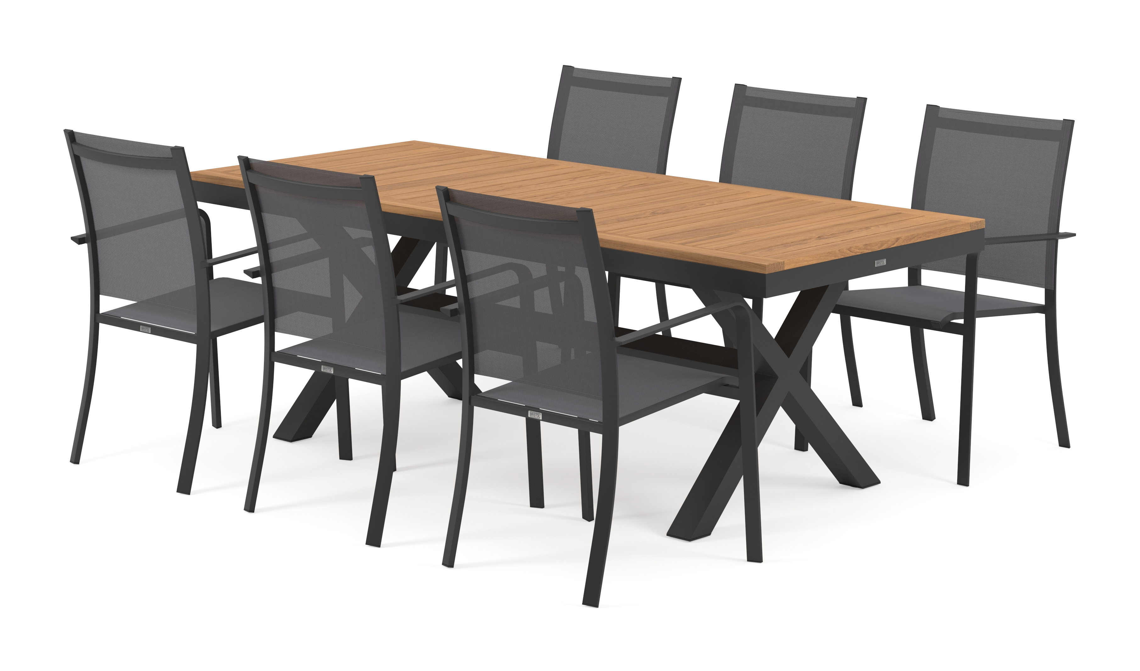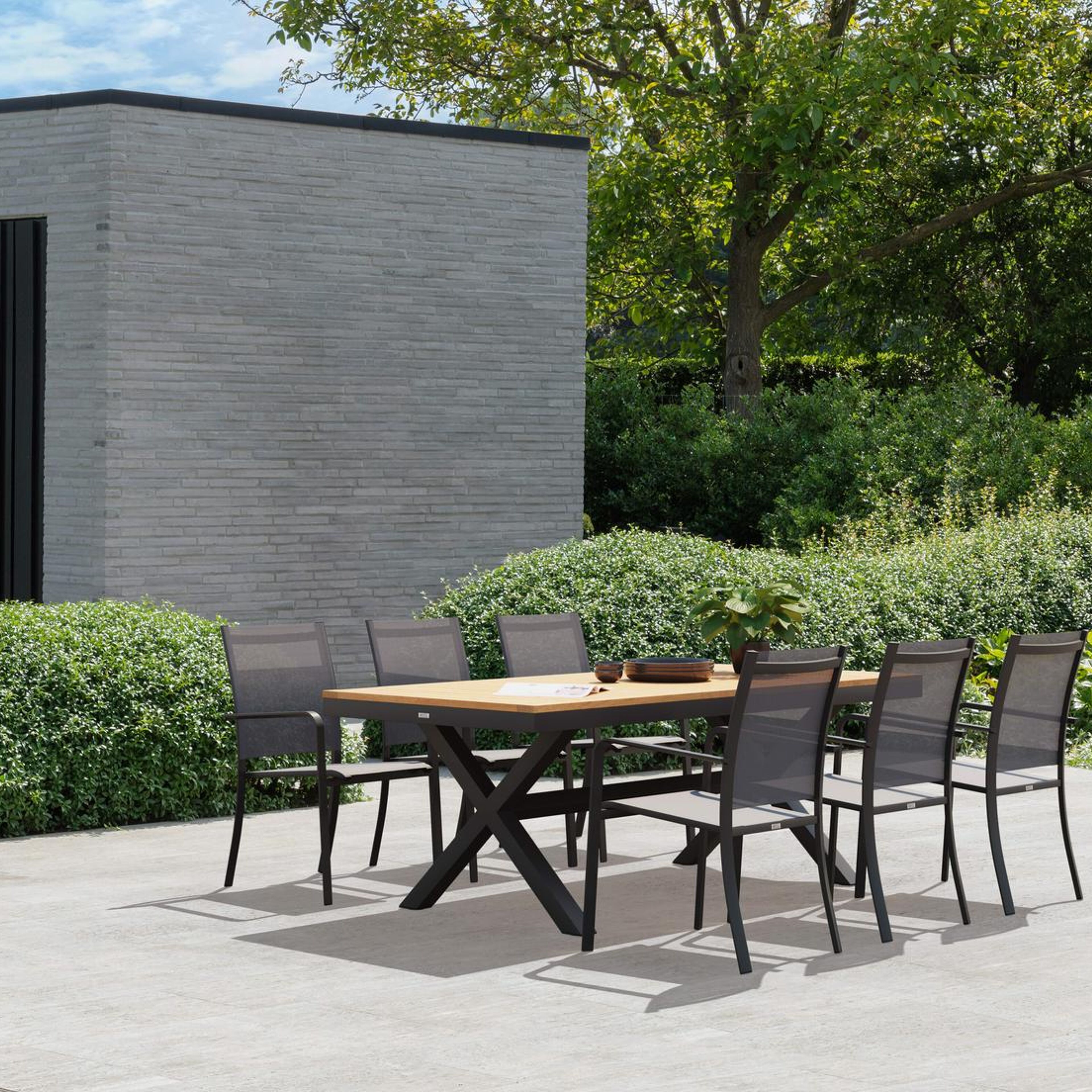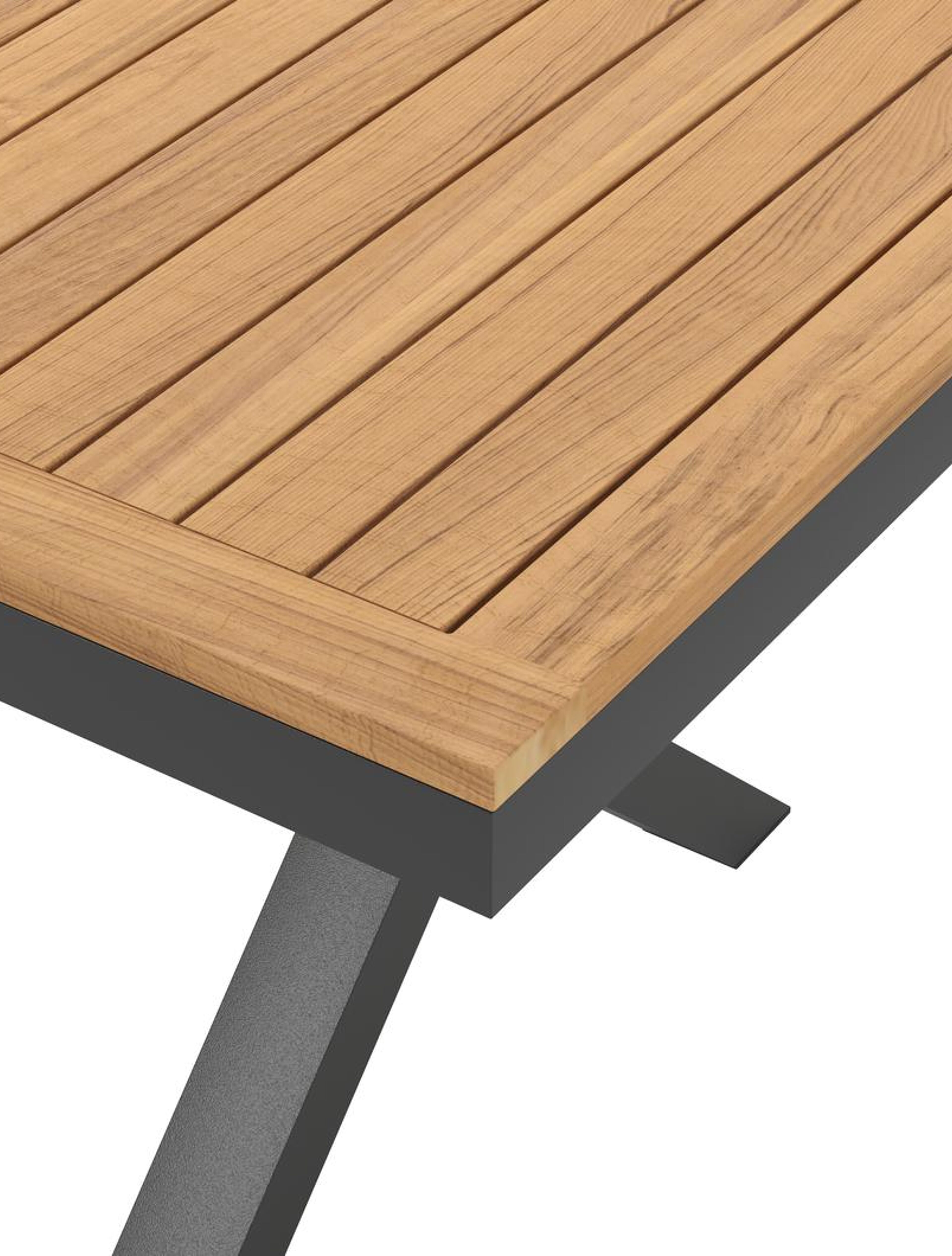 Reza tuinset heeft een uitzonderlijke kruispoot en een stevig, dik frame waarin het tafelblad geplaatst is. In het midden van de tafel loopt een balk als extra ondersteuning van het frame.
