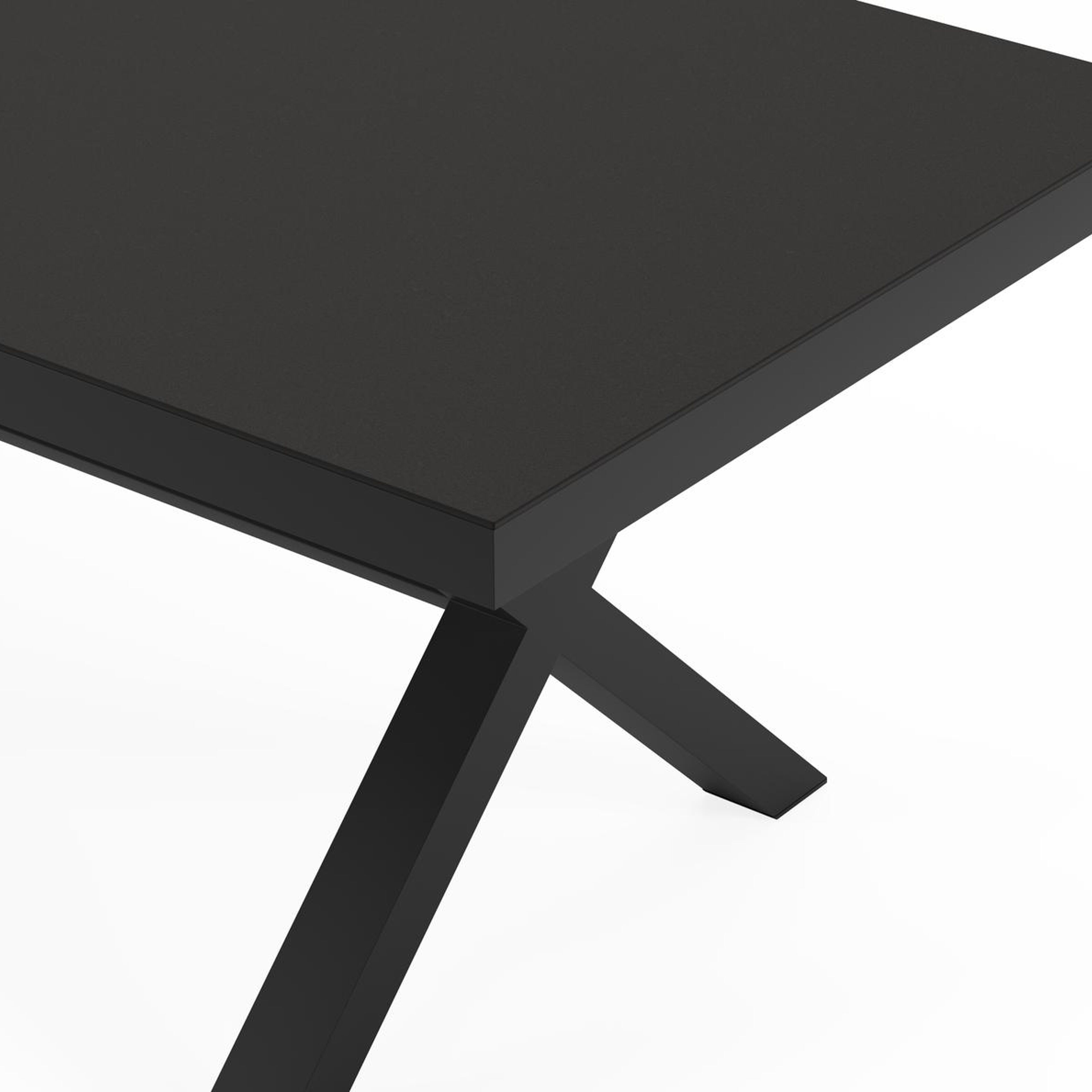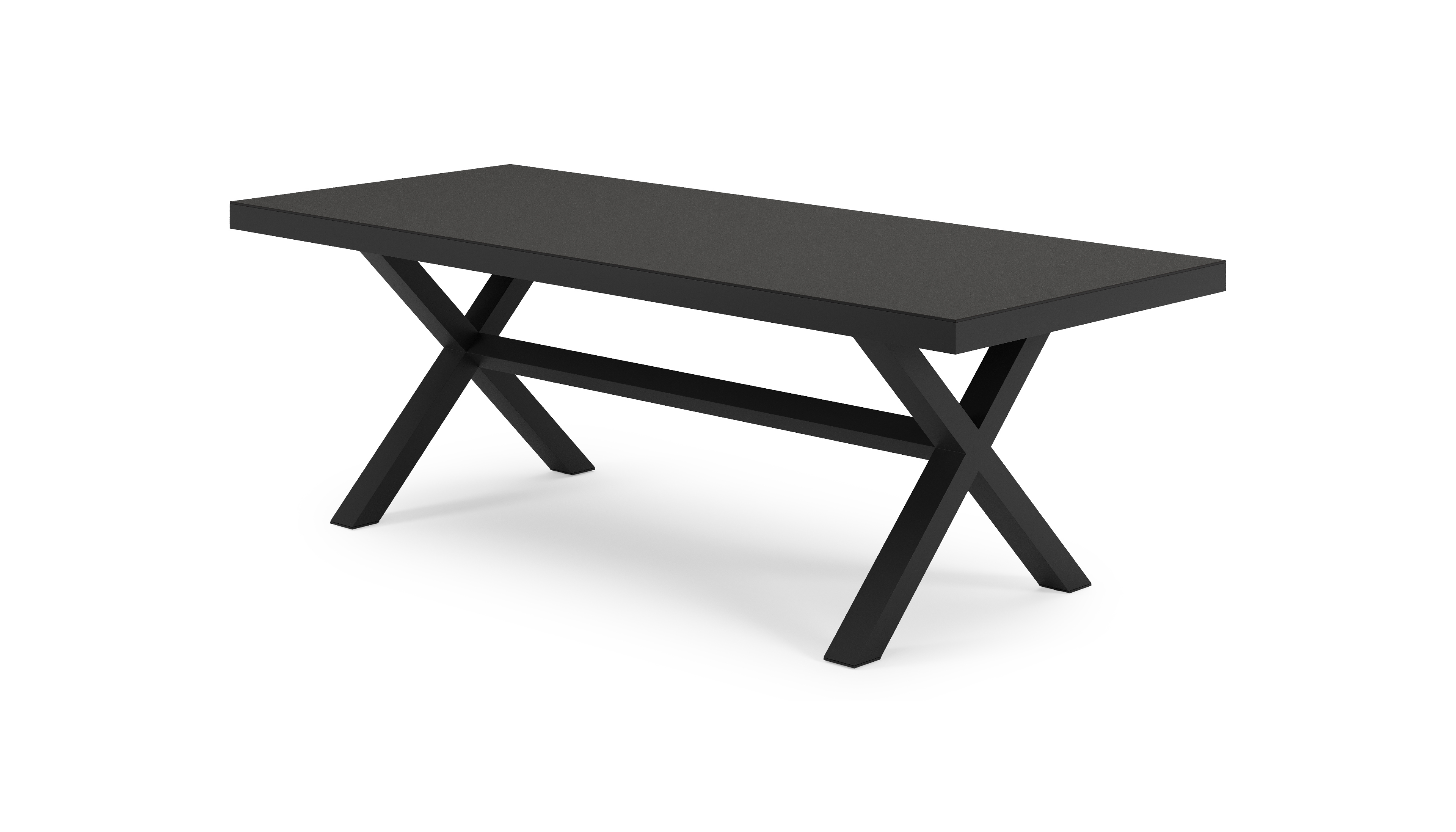 De Reza tuintafel heeft een uitzonderlijke kruispoot en een stevig, dik frame waarin het tafelblad geplaatst is. In het midden van de tafel loopt een balk als extra ondersteuning van het frame.