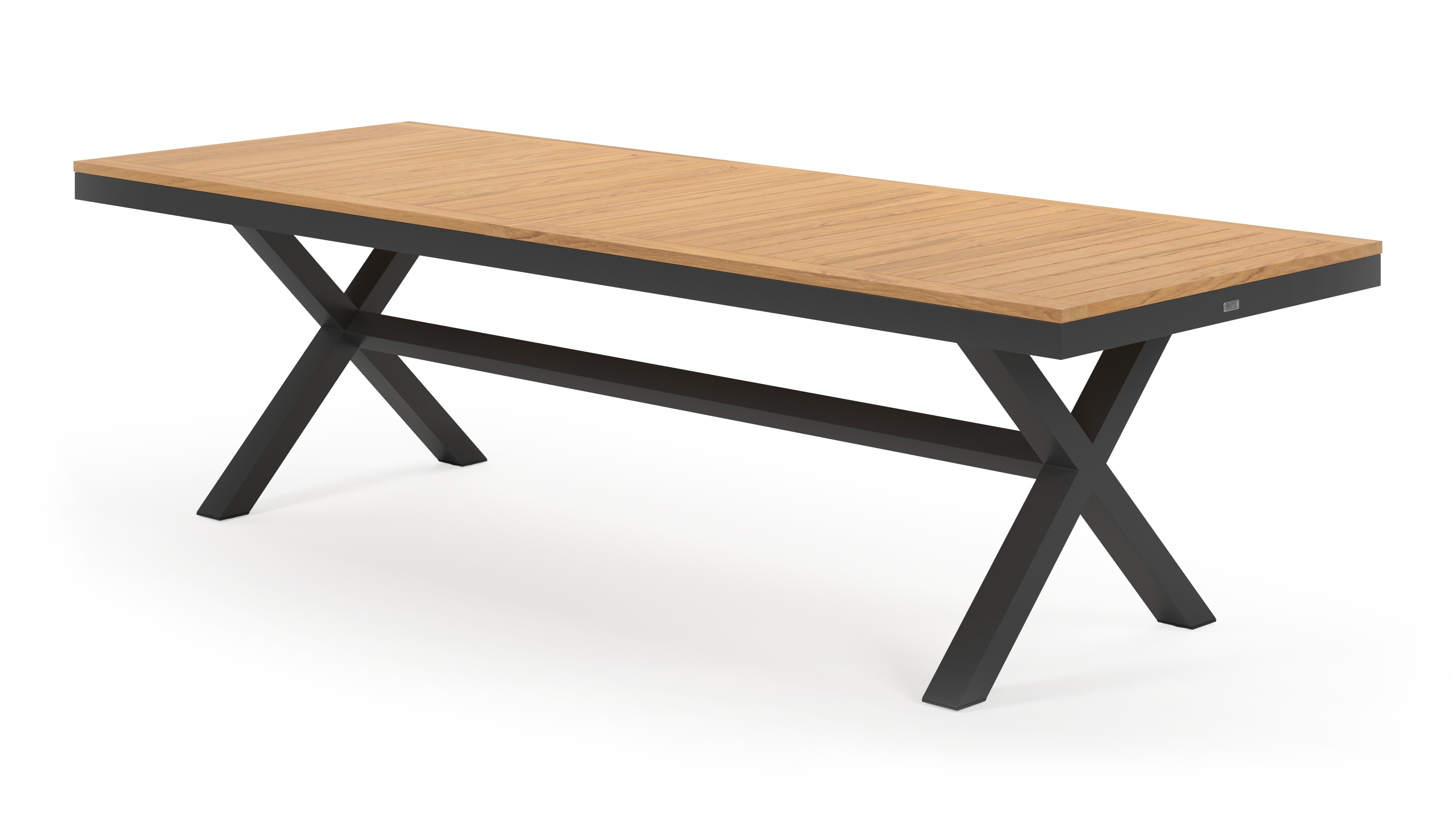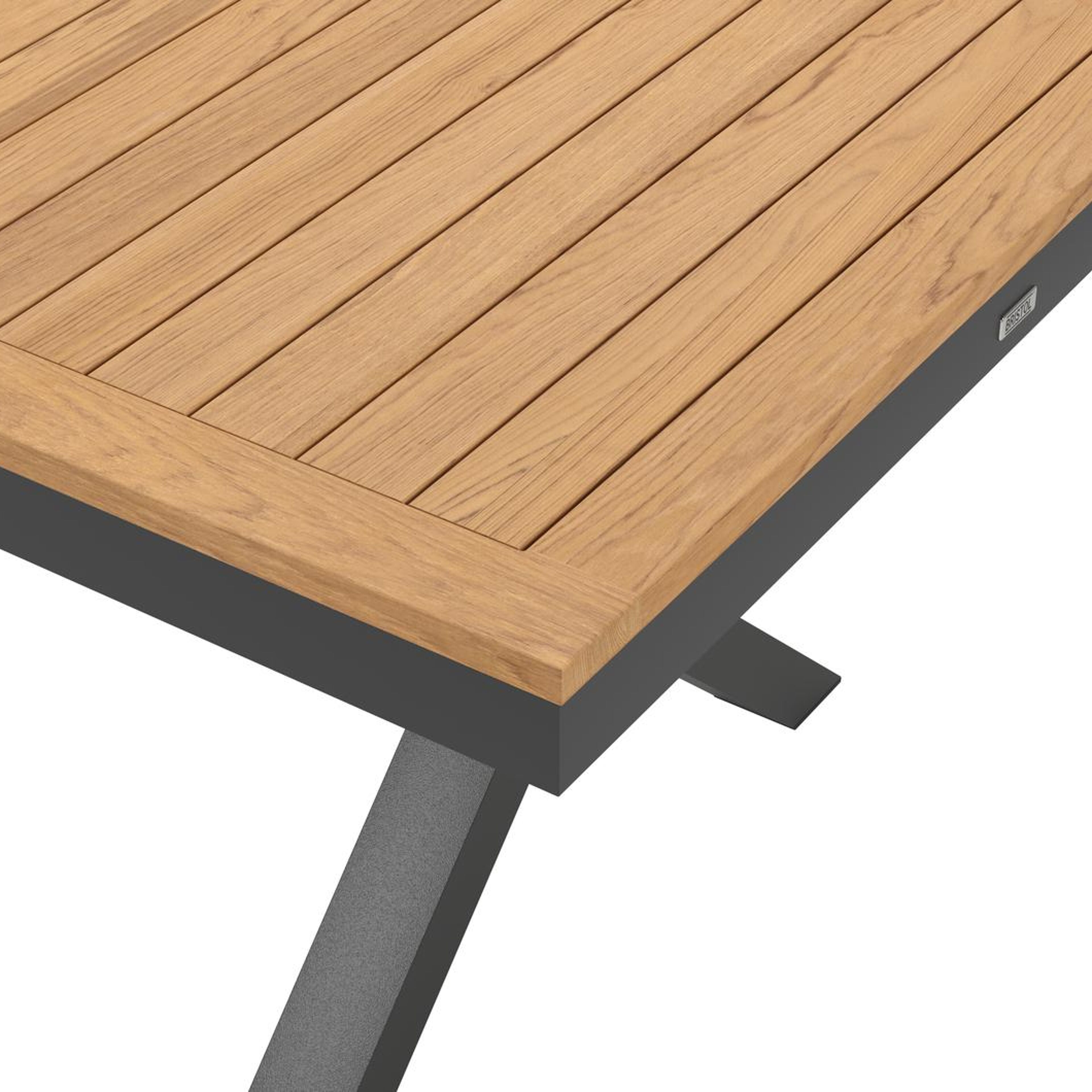 De Reza tuintafel heeft een uitzonderlijke kruispoot en een stevig, dik frame waarin het tafelblad geplaatst is. In het midden van de tafel loopt een balk als extra ondersteuning van het frame.