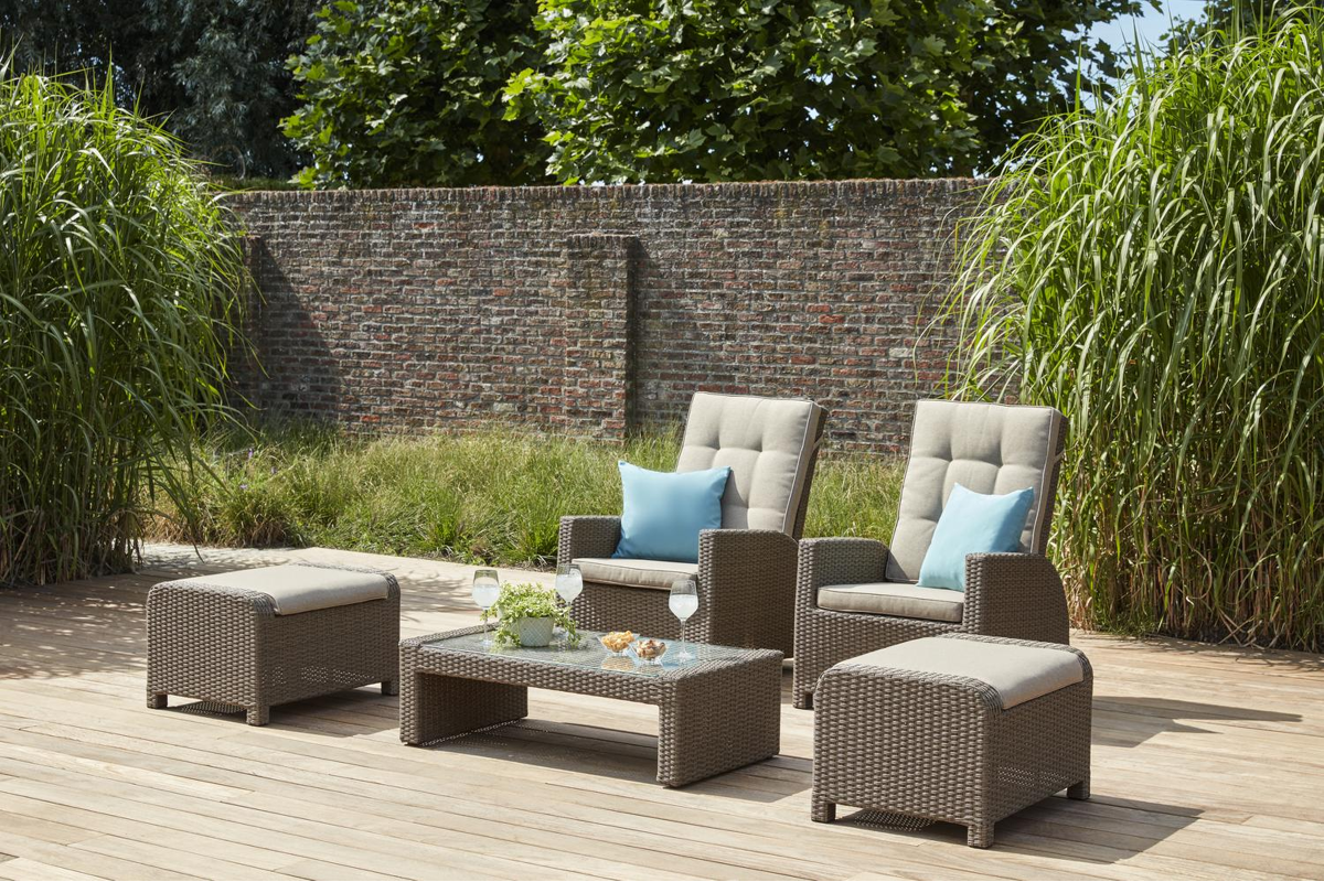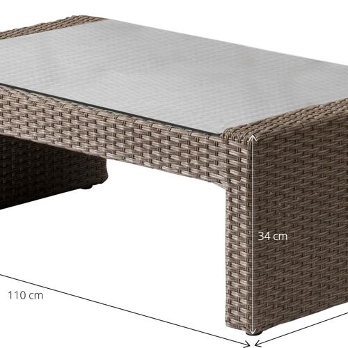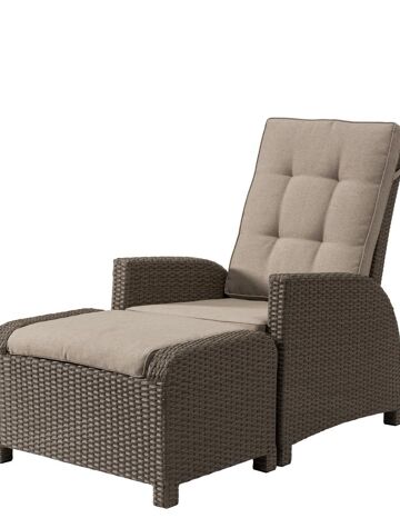 Comfortabele loungeset bestaande uit 2 x 1-zit met verstelbare rugleuning en poef in weerbestendige 8mm dubbele vlakke wicker. Kleur: bruin. Inclusief bruine zit-en rugkussens. Afmeting 1-zit: B 73 x D 86 x H 105cm. Afmeting poef: B 74 x D 54 x H 45 cm en 1 x loungetafel L 110 x B 60cm inclusief glazen blad. Sierkussens niet inbegrepen, wel apart verkrijgbaar.