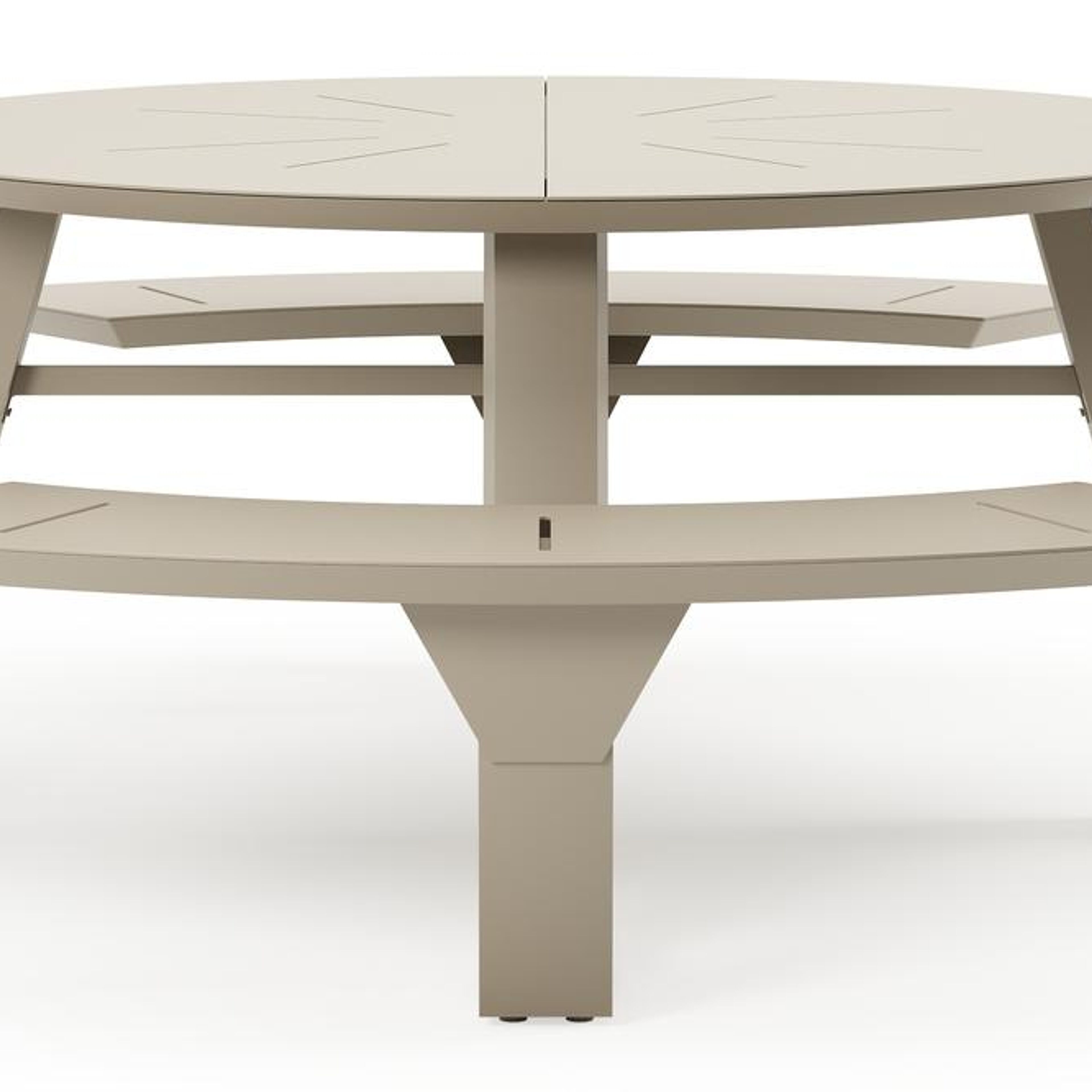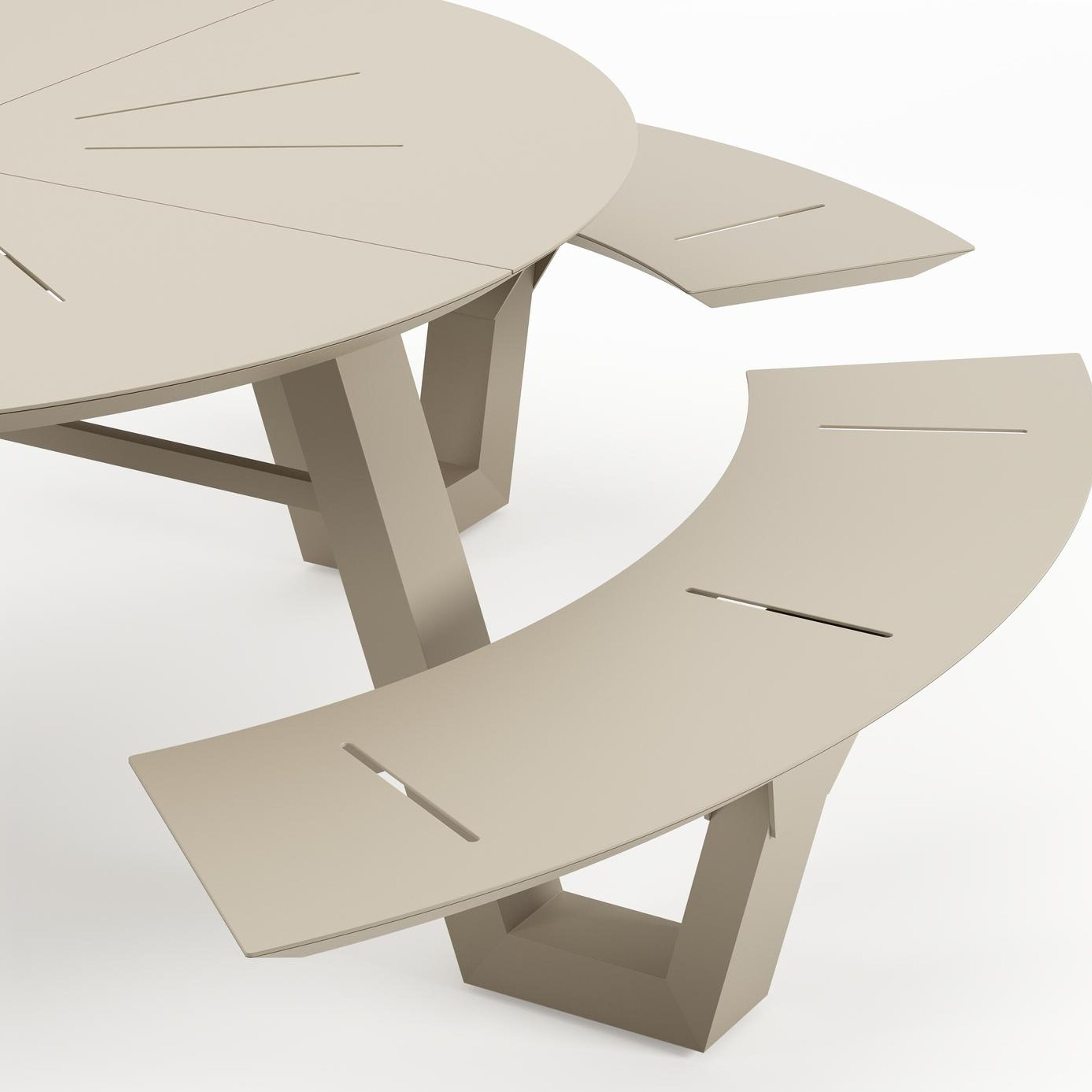 De Rondino picknicktafel omarmt een minimalistisch design met een robuuste look. De langwerpige banken sluiten naadloos aan op het frame van de tafel, waardoor een gestroomlijnde en samenhangende look ontstaat. De ronde vorm zorgt ervoor dat je gezellig met meerdere mensen bij elkaar kan zitten.